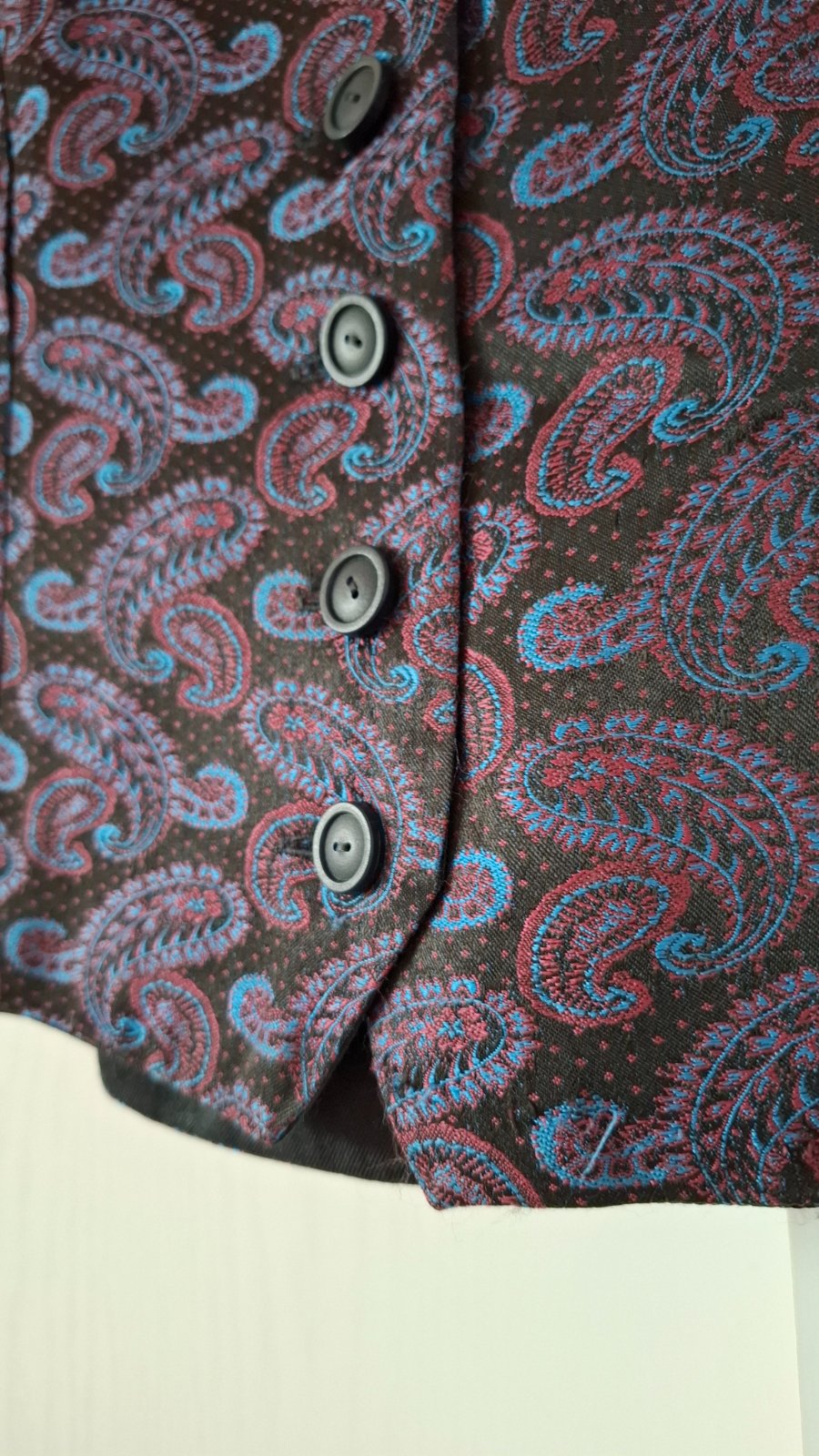 Zaujímavá vesta, originálny kúsok, čierna saténová podšívka, zvonka kašmírový vzor na lesklej kvalitnej látke.