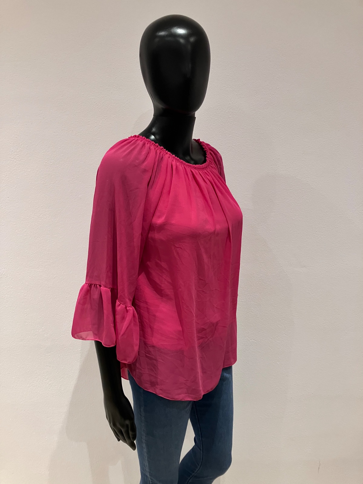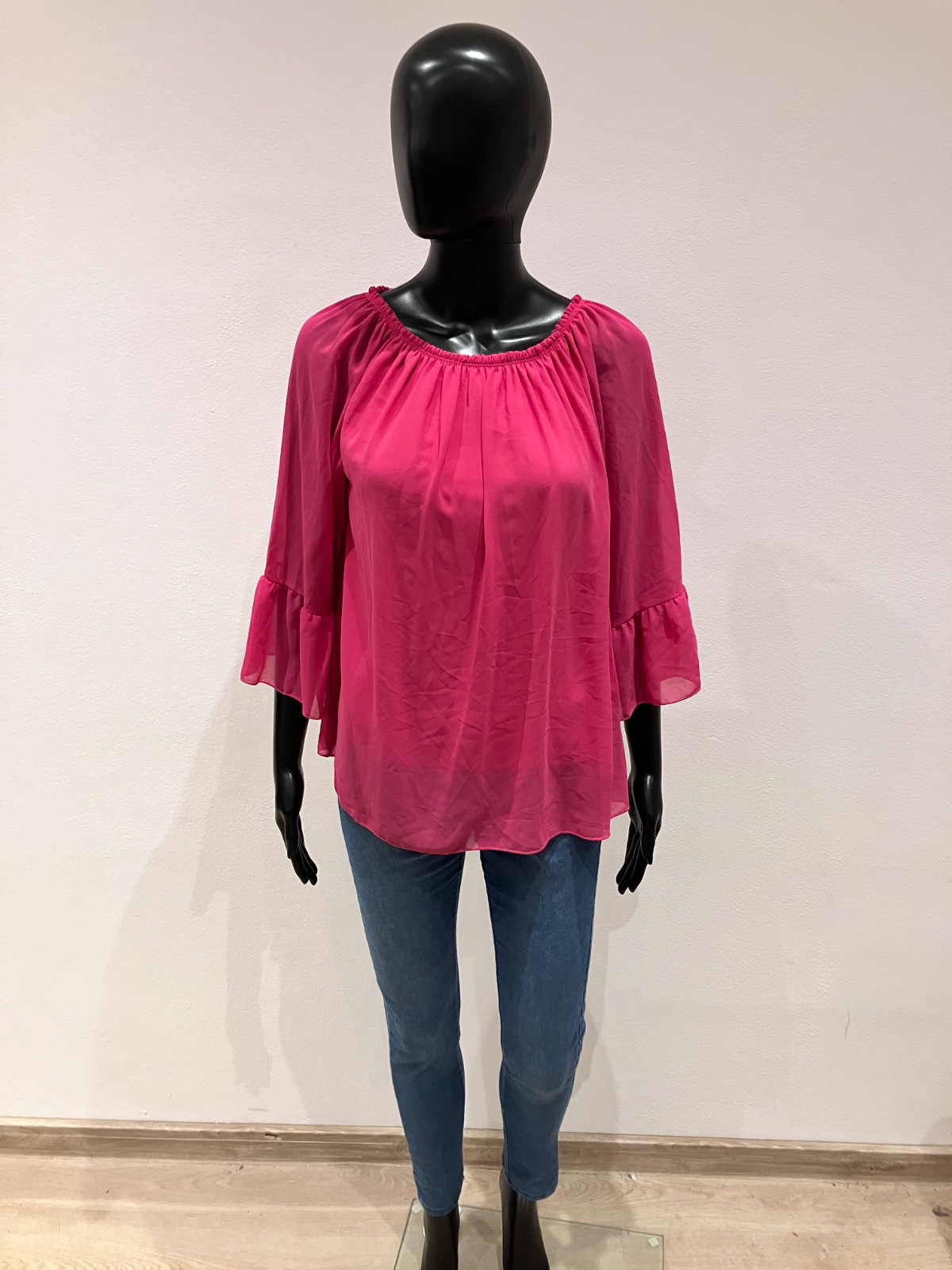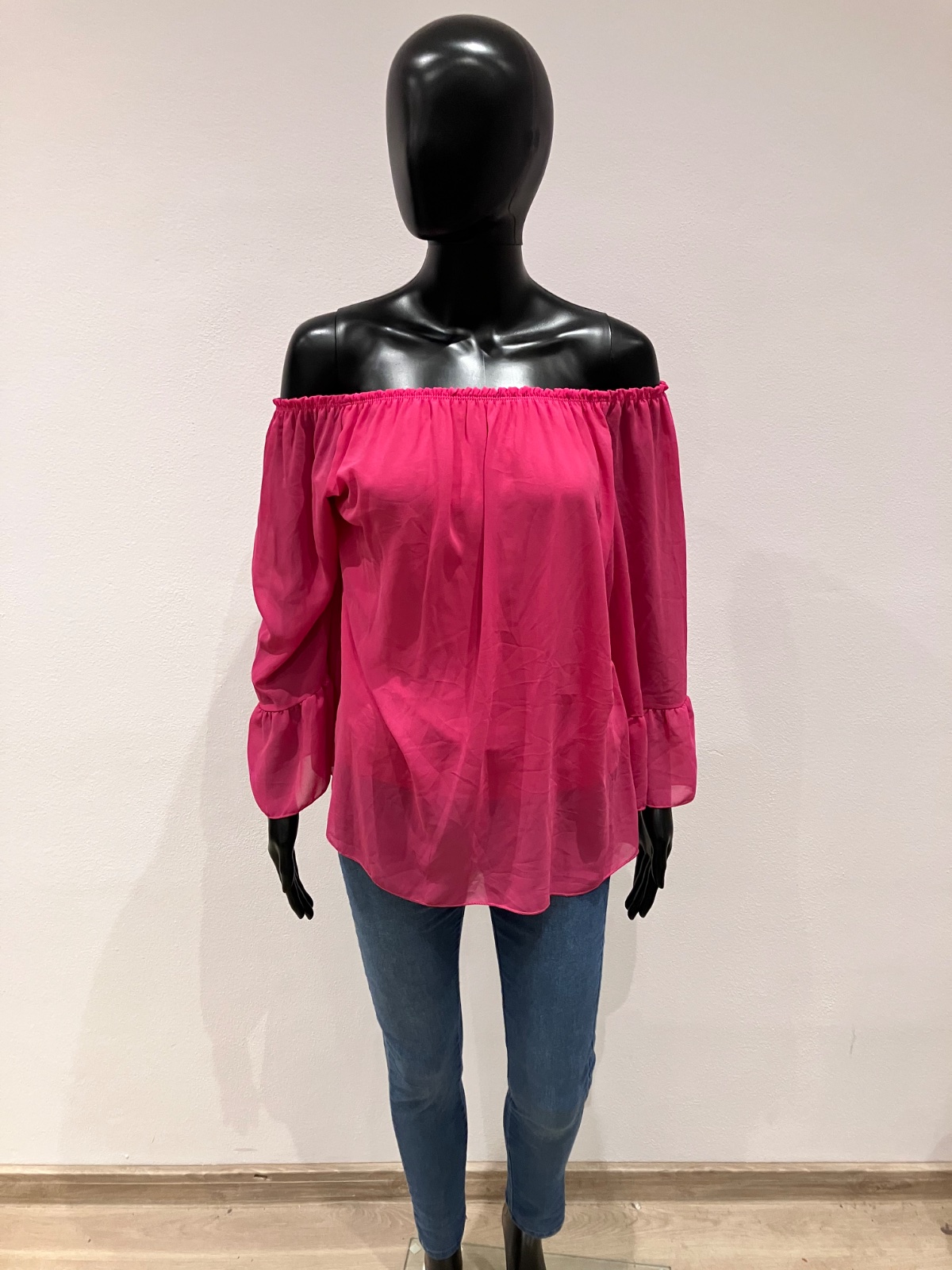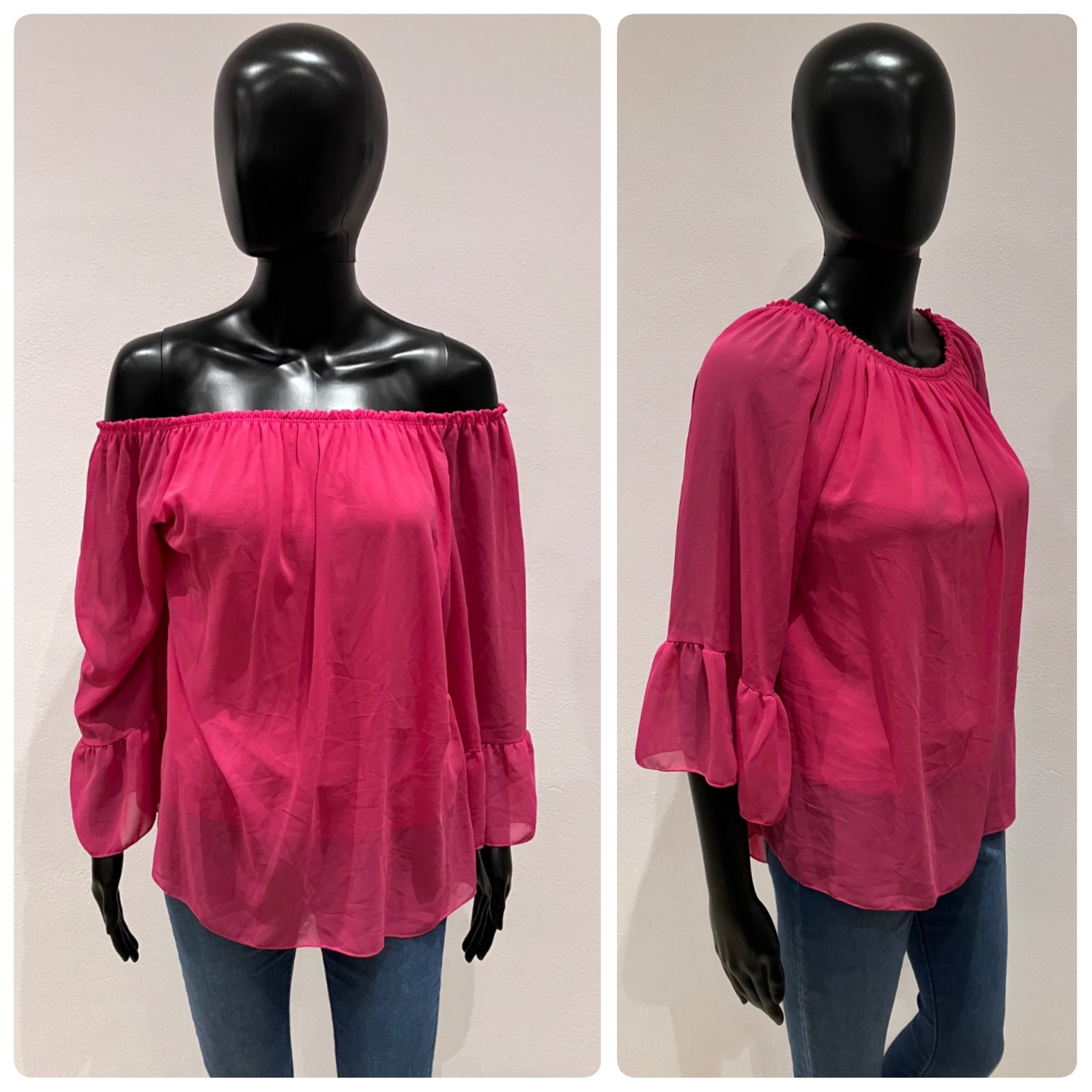Dámska jednofarebná blúzka so zvonovými rukávmi a odhalenými ramenami. Blúzka je podšitá, nie je priesvitná, okrem rukáva, nie je elastická. Veľkosť cca L.