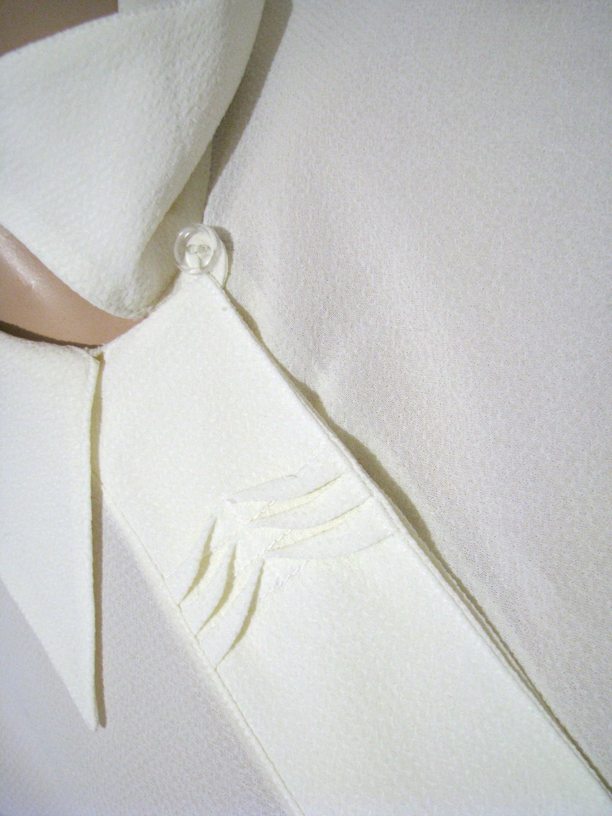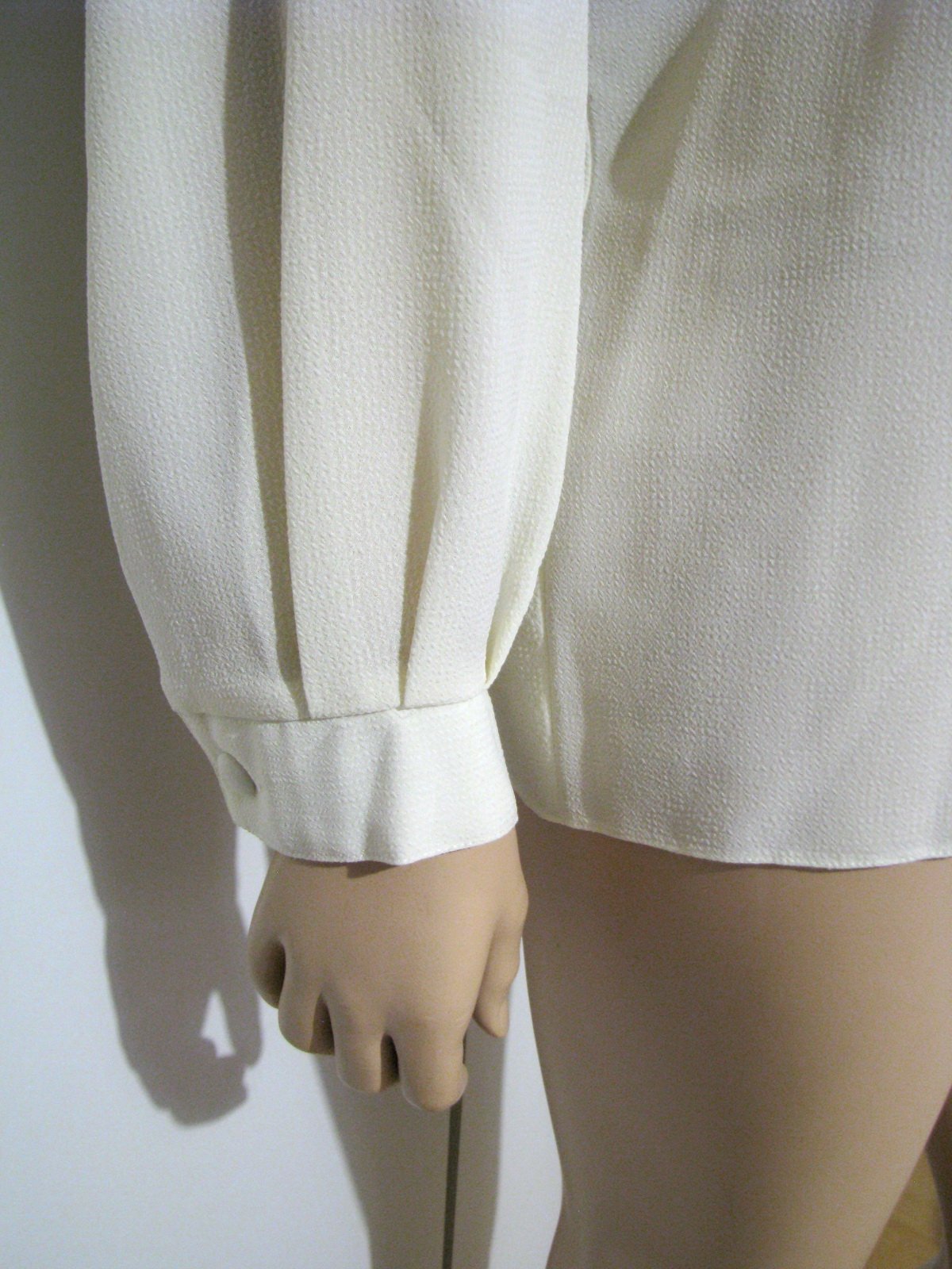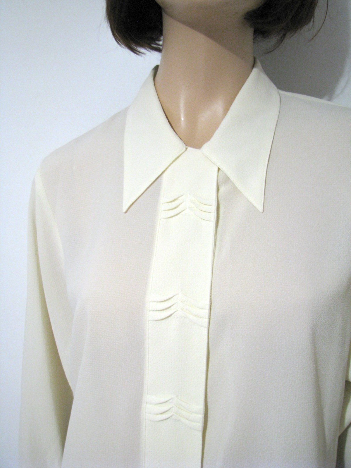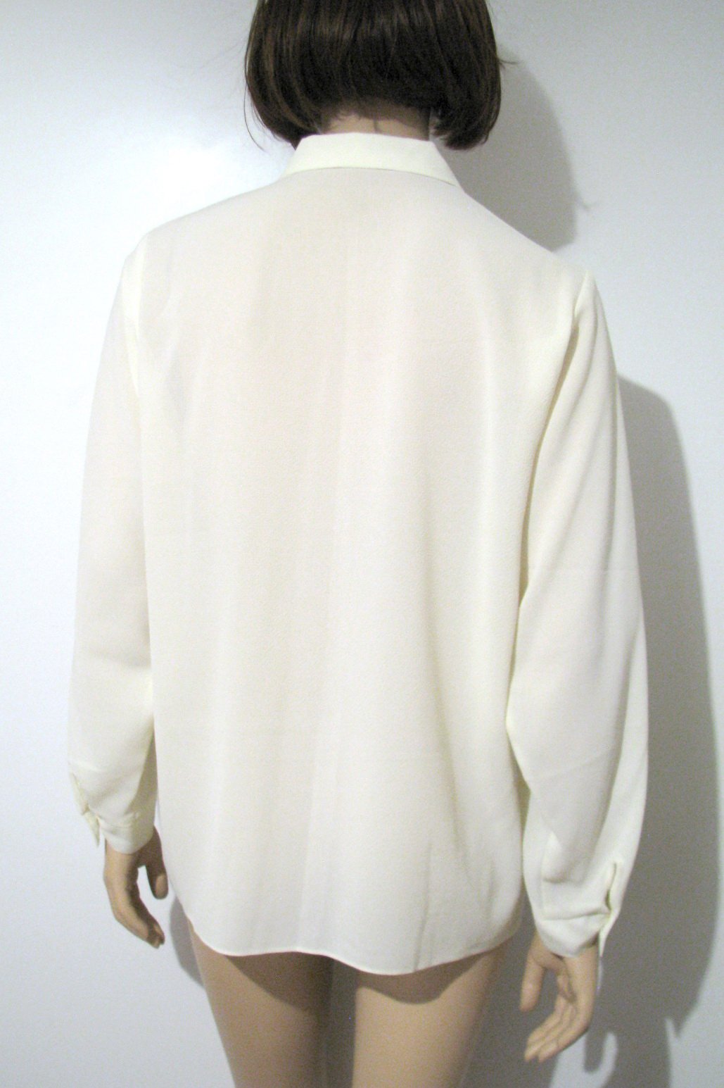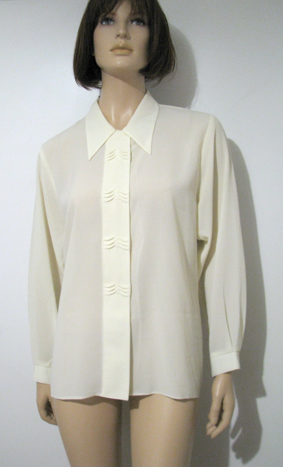 Ľahká šifónová blúzka s dlhými rukávmi, krémovej farby. Na klope zapínania zaujímavo ozdobne riasená. Výborne zachovalá, bez poškodení. Veľkosť len odhadom XL - XXL, v prípade záujmu premeriam.