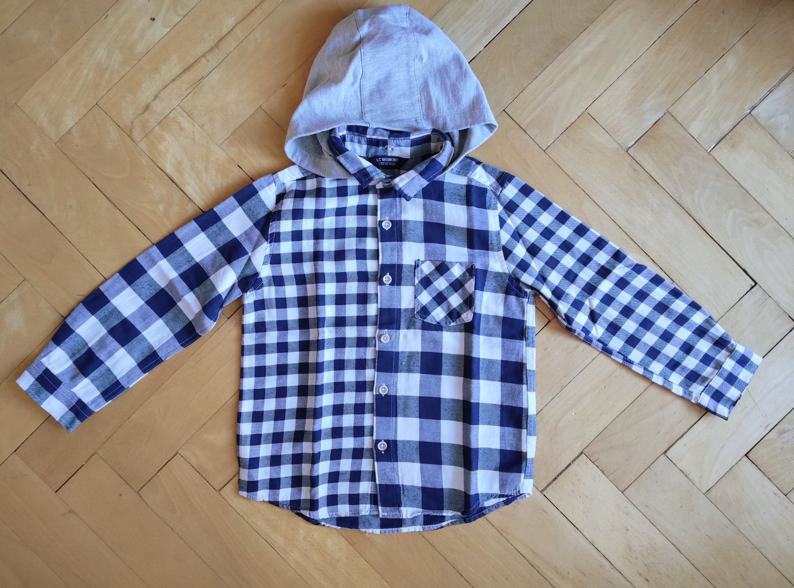 Košeľa vo výbornom stave, bez poškodenia. Kapucňa je odnímateľná. Dĺžka rukáva od ramena 40cm.