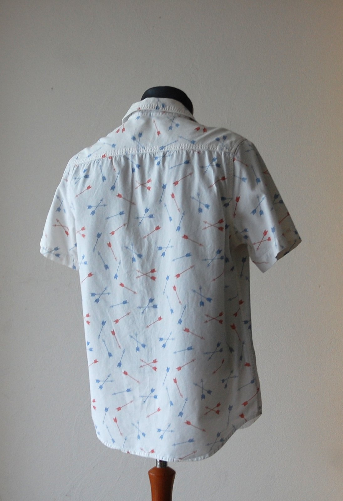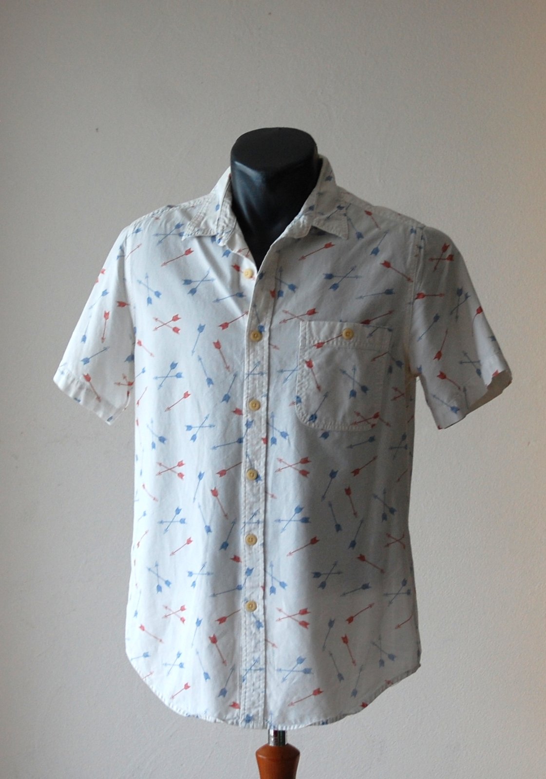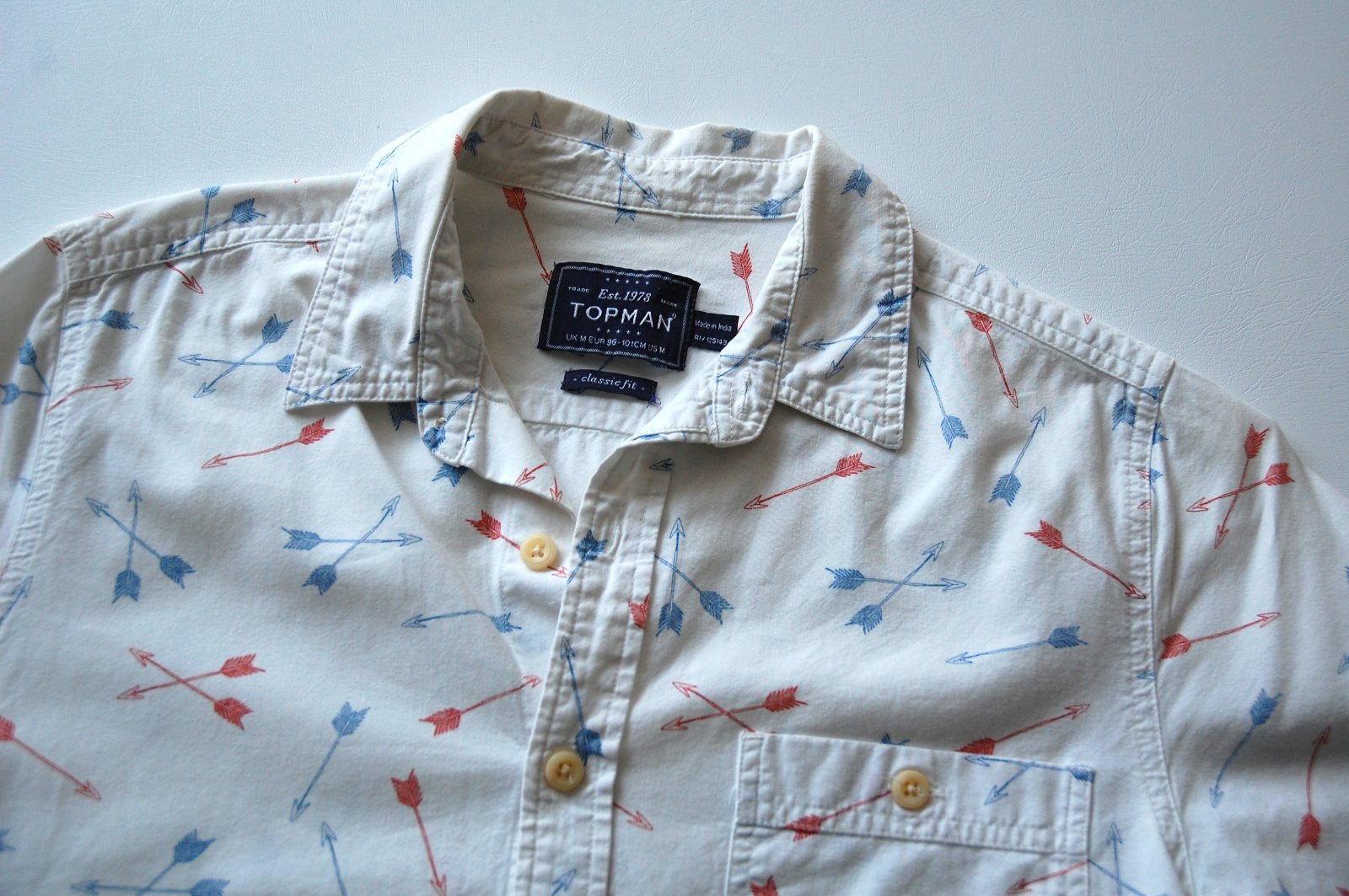 Predám štýlovú pánsku košeľu s krátkym rukávom značky Topman. Košeľa má svetlý podklad s originálnou celoplošnou potlačou prekrížených šípov v červenej a modrej farbe. Ideálna na leto, festivaly alebo bežné nosenie k džínsom či šortkám. Košeľa je vo veľmi zachovalom stave, farby sú jasné. Jedinou chybičkou je mierne „zajedený“ golier z vnútornej strany (zohľadnené v cene), pri nosení to nie je vidieť.