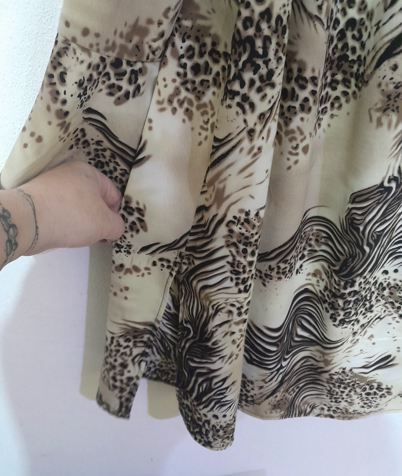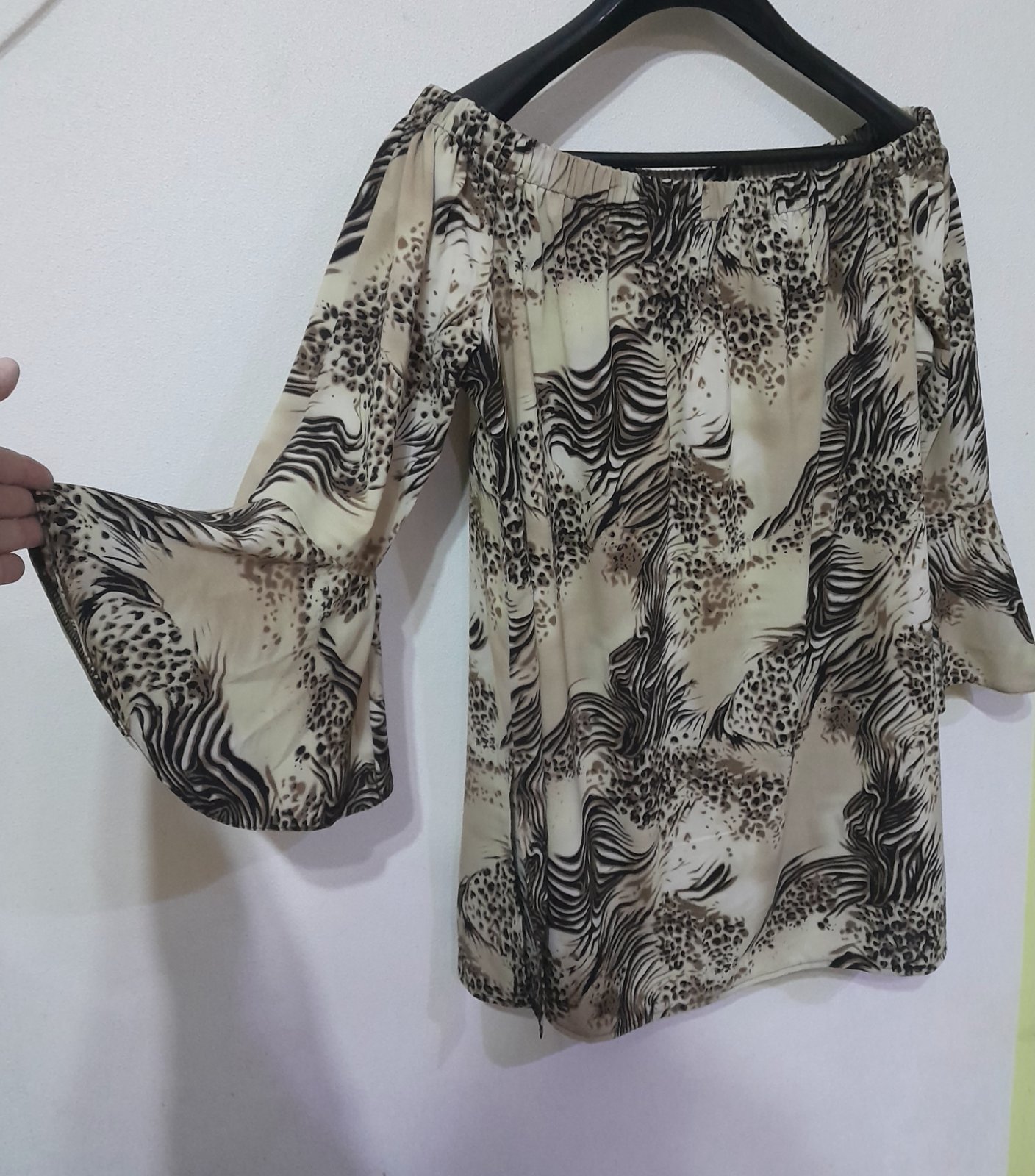 Padavá, voľná blúzka s volánovými rukávmi a rozparkami na bokoch, cez ramená nariasená do gumičky