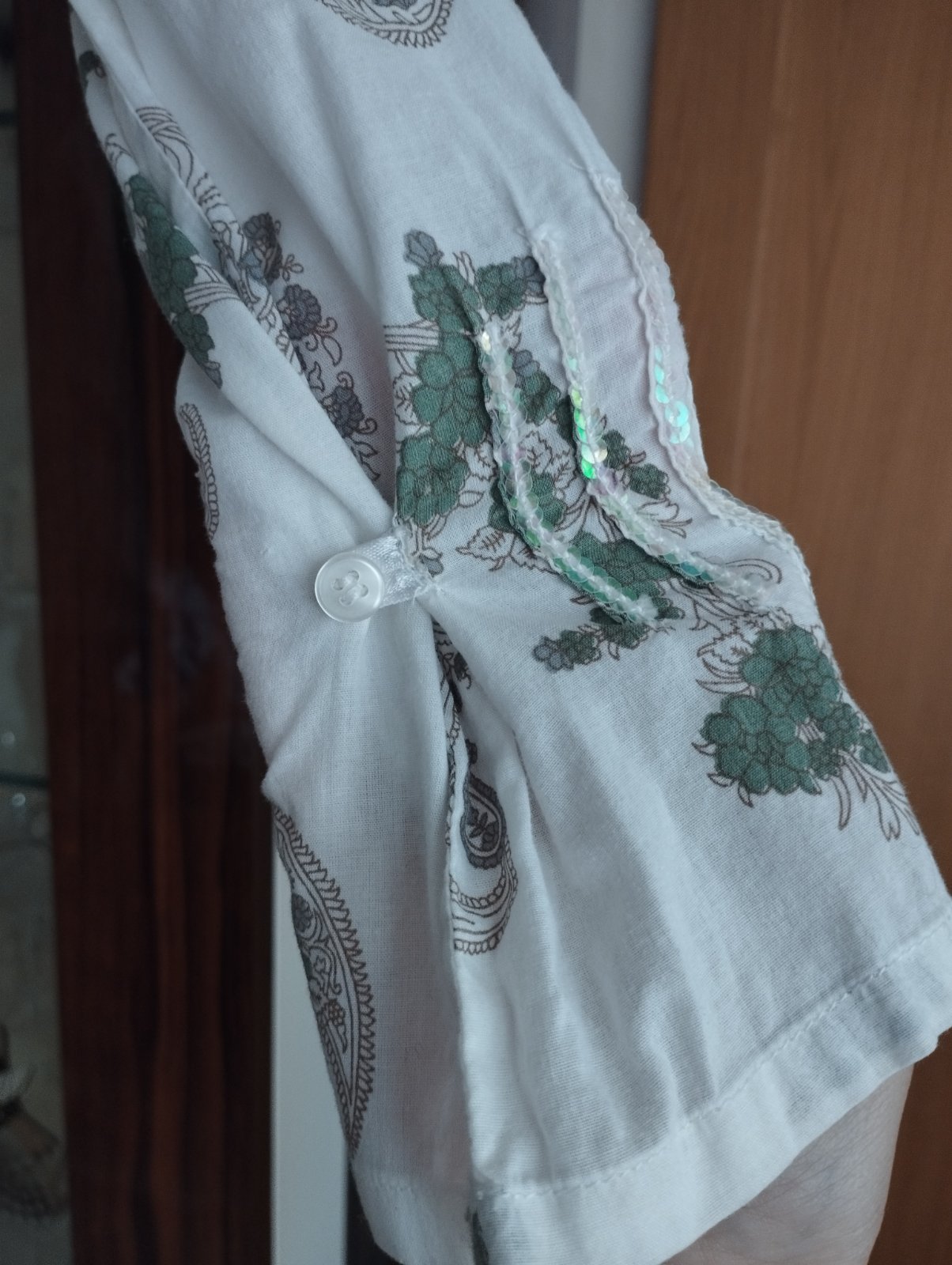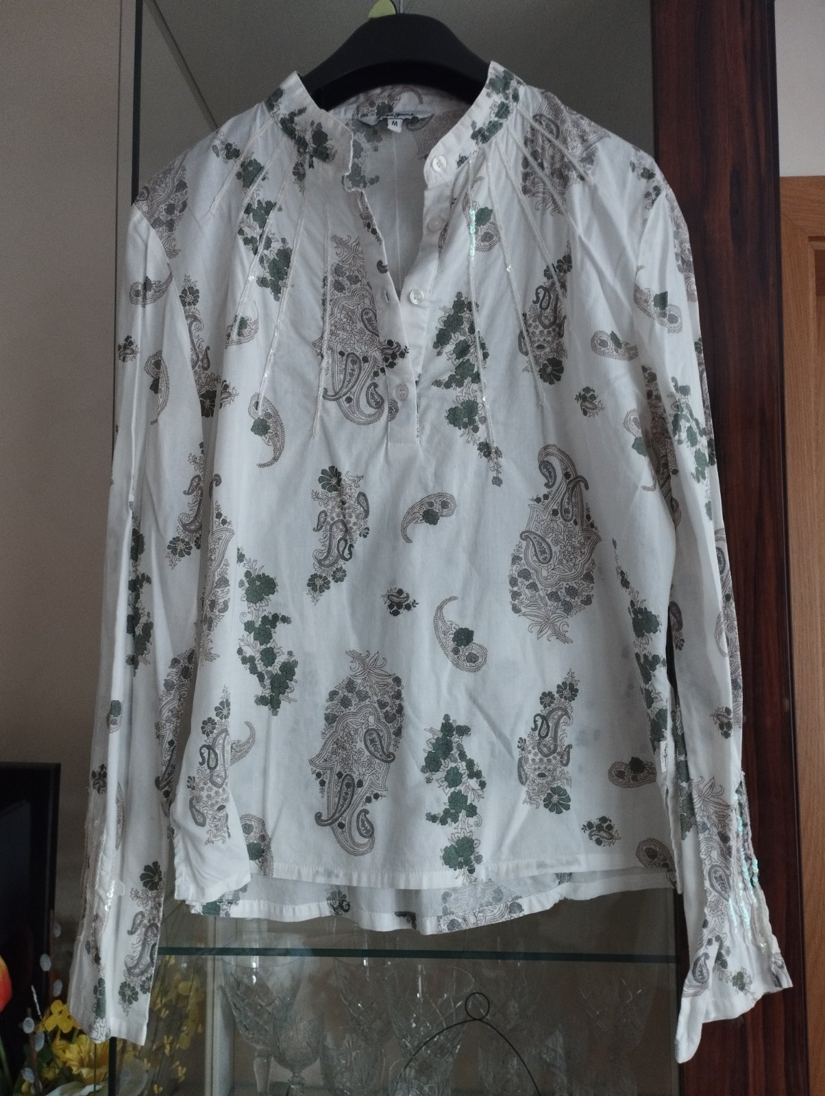 Blúzka so stojačikom. Pazuchy 48 cm, rukáv 58 cm, dĺžka 59 cm.