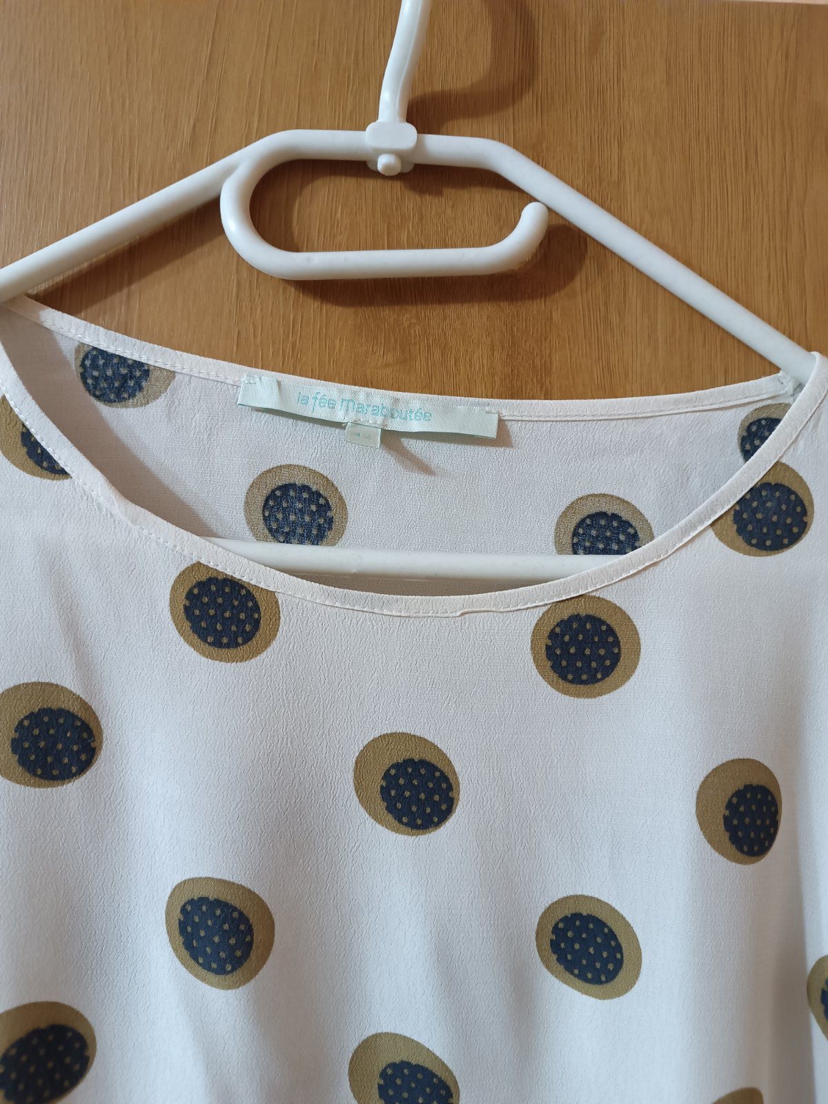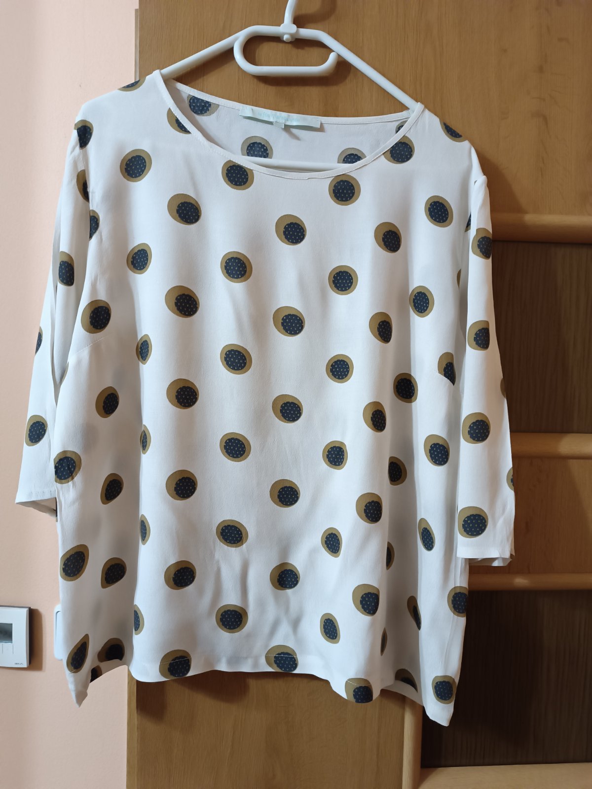 Voľná bluzka, guľatý vystrih na gumicku, dole volna. Rukávy 3/4, volne. Obvod cez prsia 55x2cm, dlzka chrbta 57 cm. Dlzka rukava 49cm od ramena. Materiál je ľahko priehľadný. Bavlna. Výborný stav...