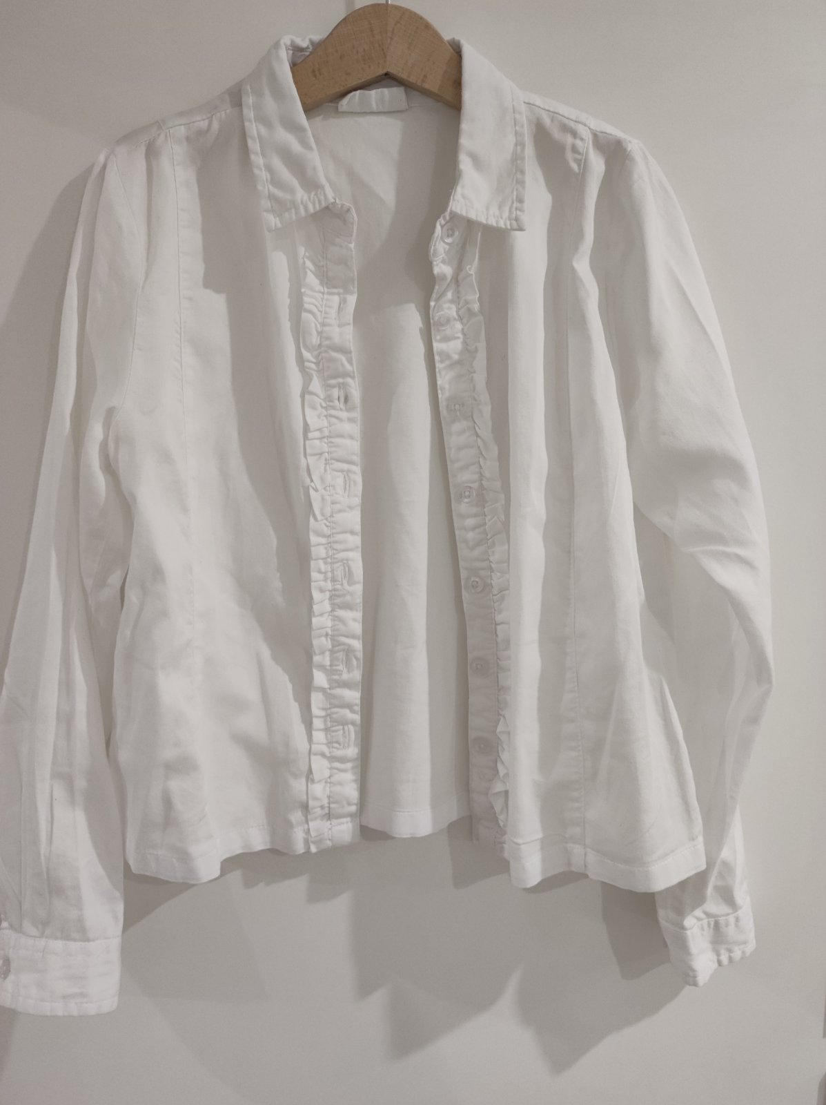 Krásna bavlnená blúzka, veľmi štýlová. Jev super stave, avšak upozorňujem, ze som ju pri žehlení pri gombikoch uspinila, neviem ci pôjde dole. Nie je prepalena ani nic podobné.