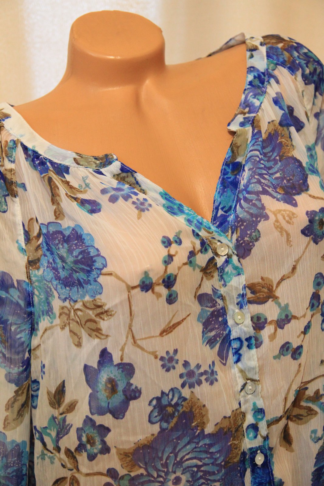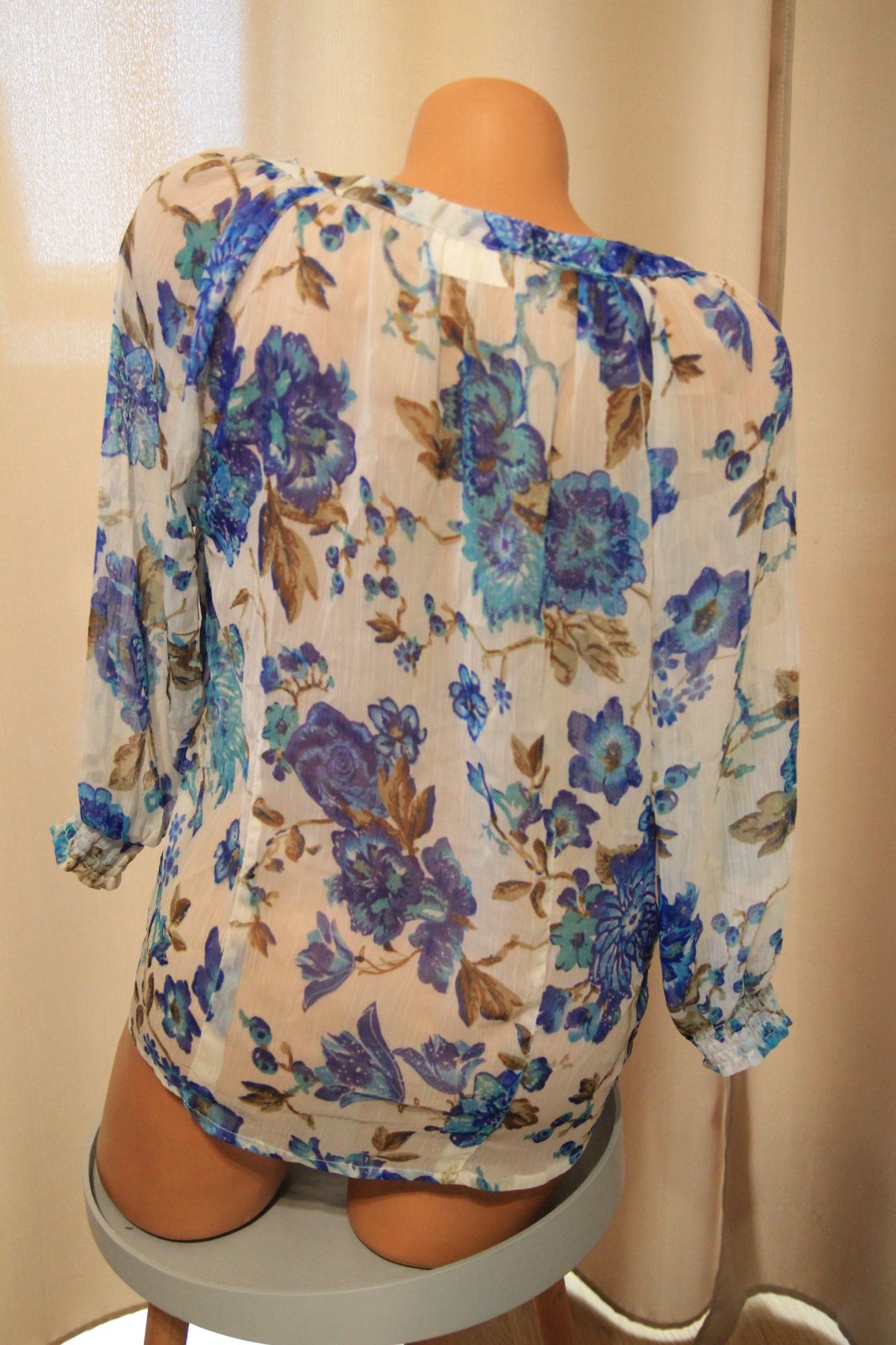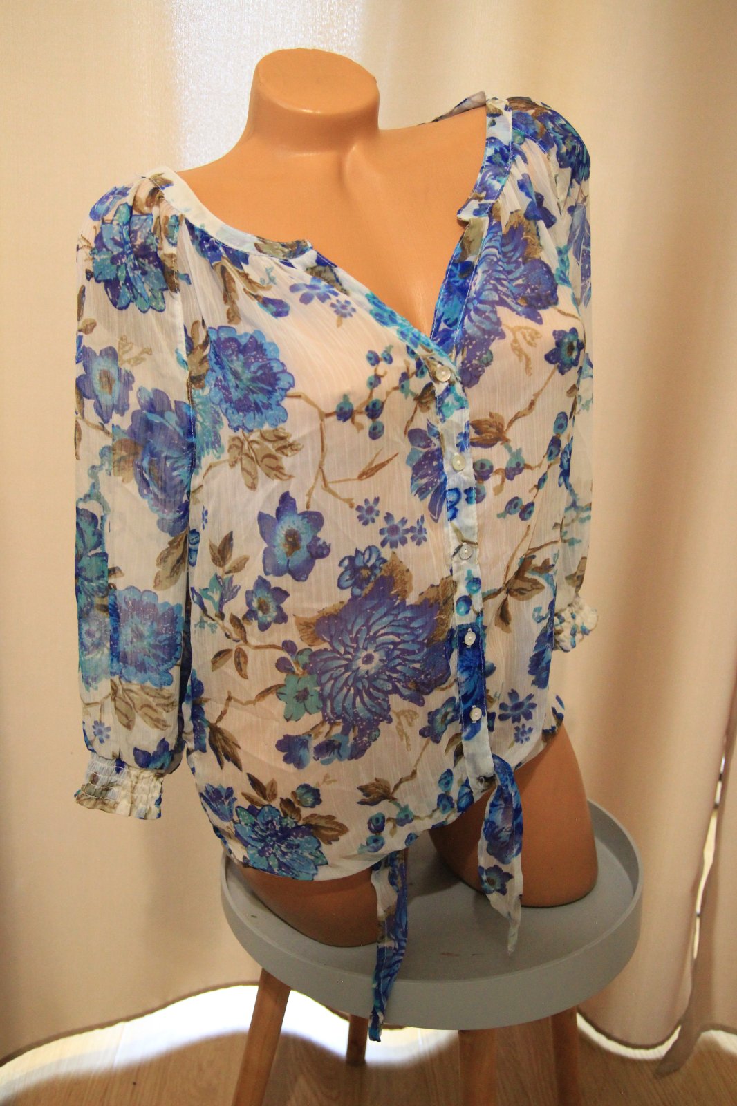 Bielo modrá kvietkovaná blúzka, na spodku sa zaväzuje. Top stav. Veľkosť L.