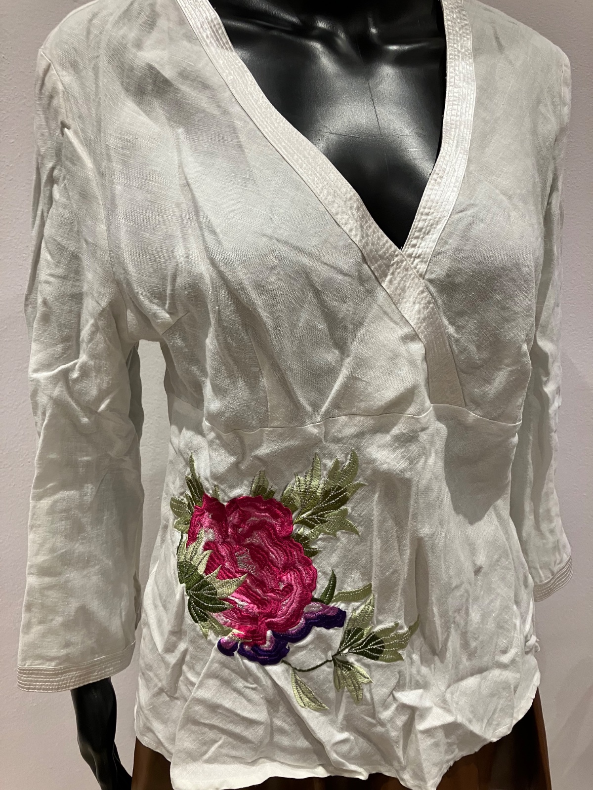 Dámska košeľa s dlhým rukávom a vyšívaným vzorom, véčkový výstrih, nie je elastická, materiál 100%ľan.