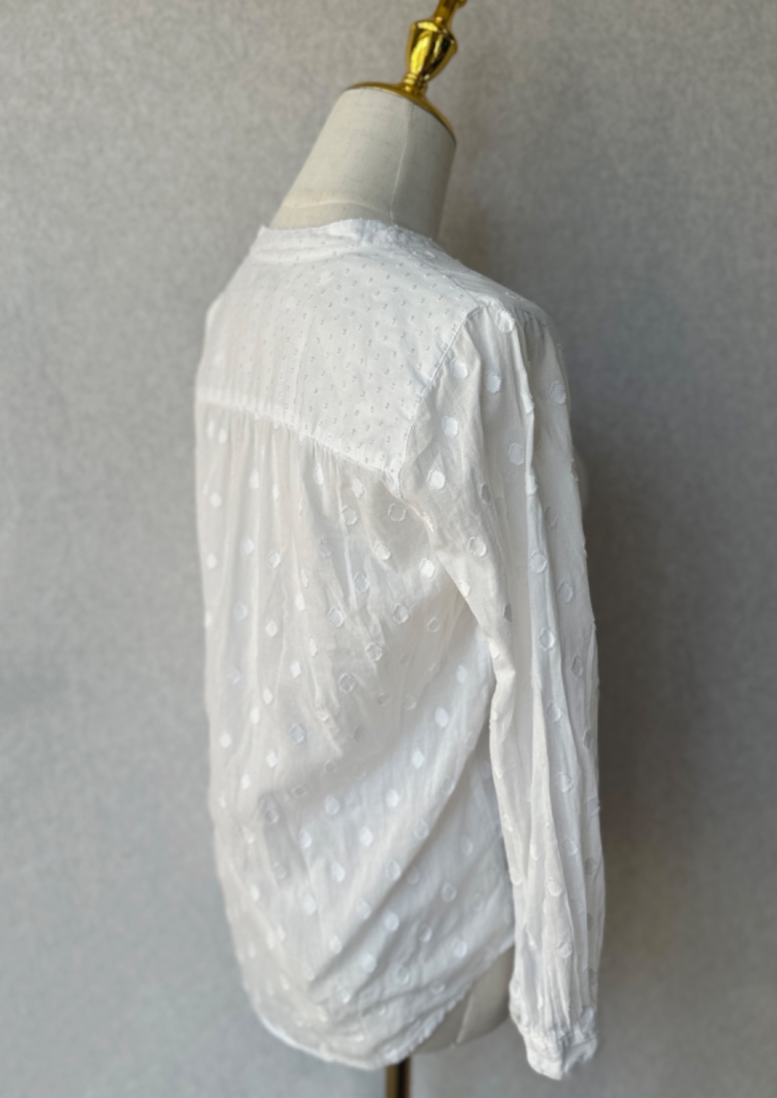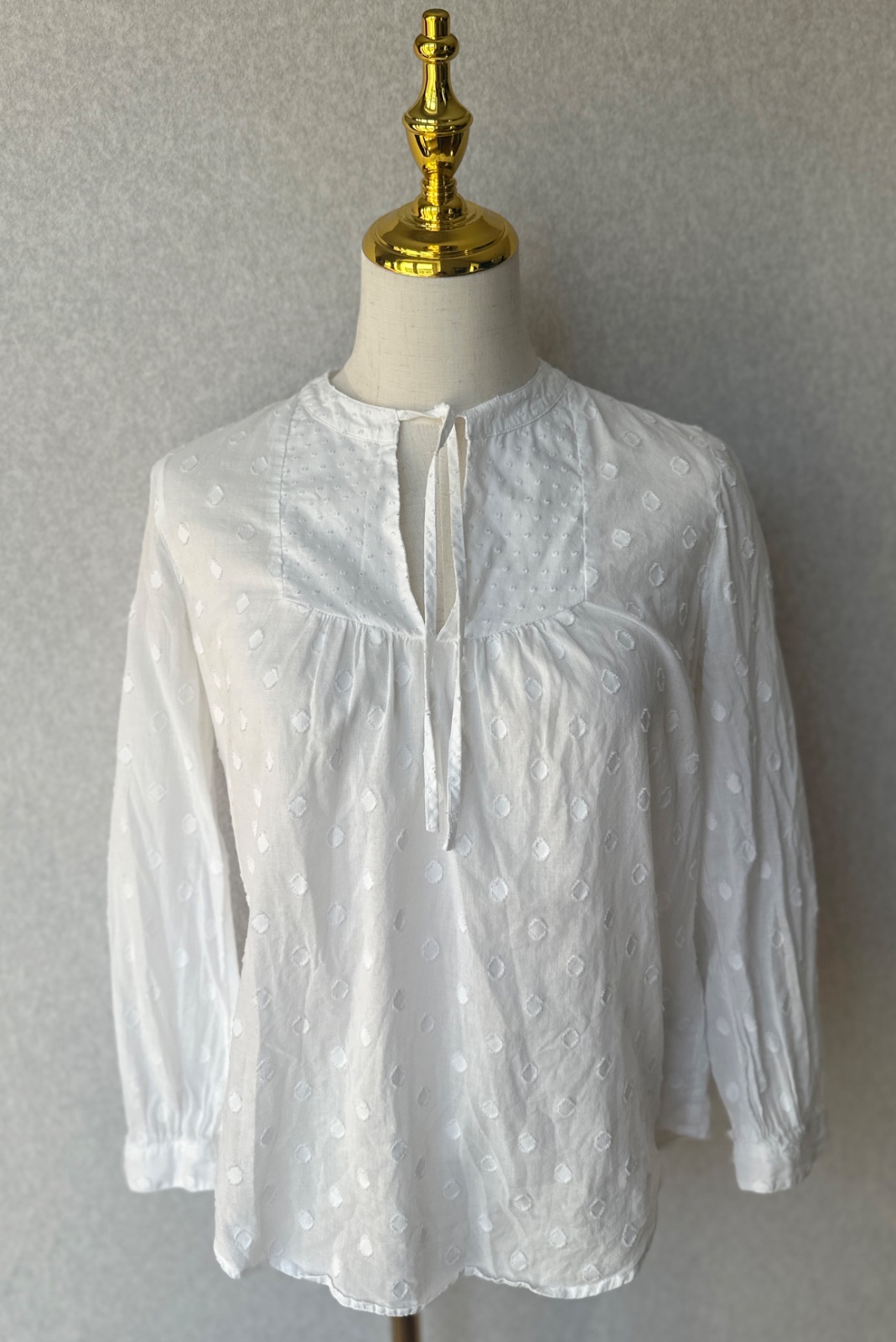 Jemná ženská blúzka s reliéfnym vzorom americkej značky J. Crew, ktorá sa vyznačuje klasickým štýlom s moderným nádychom a luxusom pre každodenné nosenie. 100% bavlna, pranie v pračke 30°C. V peknom stave, bez viditeľných poškodení.