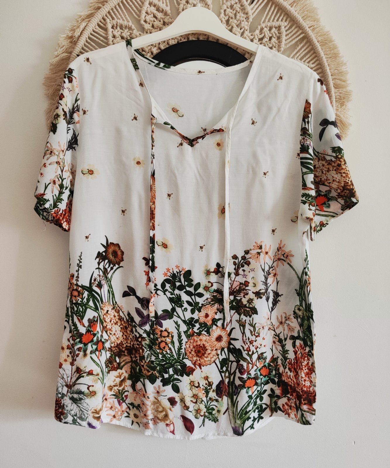 Dámska ležérna blúzka s krátkym rukávom, kvetovaná, hore na ramenách s elastickou gumičkou. Tenká. Elastická. Farba biela,svetlomodrá,tyrkysová, hnedá, tmavohnedá. Materiál:95%polyester 5%elastan....