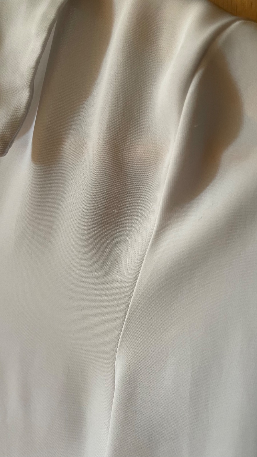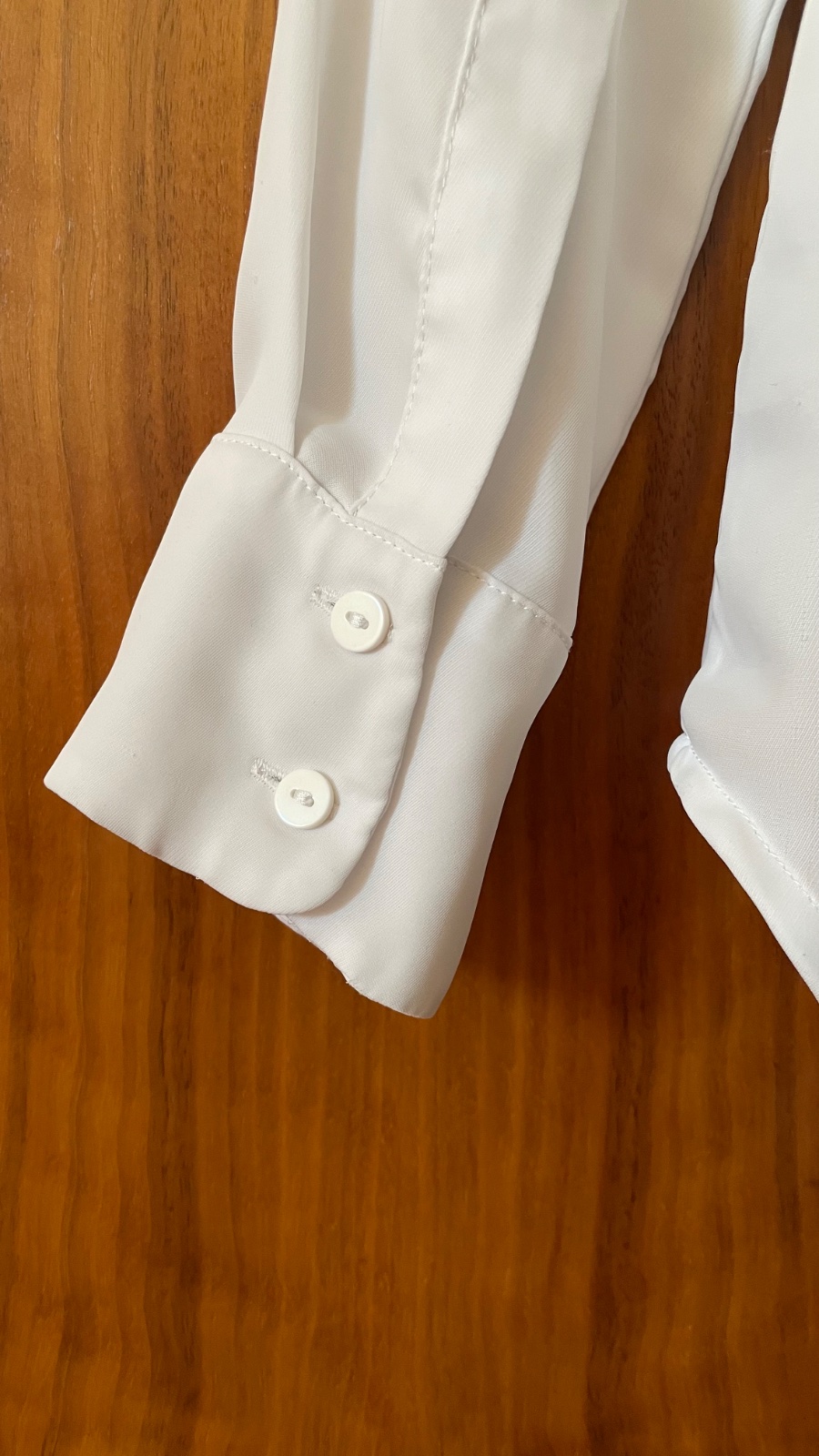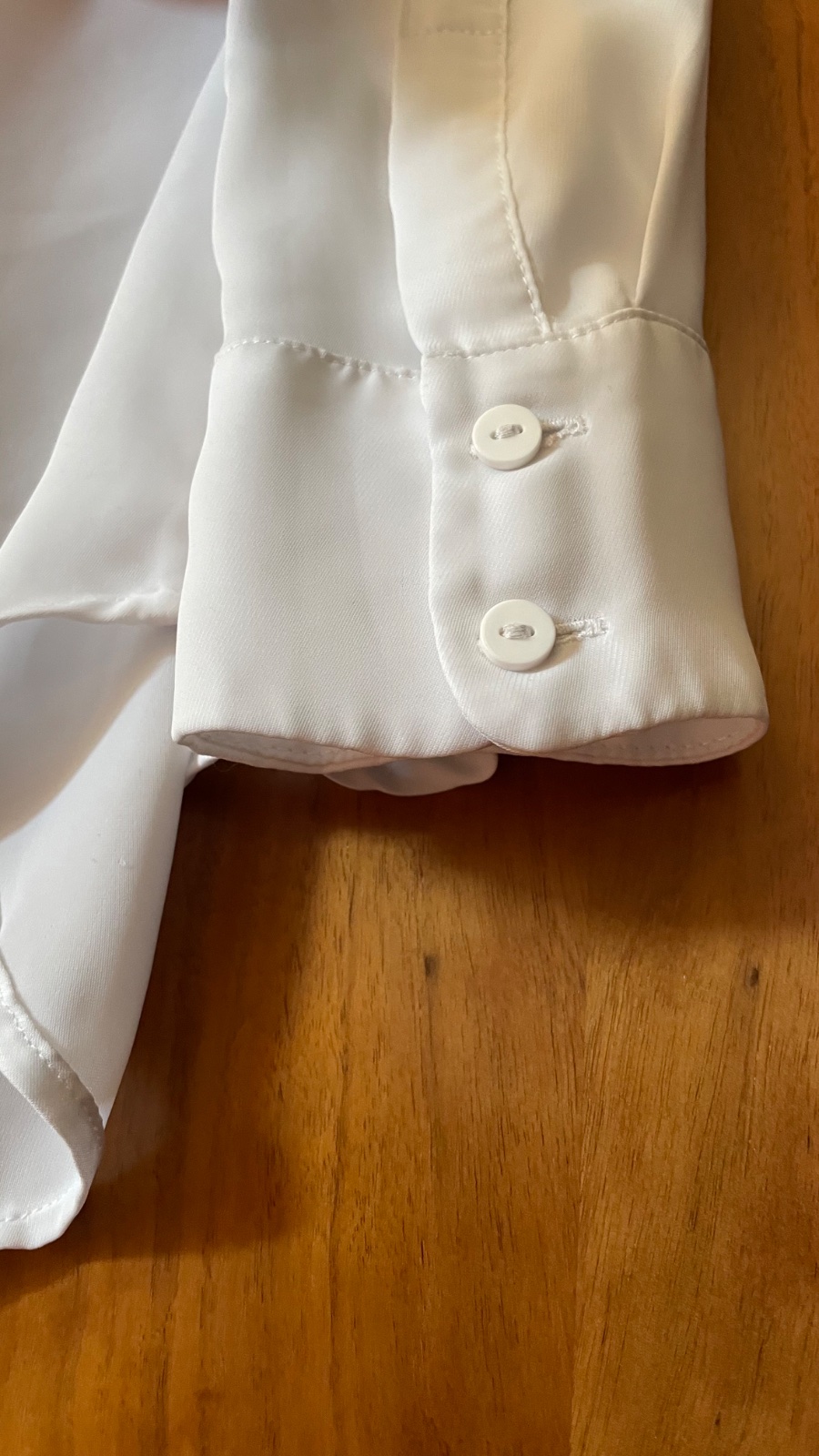 Predám zachovalú blúzku z mäkkej tkaniny s úzkym golierom, zapínaním na skryté gombíky a sedlom so zámikom na chrbte. Rovný strih, dlhé rukávy s gombíkmi na manžetách a zaoblený spodný lem.