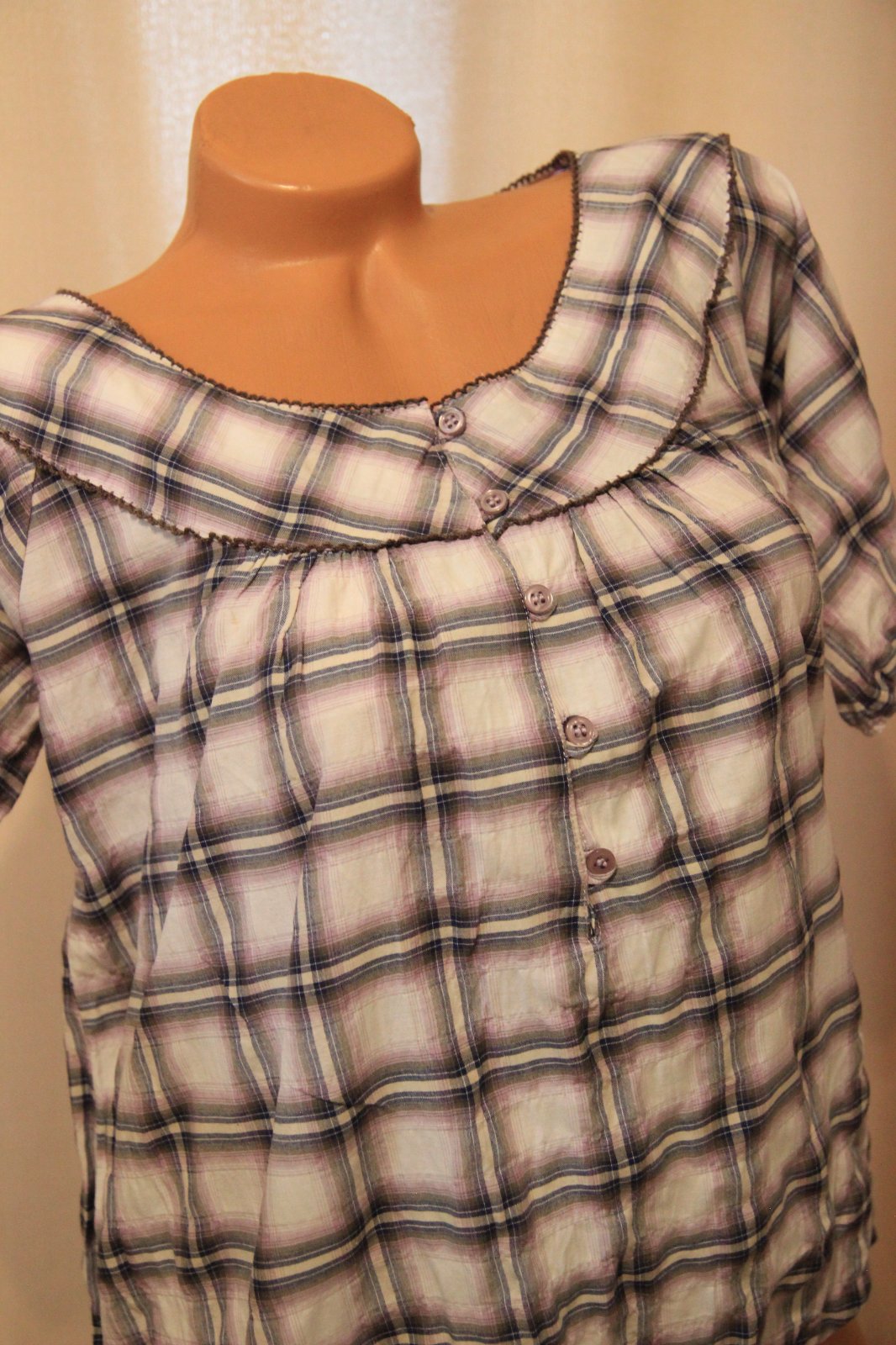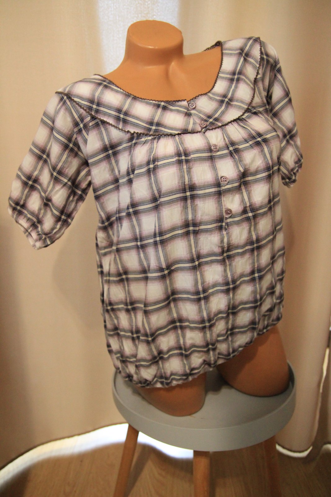 Bielo fialová kockovaná blúzka na bežné nosenie, pohodlný strih. Veľkosť M/L. Na spodku má gumu. Nosená, bez poškodení.