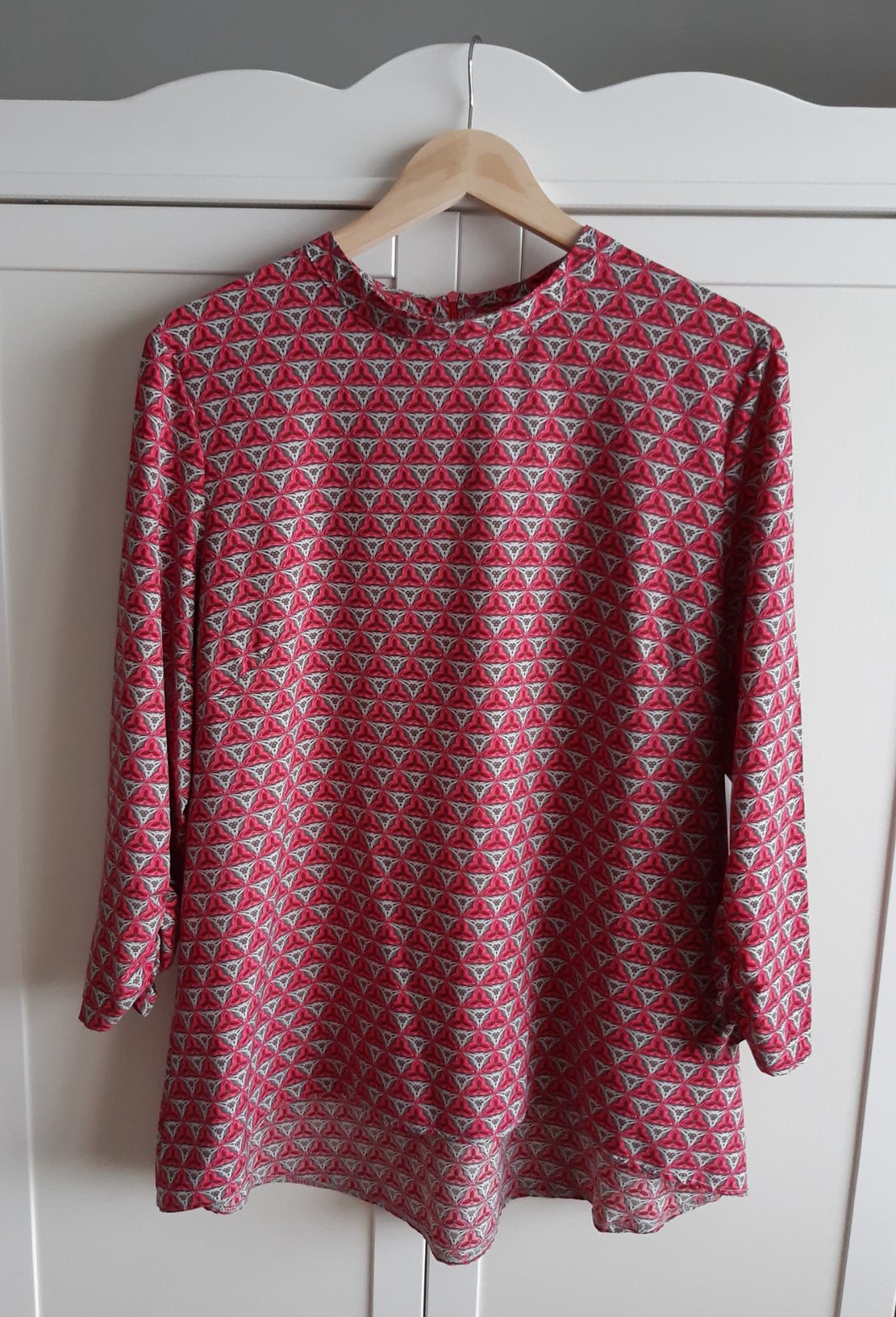 Blúzka má voľný strih a je ušitá z príjemného, padavého materiálu. Rukávy sú na konci jemne nazberkané; zapínanie na zips na zadnej strane. Materiál: 60% viskóza, 35% polyester, 5% elastan. Značka: Ulubione; veľkosť: XL (odstrihnutý vnútorný štítok).