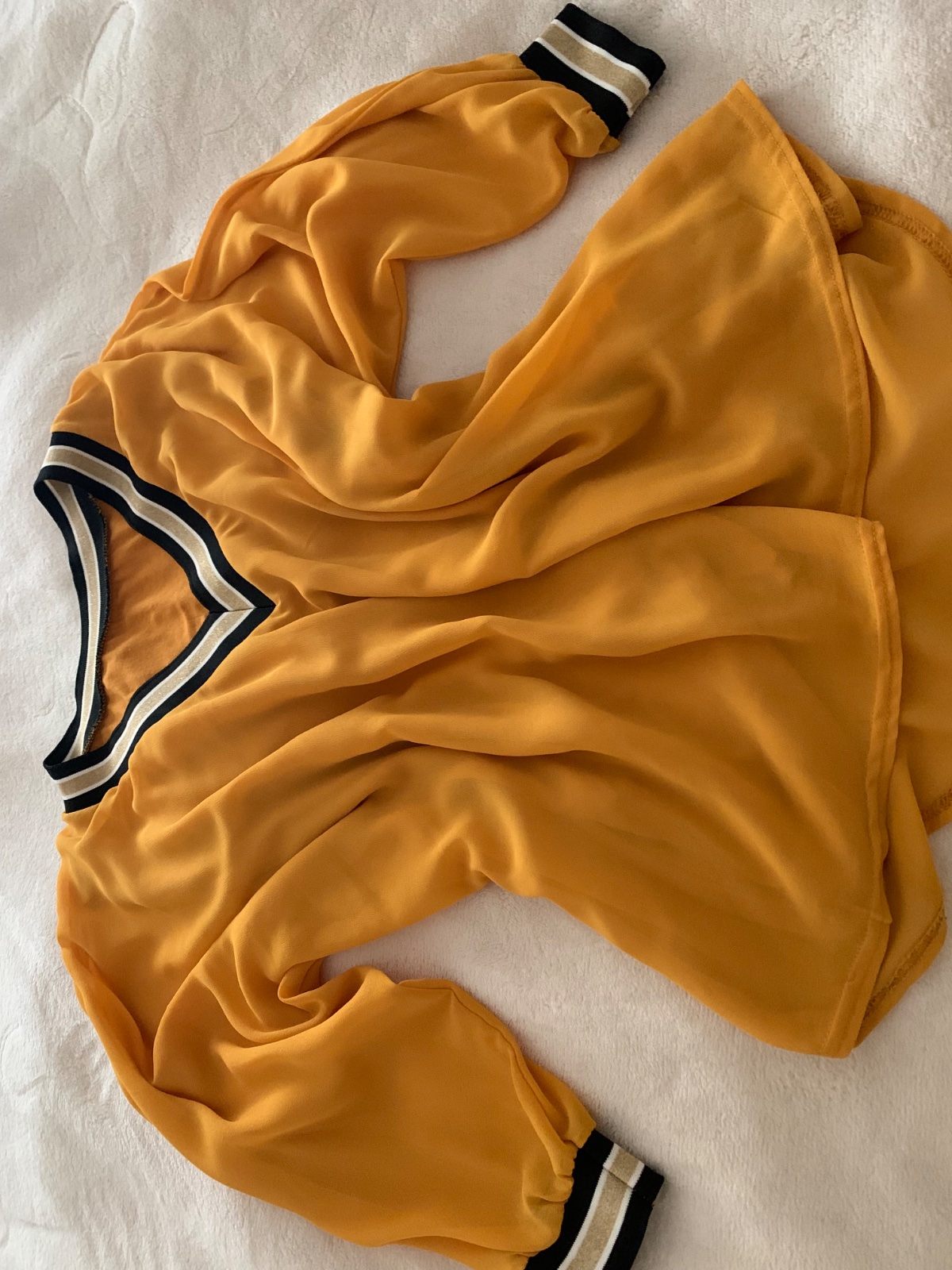 Velmi pekna moderna bluzka k dzinam, horcicovooranzovej farby so zlatym prvkom na golieri, podsita upletom. Dlzka 61/67 vpredu kratsia, sirka 63, rukav od krku 60cm.