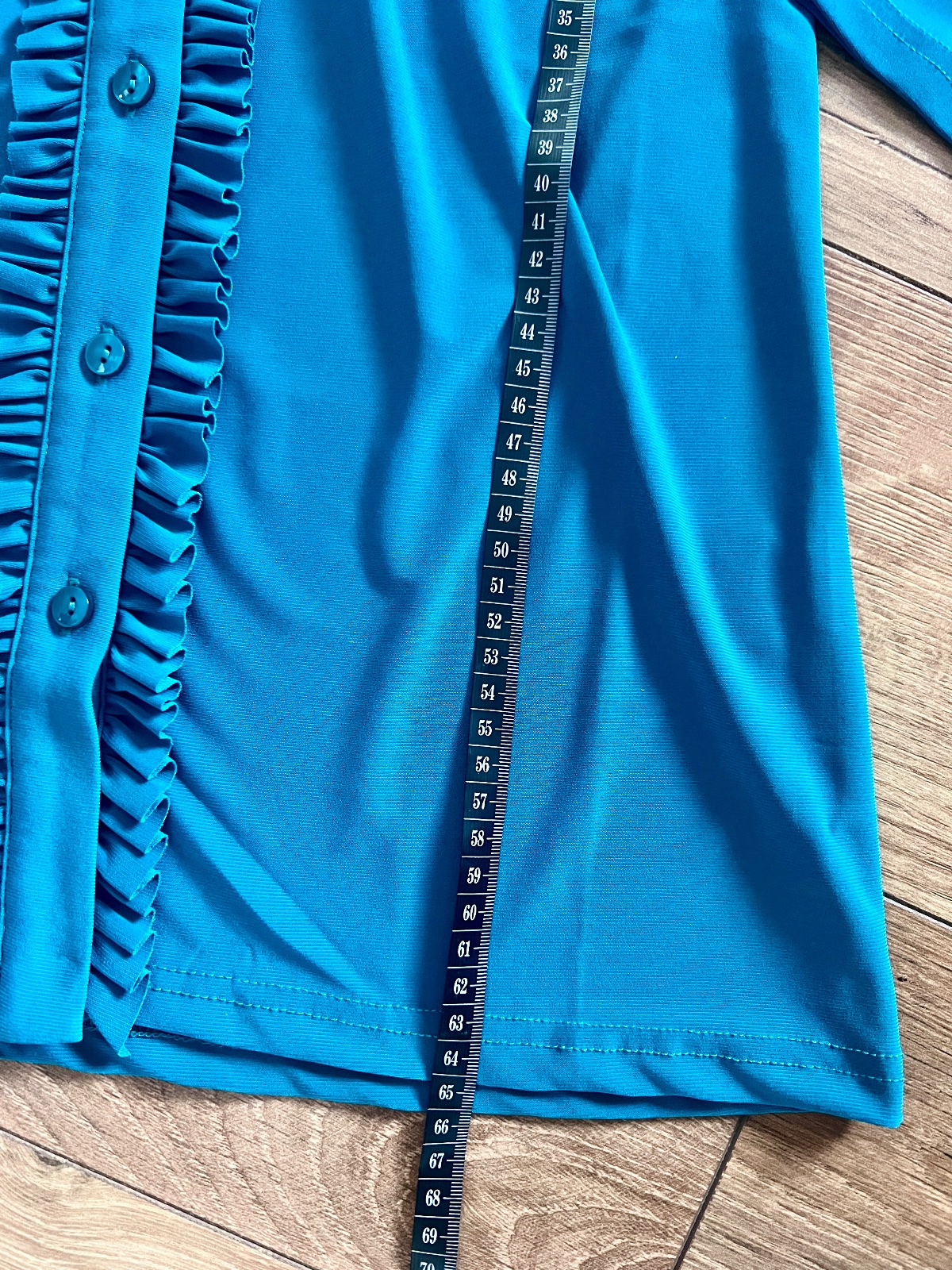 Strečová blúzka. Látka je hrubšia, ťažšia, ale strečová. Farba je sýta petrolejová, skôr ako na detailných fotkách. Málo nosená. Veľkosť skôr S/M.