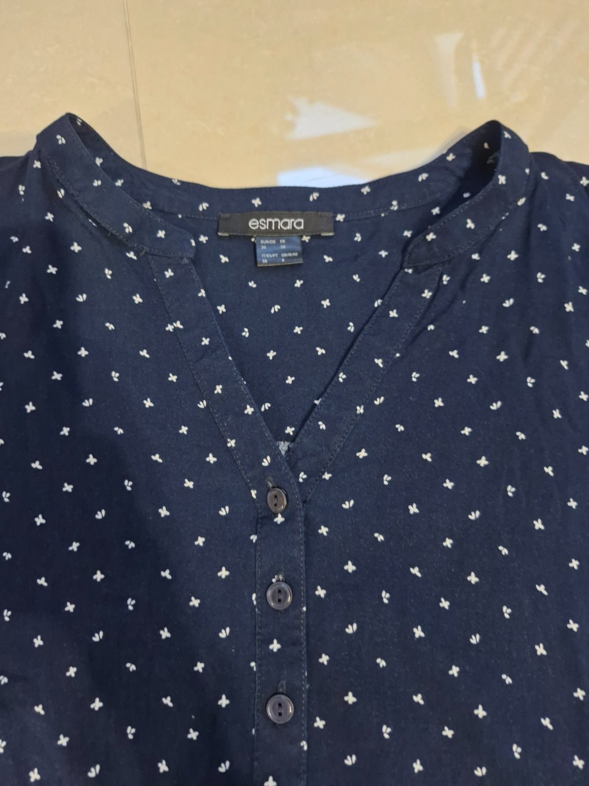 Predám peknú tmavomodrú bodkovanú , košeľu s dlhým rukávom zn.Esmara veľ.38 za 7€.