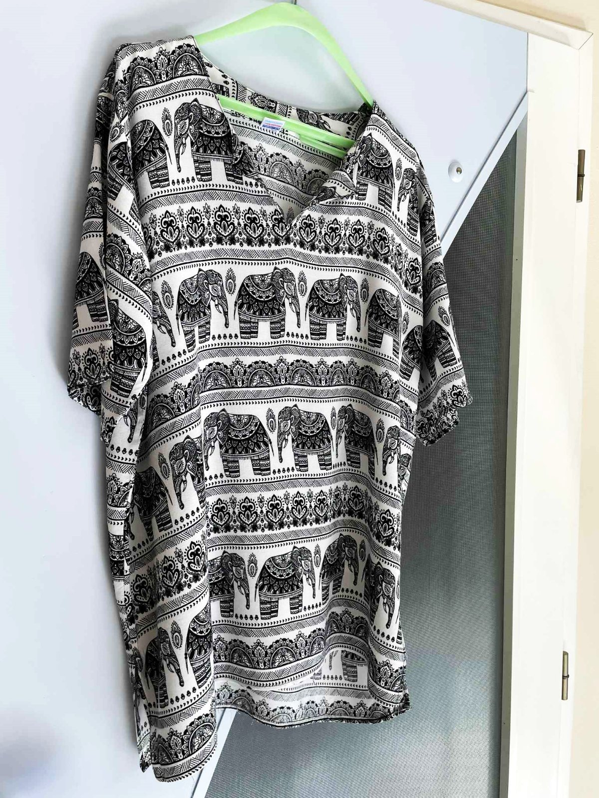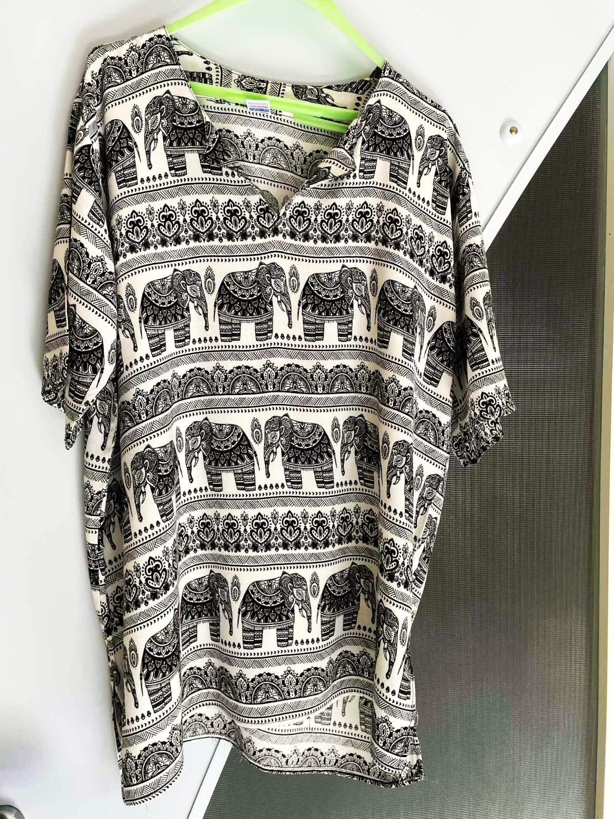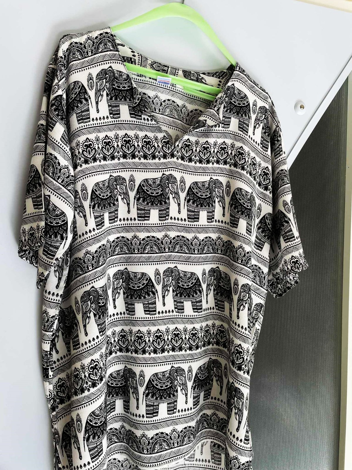 krásna letná etno tunika,raz opraná,neznosená,pekne kryje nedostatky,bavlnená - 100% plátenná bavlna,po bokoch rozporky,zaujímavý motív,vhodná na bežné nosenie ale aj na dovolenku na plavky ako minišaty,dlžka celkom = 78 cm, dlžka meraná na boku - od azuchy smerom dolu = 54 cm,šírka = 60 x 2 cm,vhodná aj na XL - bude viac voľná a padavá