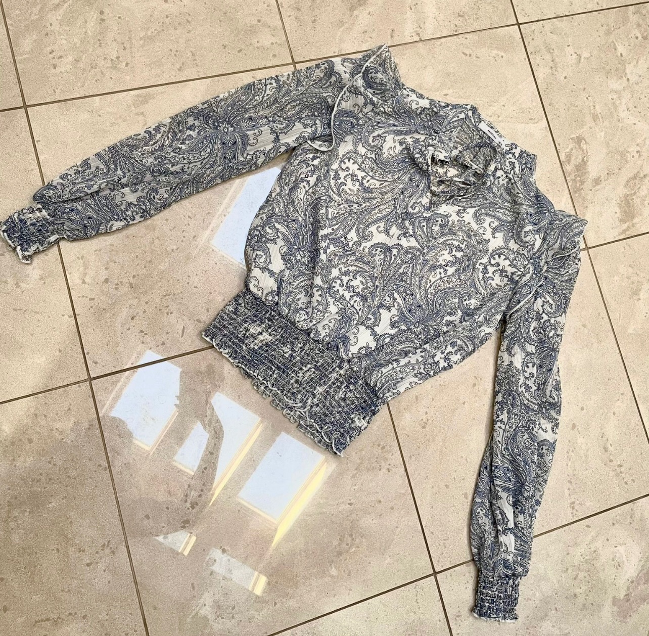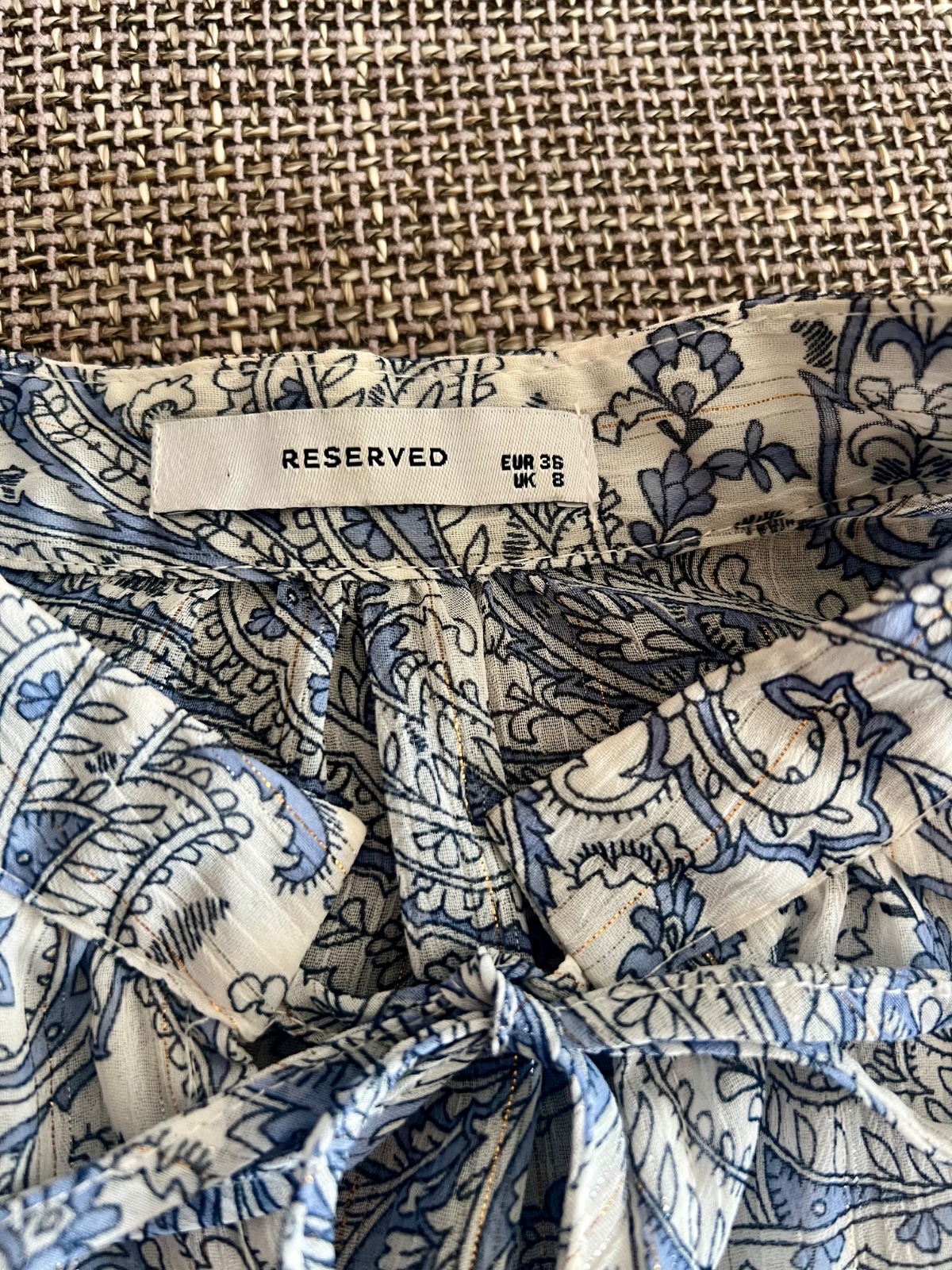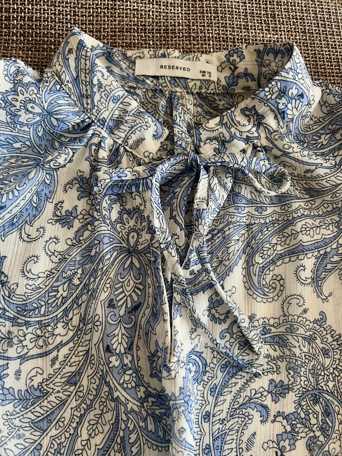 Krásna blúzička s viazaním pri krku, s malým stojačikom, pekné rukávy, Veľmi príjemný materiál. Bielo modrý vzor, v detaile jemná zlatá niť.