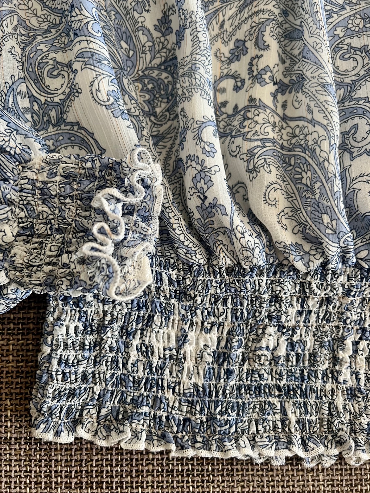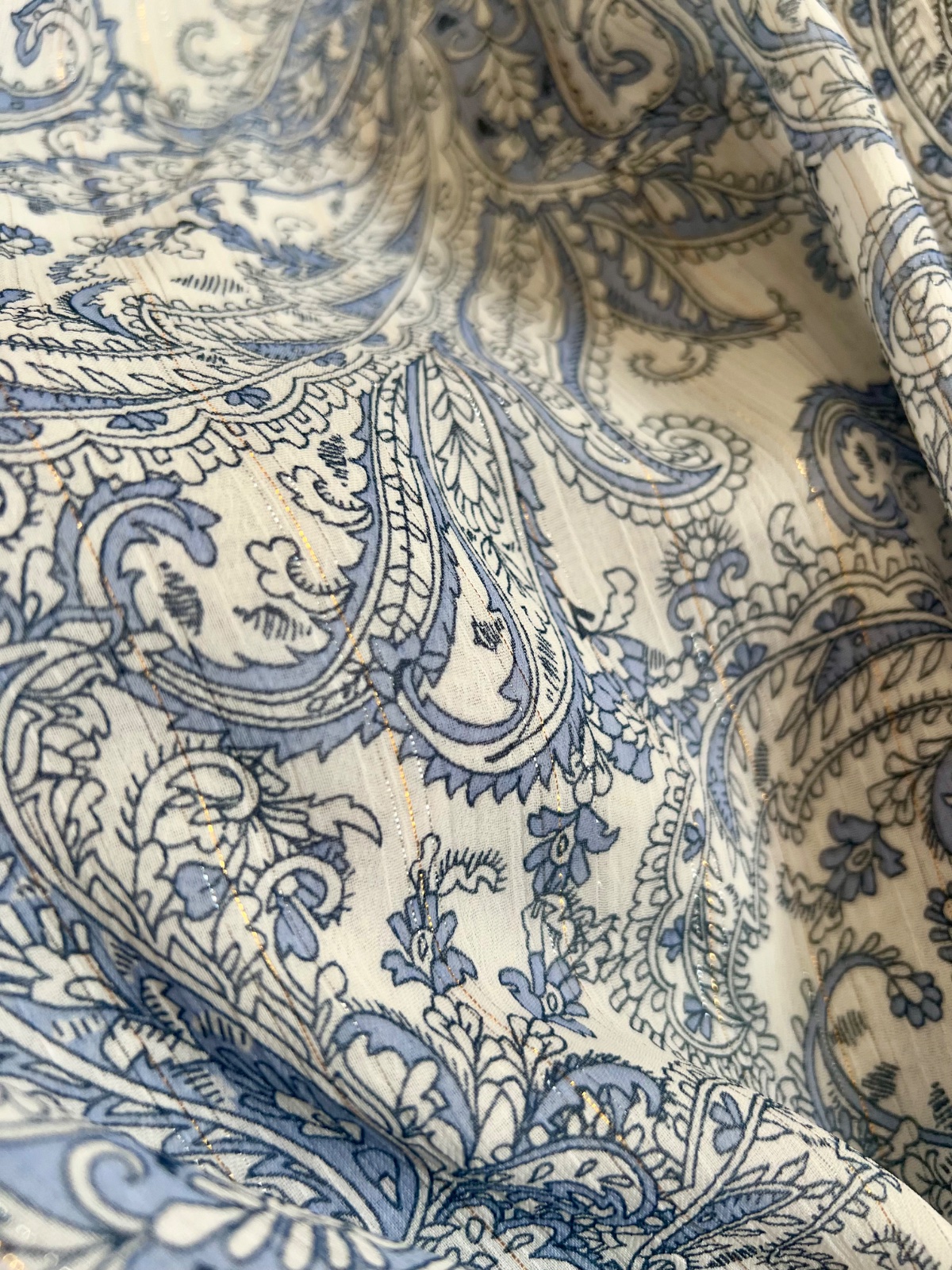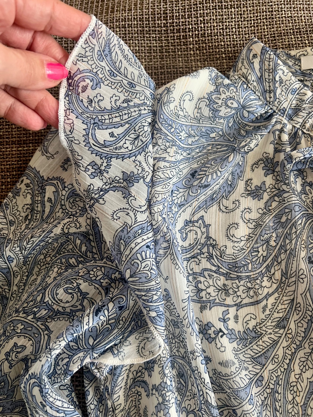 Krásna blúzička s viazaním pri krku, s malým stojačikom, pekné rukávy, Veľmi príjemný materiál. Bielo modrý vzor, v detaile jemná zlatá niť.