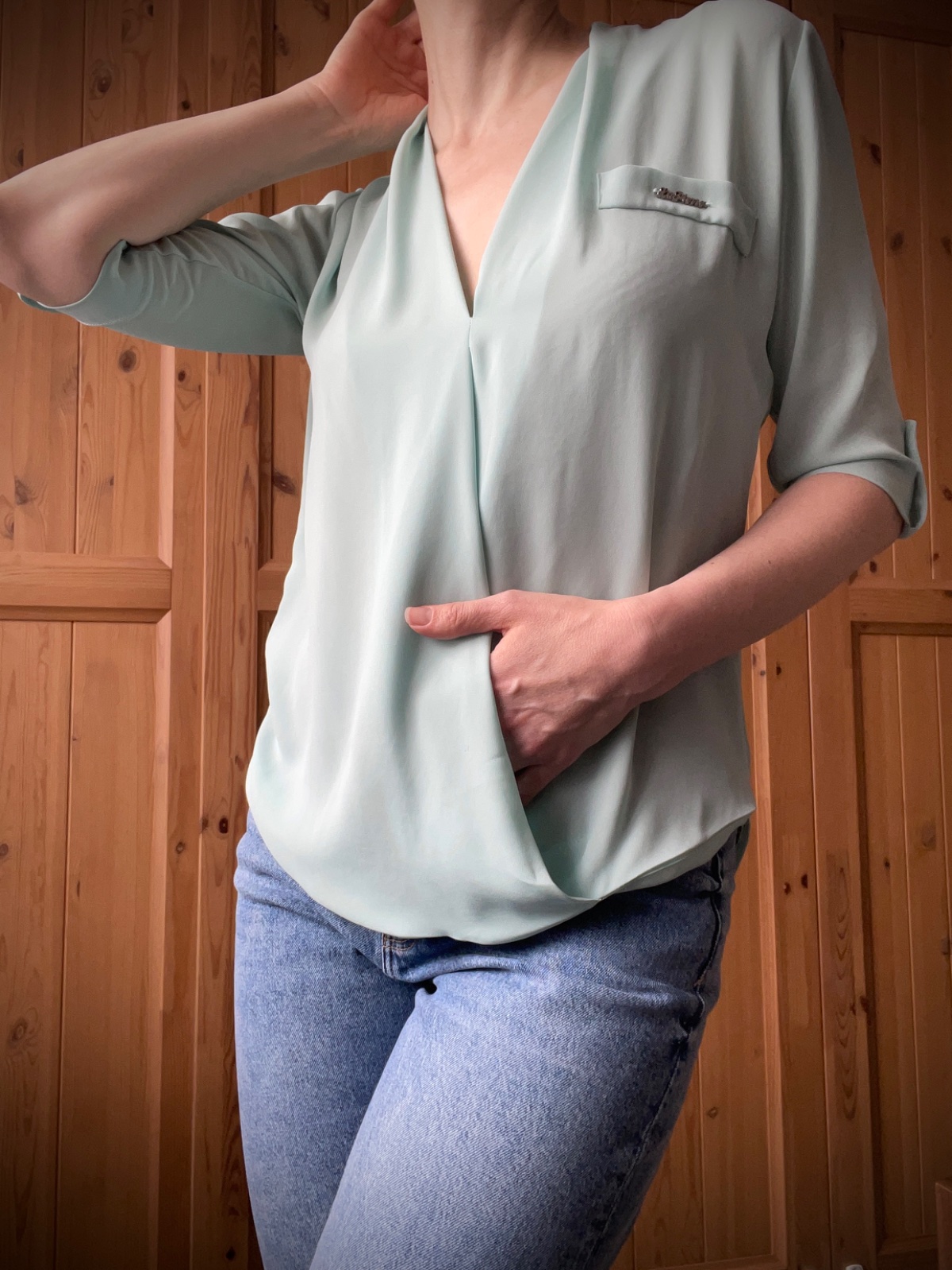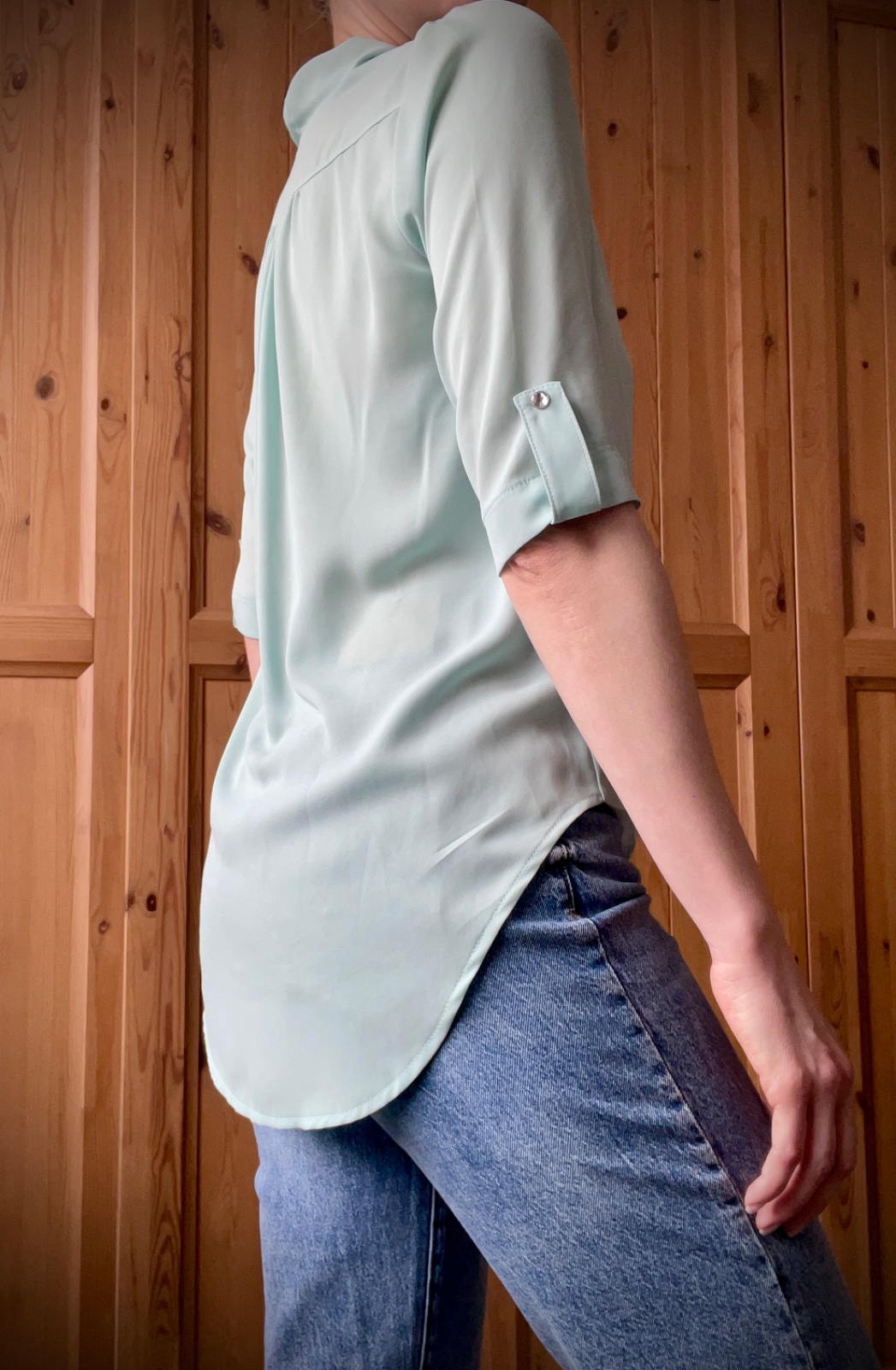 Ľahká voľná blúzka v mintovej farbe maďarskej značky La Pierre. Má zaujímavý strih, je spojená v oblasti hrudníka a v spodnej časti. Neroztvára sa, ale vytvára zaujímavý efekt. Blúzku som mala oblečenú len jedenkrát, na malom kúsku sú dve sivé bodky (označené na poslednej foto). Pri nosení sú neviditeľné.