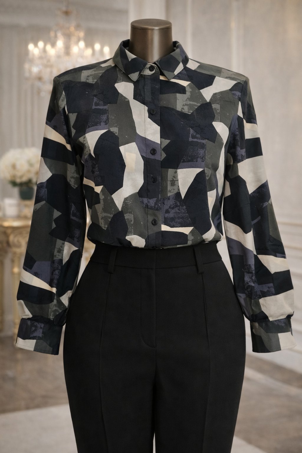 Štýlová košeľa Vero Moda s moderným abstraktným geometrickým vzorom v odtieňoch sivej, tmavomodrej a bielej.