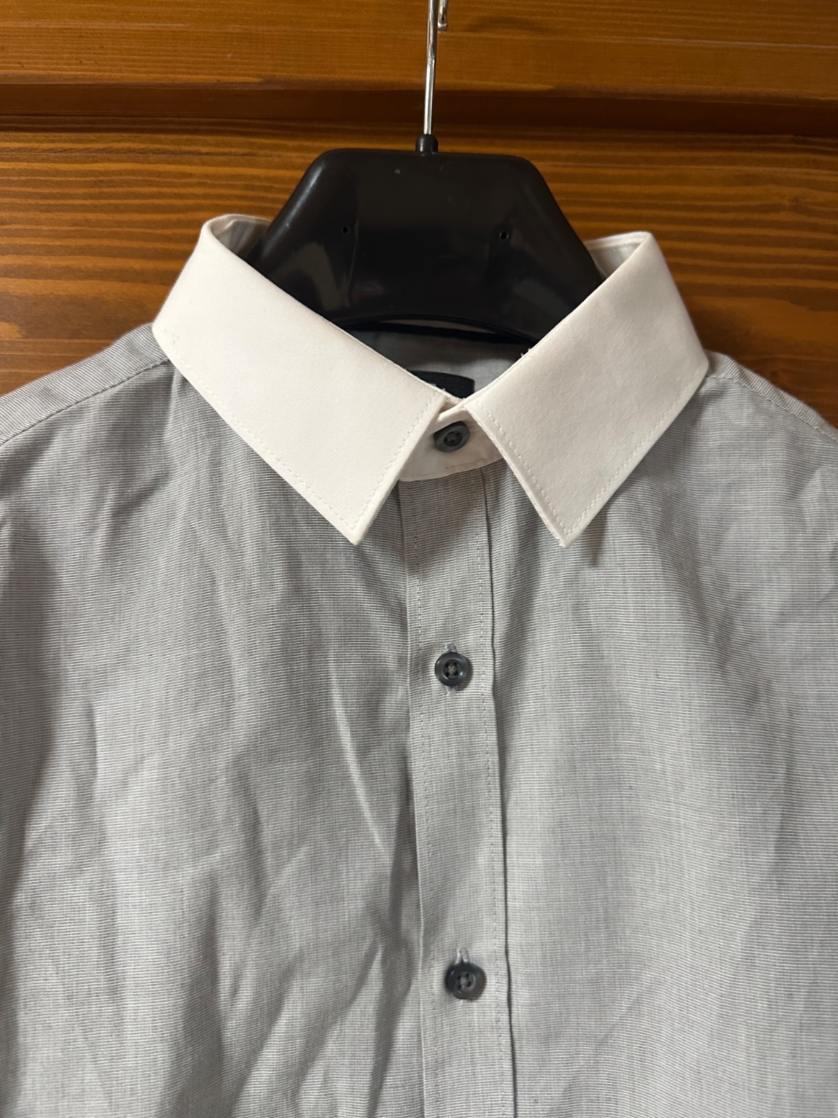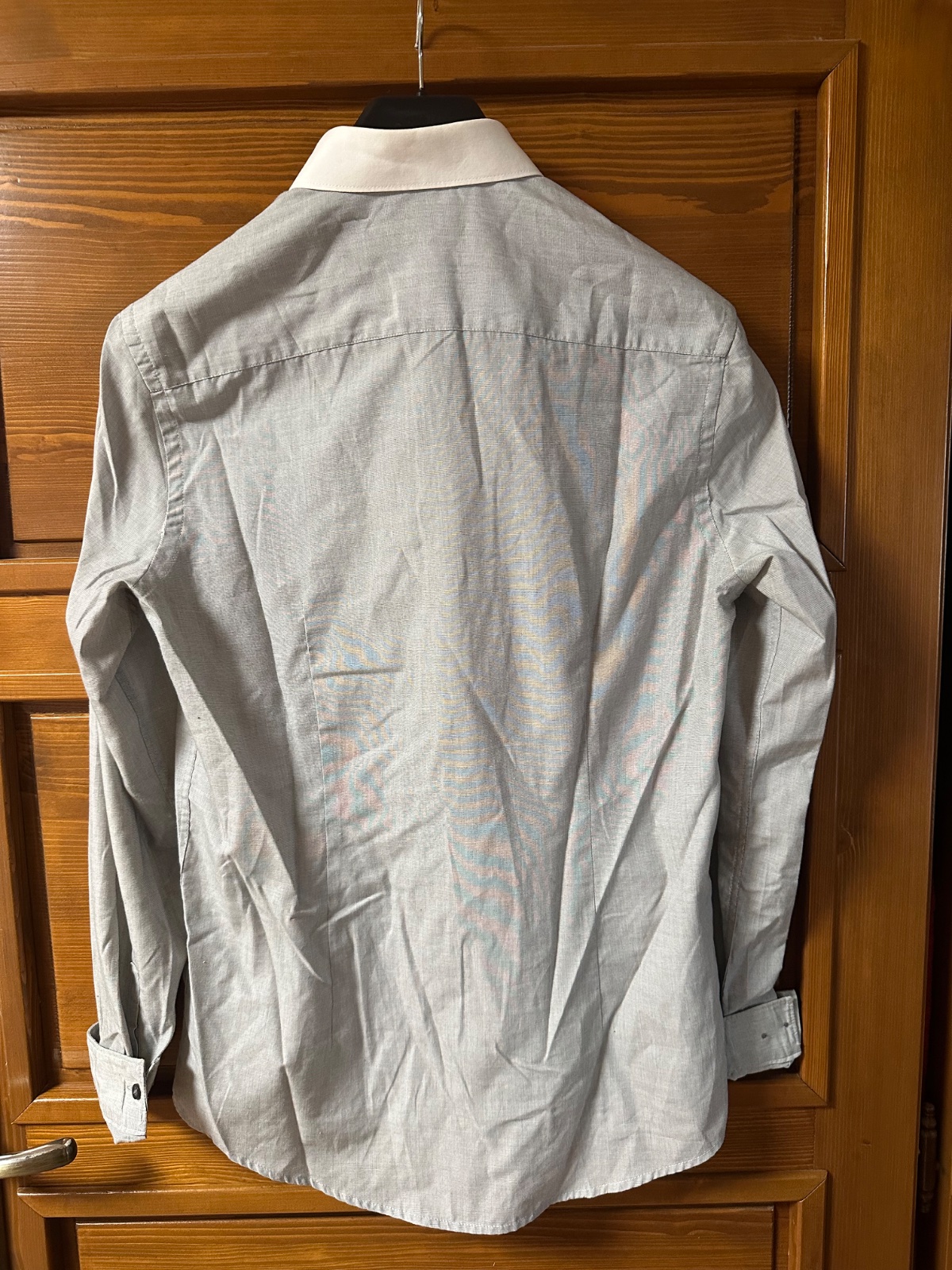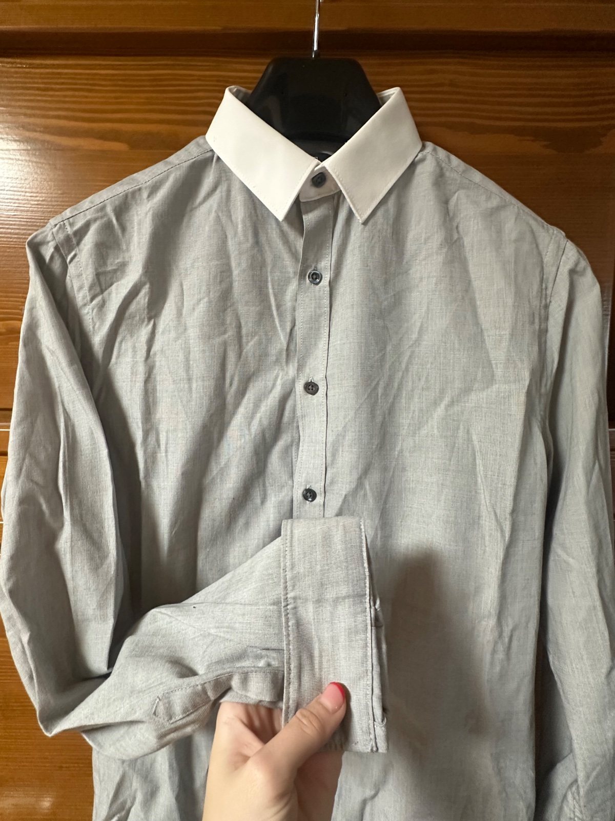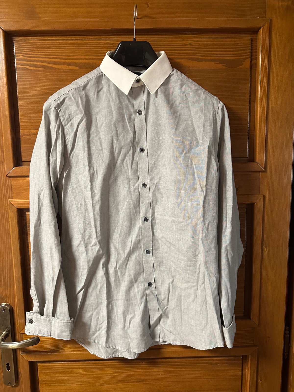 Predám pánsku košeľu F&F slim fit vo veľkosti 38. Svetlošedá farba s bielym golierom jej dodáva štýlový vzhľad. Ľahký a príjemný materiál, vhodná na bežné nosenie aj do práce. Je vo veľmi dobrom stave, bez poškodení, len potrebuje prežehliť.