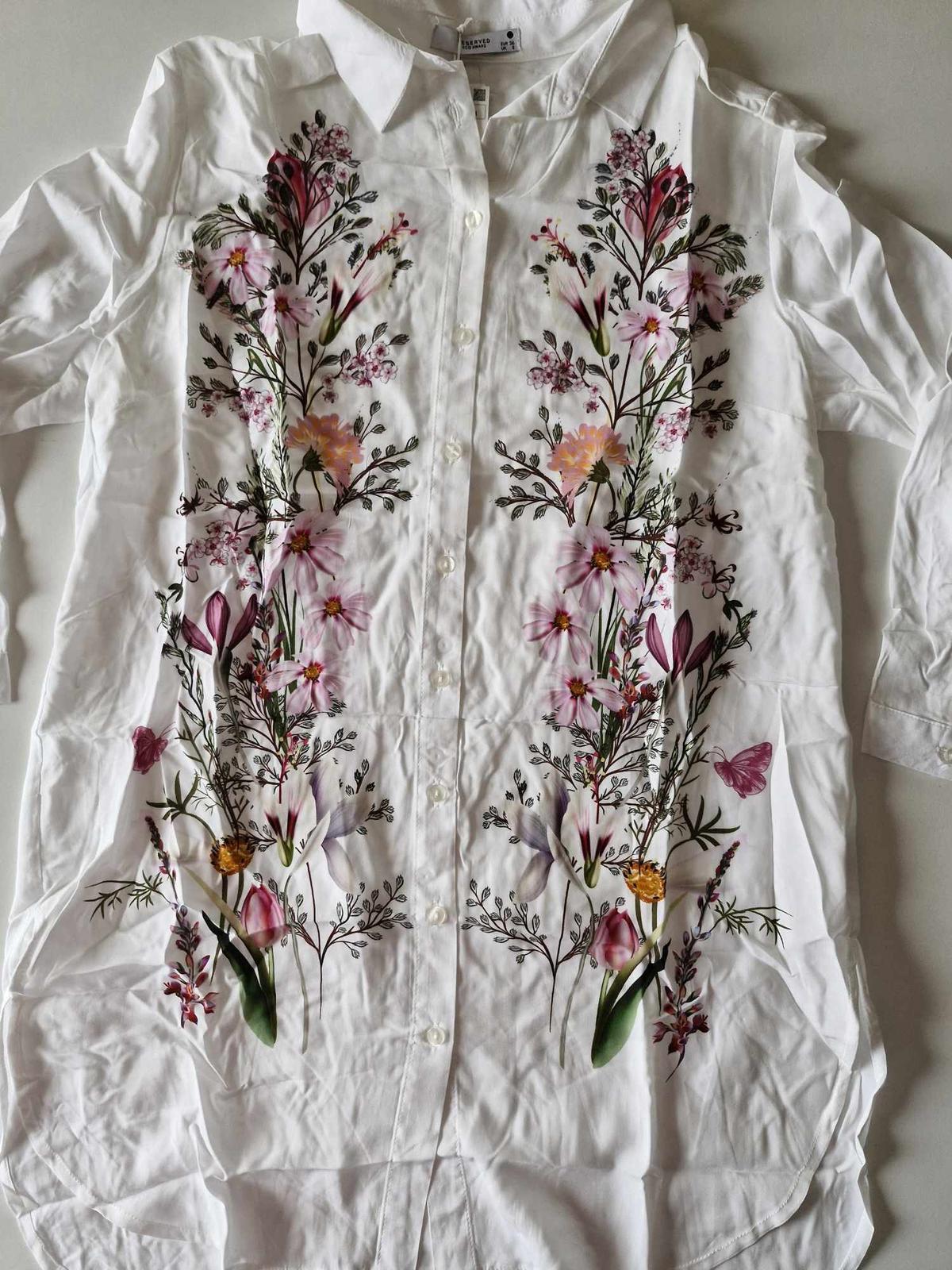 Kvalitná dámska blúzka, over size, bielej farby, zapínanie na gombíky, široký golier nariasený do šnúrky, materiál 100% bavlna, super stav....veľ. píše XS, sedí aj na S/M prsia 55 cm dĺžka 66 cm r...