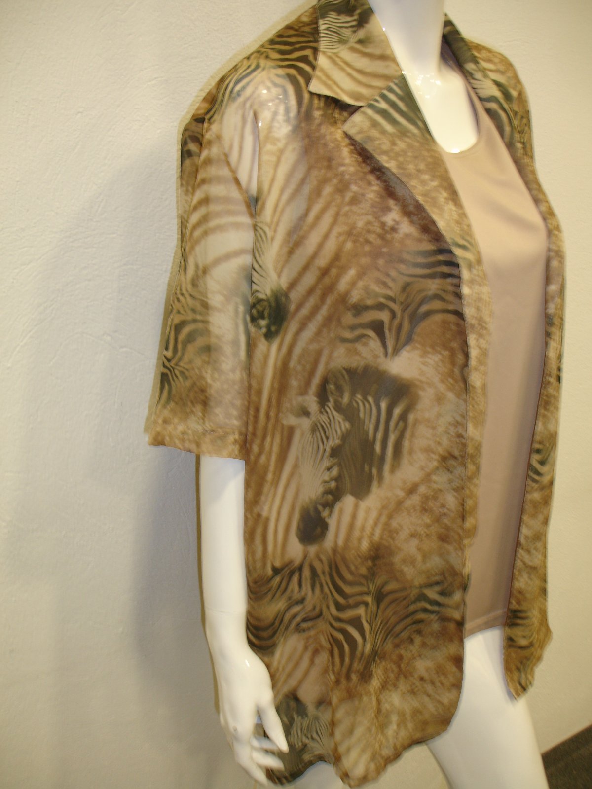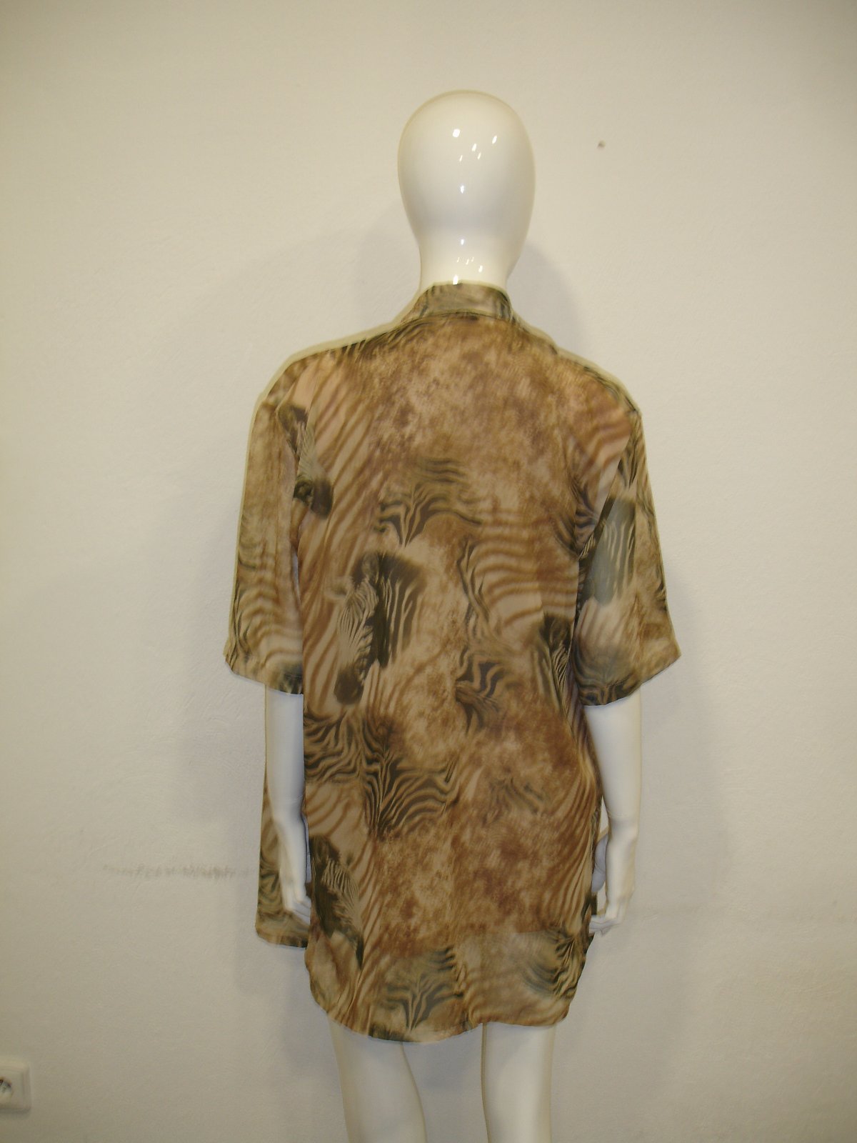 Pár krát oblečená blúzka, bez poškodenia. Pozor nedá sa zapnúť, je to len také prehodenie na tričko alebo tielko. Materiál je 100% polyester . Rozmery sú šírka cez prsia 60x2 cm, dlžka je 81 cm a dlžka rukáva je 30 cm.