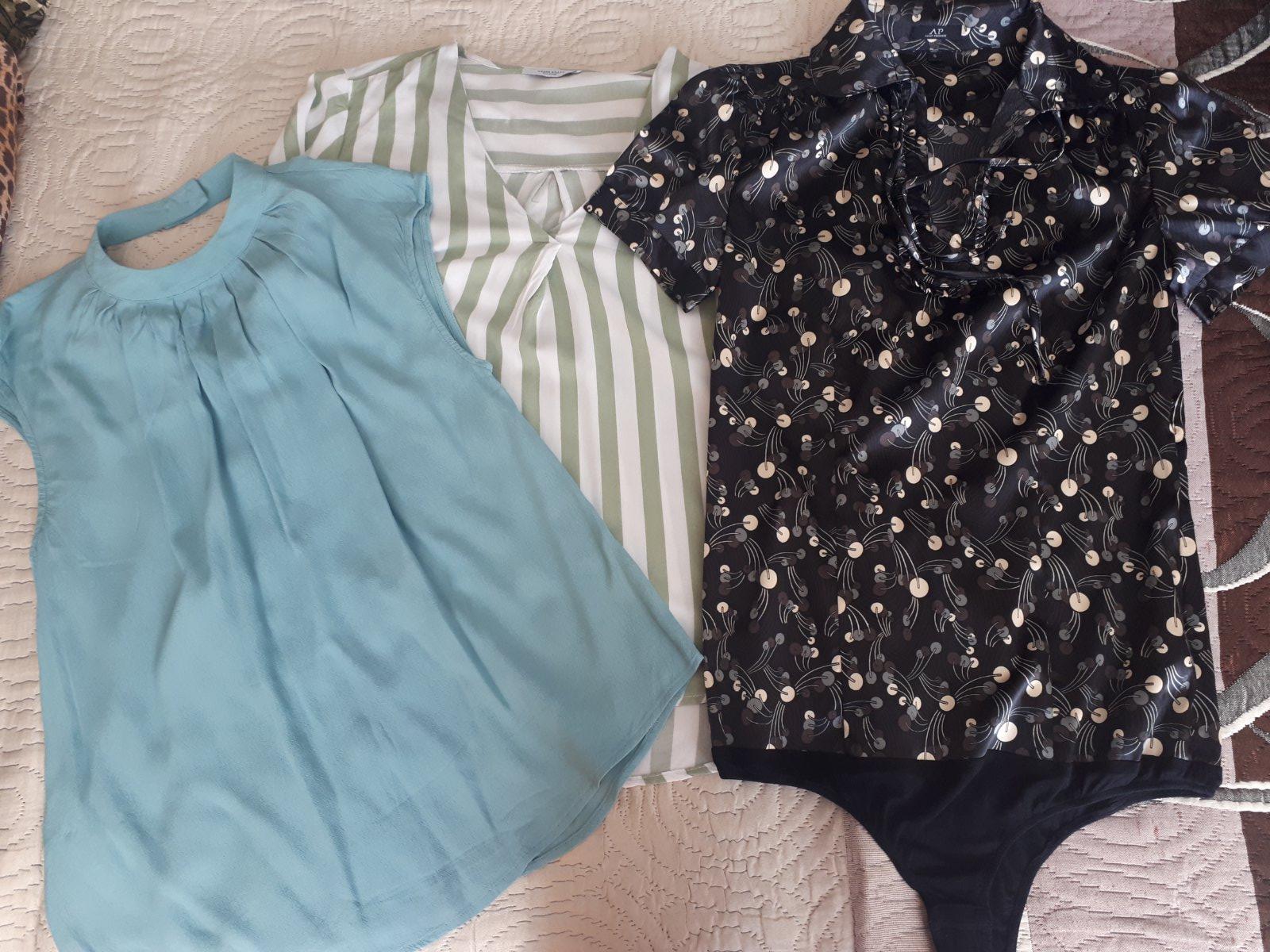 Predám bielo zelenú pasikavu košelu veĺkosť XS dlhy rukáv,tyrkysovú blúzku bez rukávov zn.promod veĺkosť 36,body tmavo hnedej farby so vzorom zn. AP,veĺkosť S Cena za ks.2,0Eur.