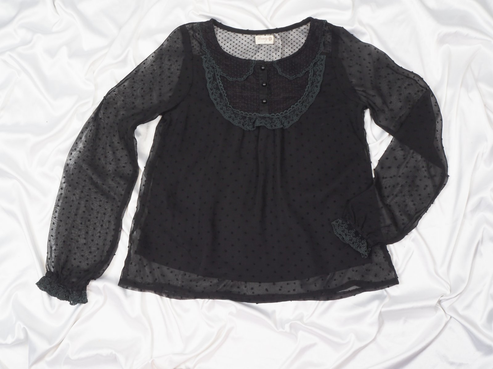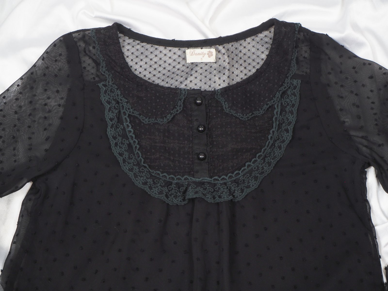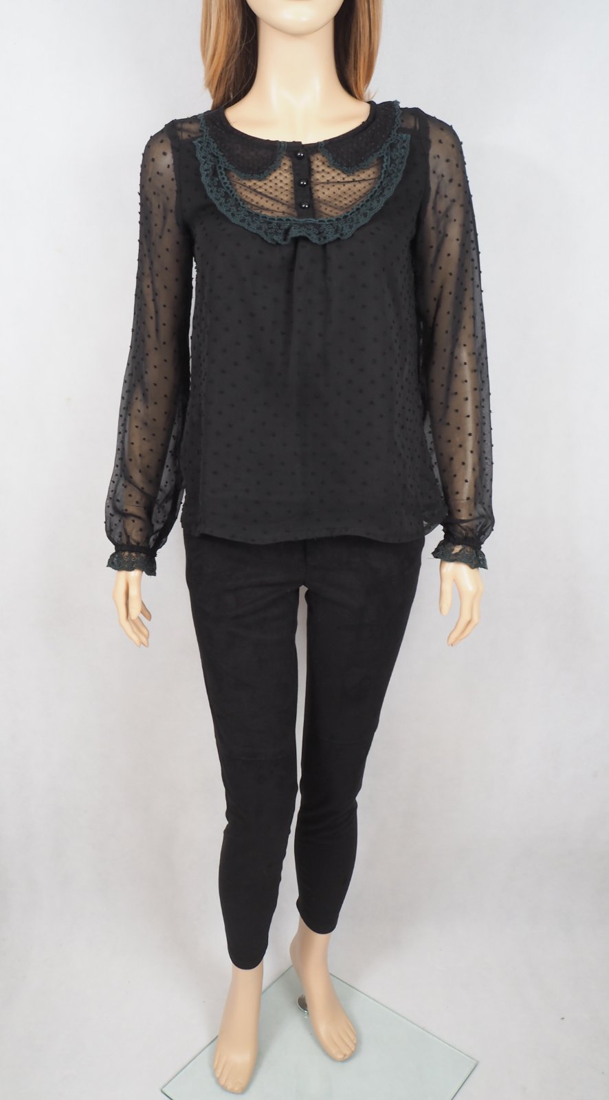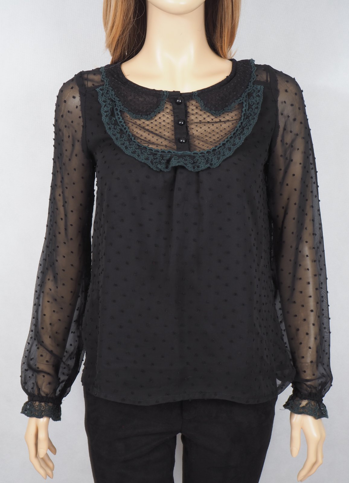 Kvalitná čierna blúzka s čipkou, trupová časť je podšitá, rukávy transparentné, materiál 100% polyester, super stav.