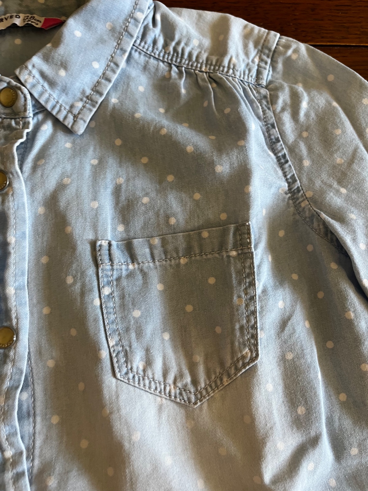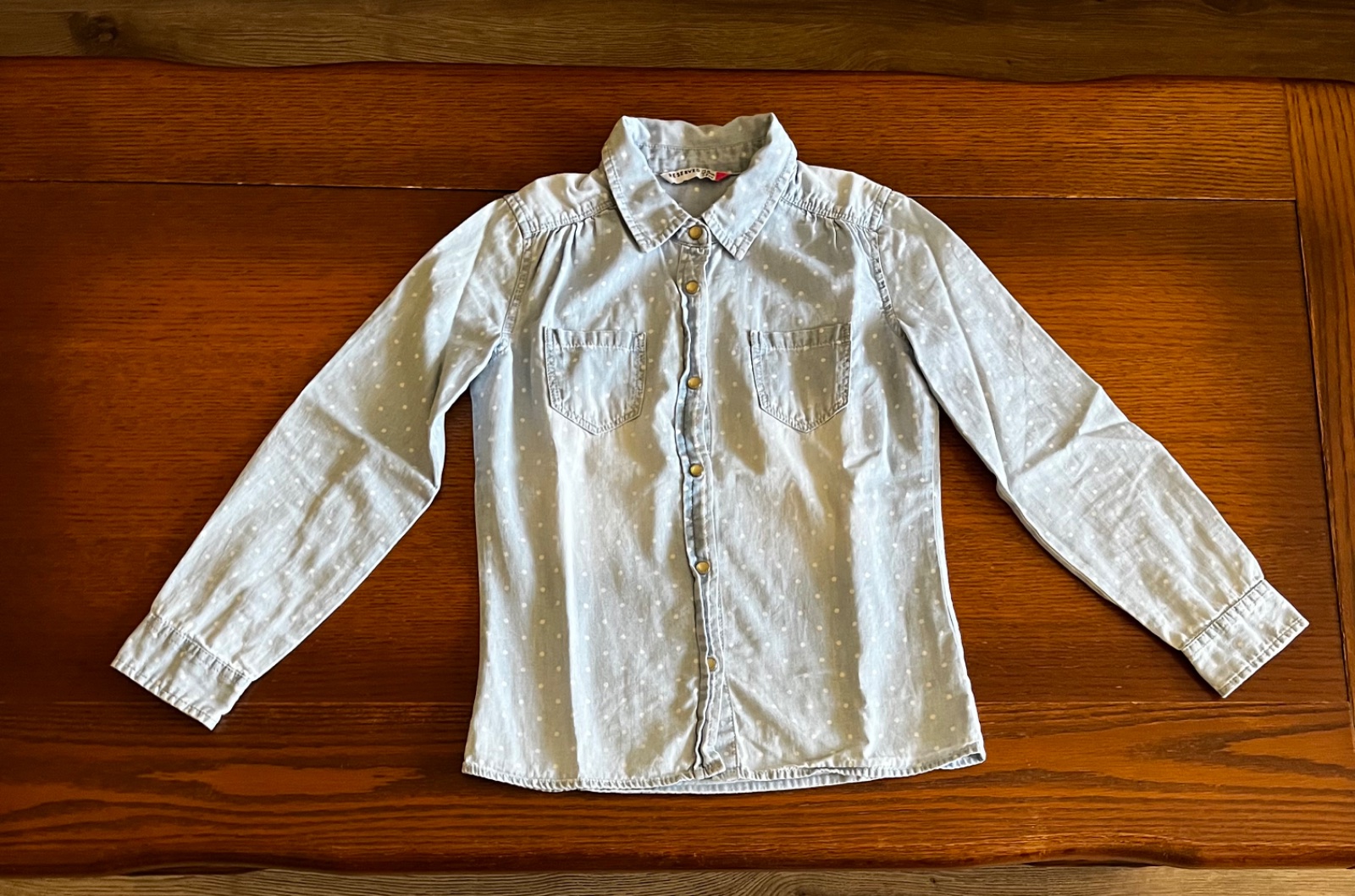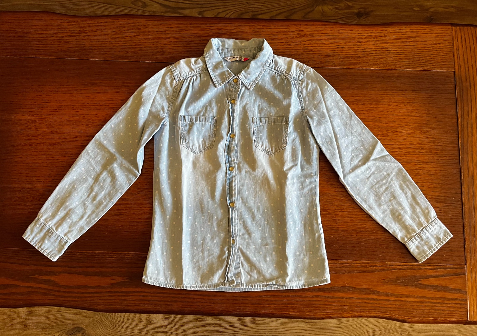 Top stav, párkrát oblečená bodkovaná bavlnená košeľa so vzhľadom rifloviny. Je veľmi jemnučká a mäkučká.