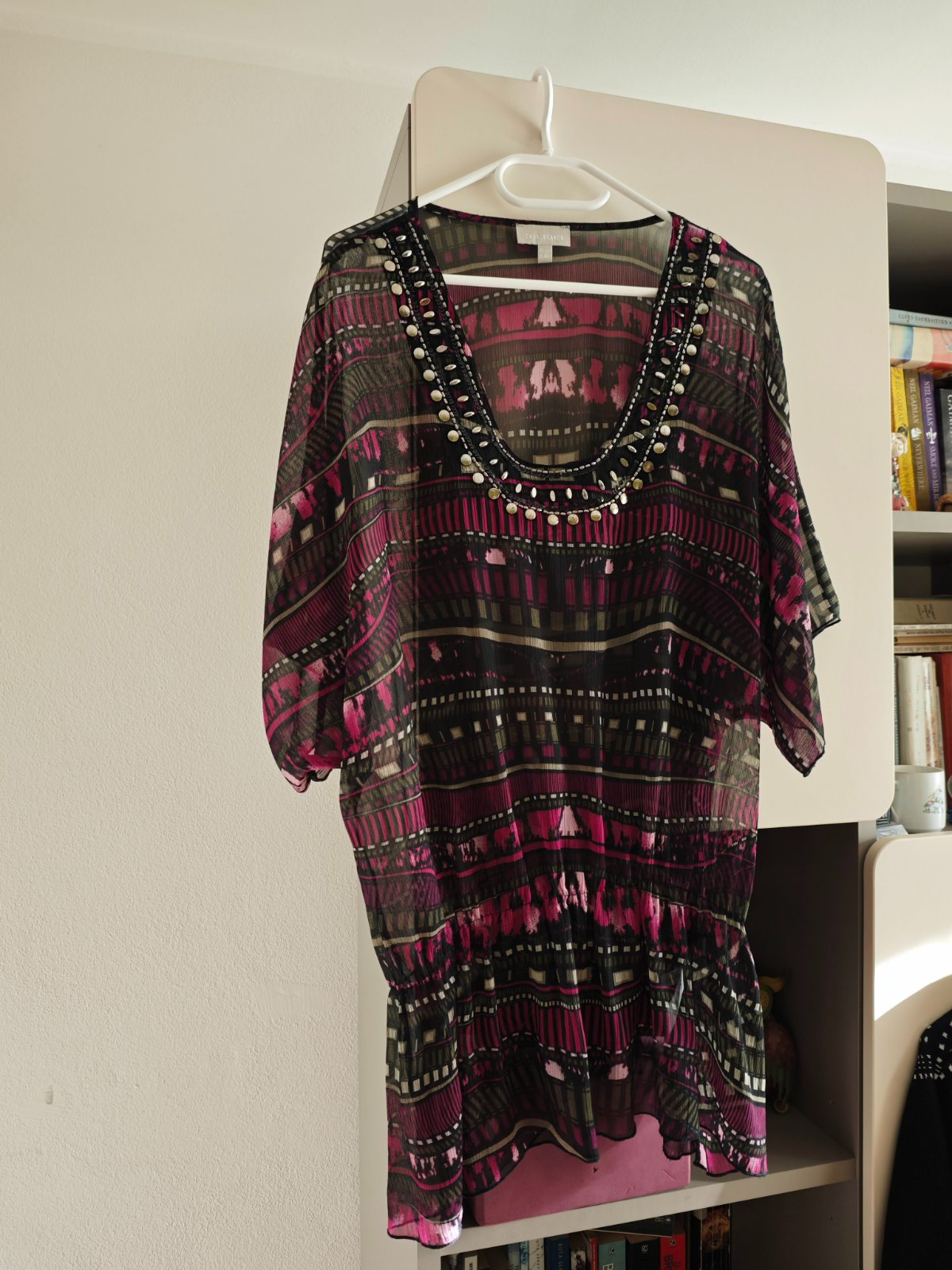 Elegantný plážový top Casa Blanca, dovezený z Kanárskych ostrovov, ľahký vzdušný materiál, 100% polyester, jemná gumička v páse, výborný stav, ako nový. Veľkosť 40/L, dĺžka 80 cm, pod pazuchami 66 cm. Pozri ďalšie inzeráty, viac kusov zľava. Po zaplatení ceny a poštovného na účet posielam aj poštou.