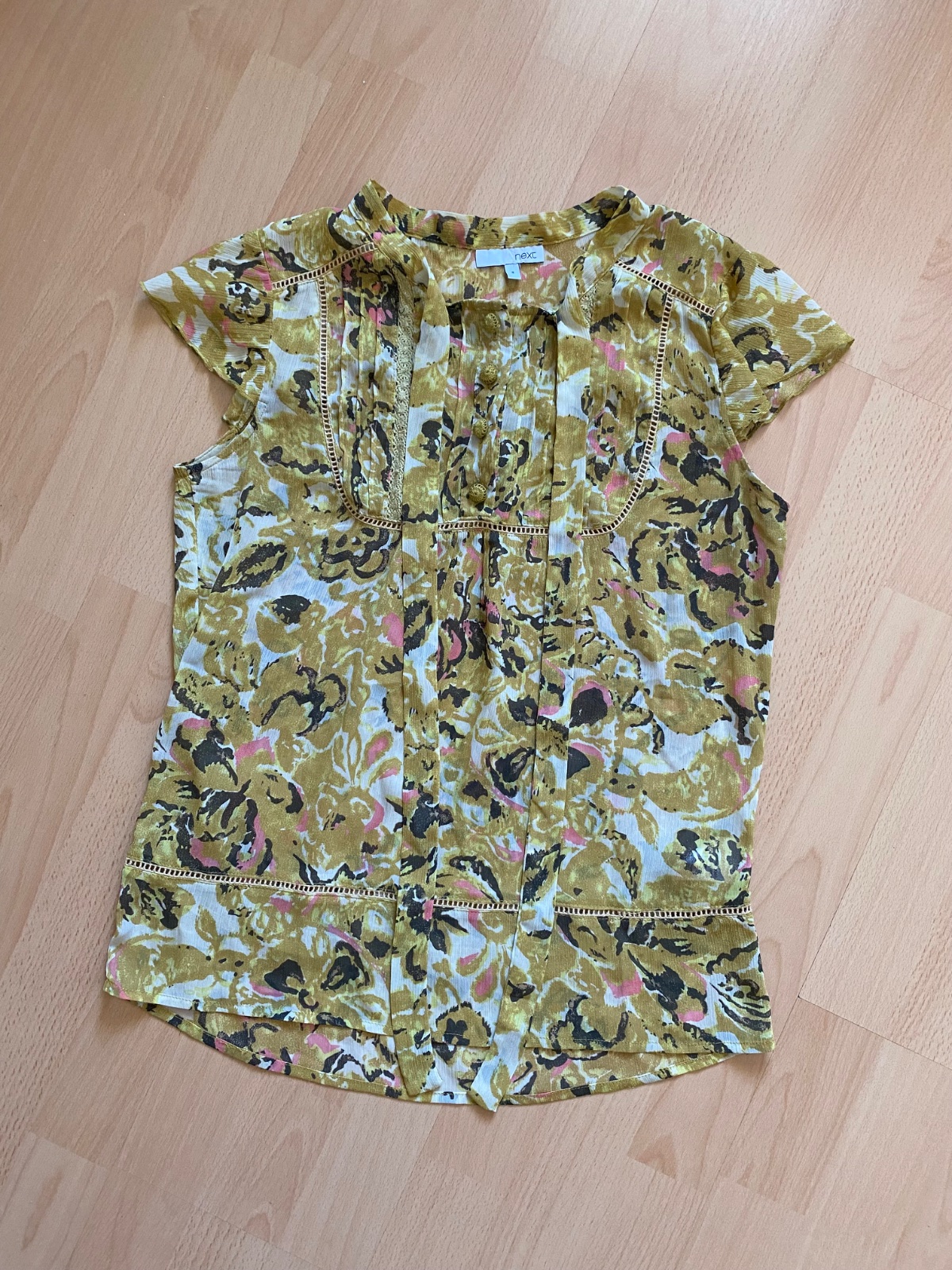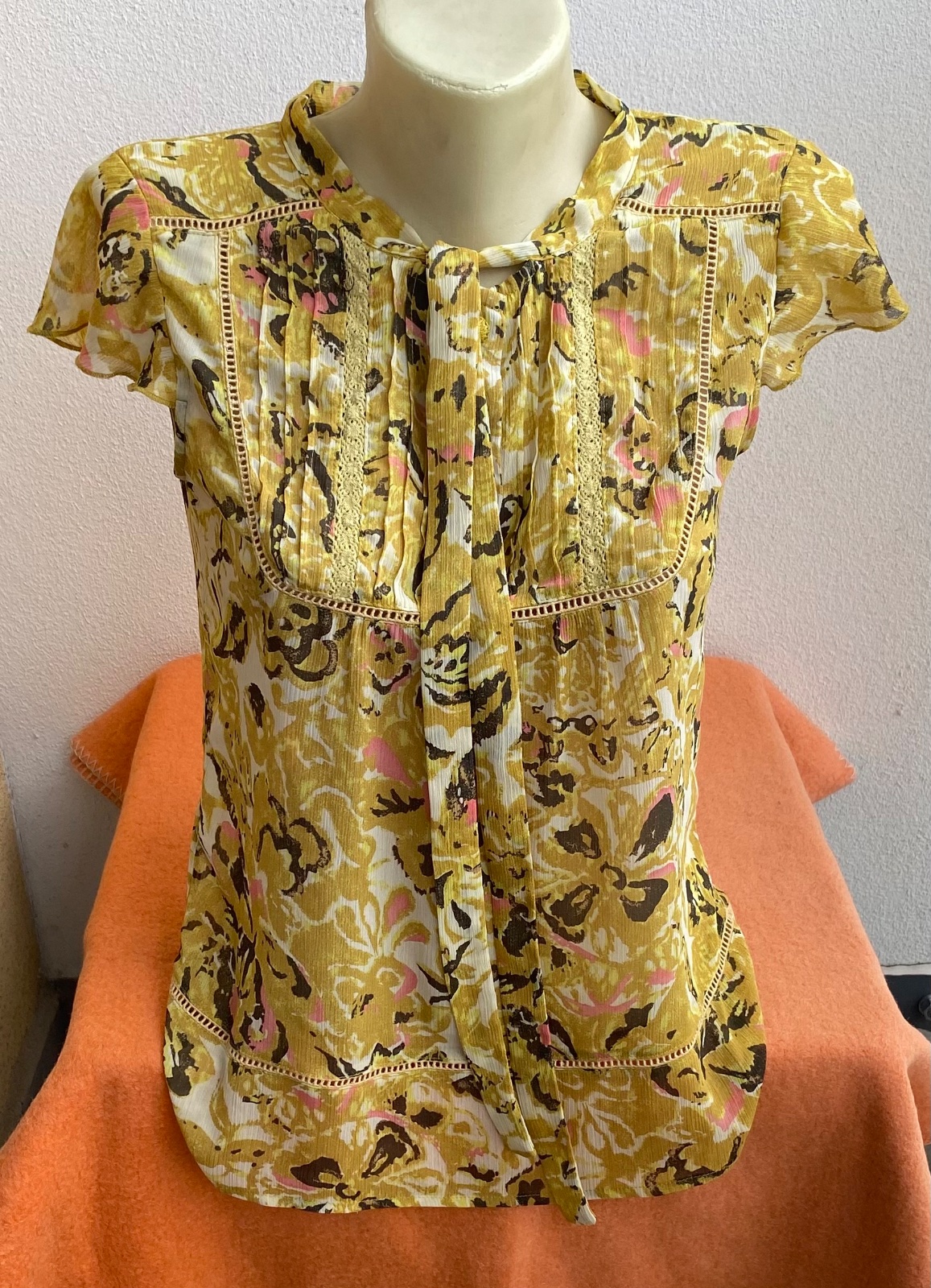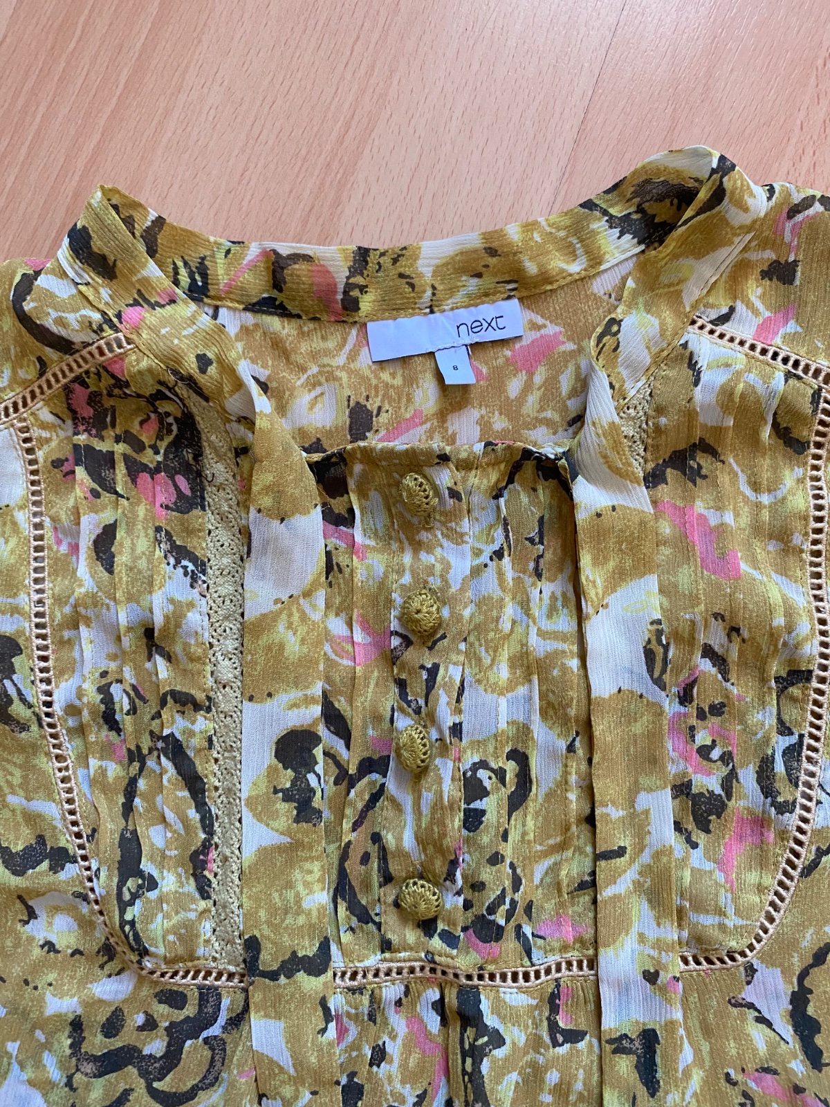 Predám ľahkú minimálne nosenú žltú vzorovanú blúzku / top zn. NEXT veľ. 8 (EU 36), bez poškodenia. Rozmery: ramená 36 cm, hrudník 2 x 45 cm, celková dĺžka 60 cm.