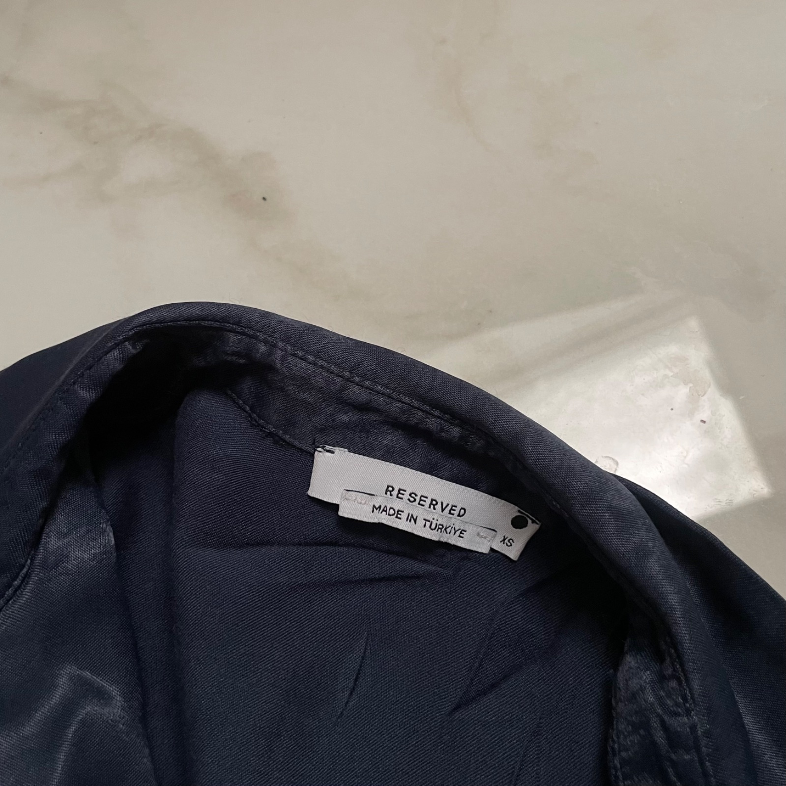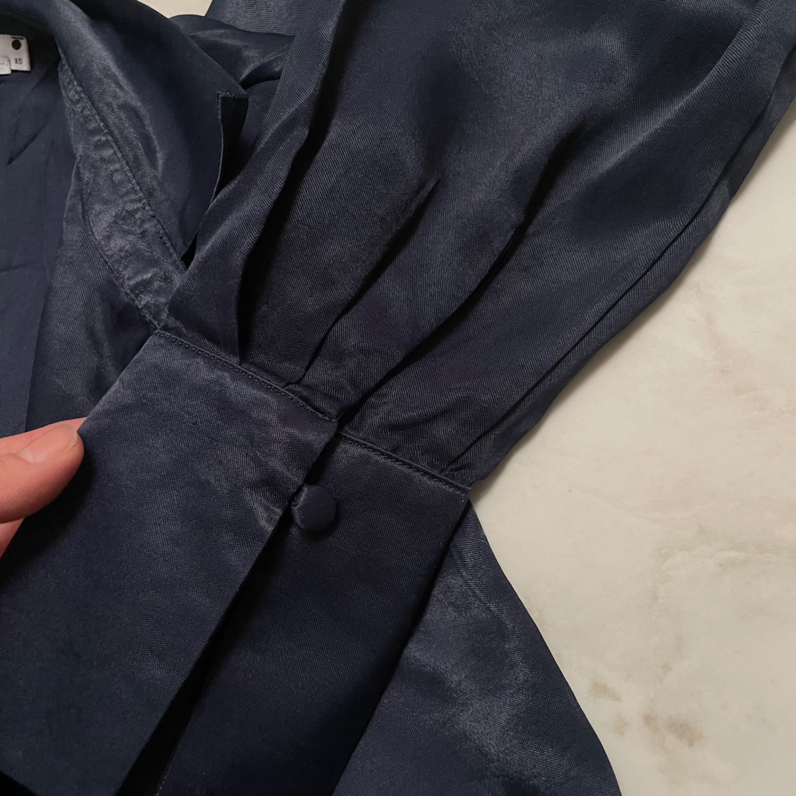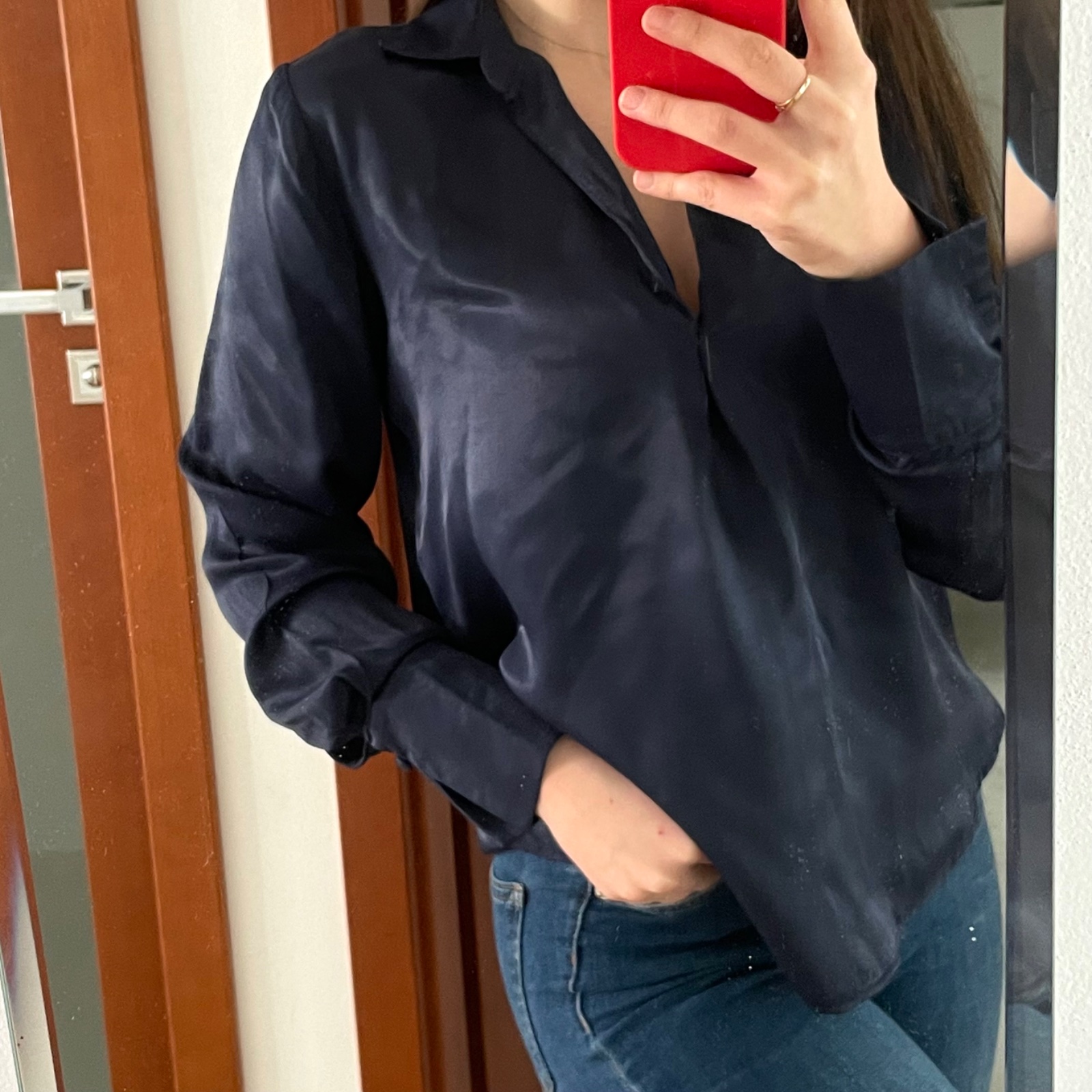 Predám elegantnú saténovú blúzku značky v tmavomodrej farbe. Materiál je jemný, splývavý a príjemný na nosenie, pôsobí veľmi žensky a upravene. Vhodná na bežné nosenie, do práce, ale aj na elegantnejšie príležitosti. Pekný výstrih do „V“, dlhý rukáv s manžetou na gombík.