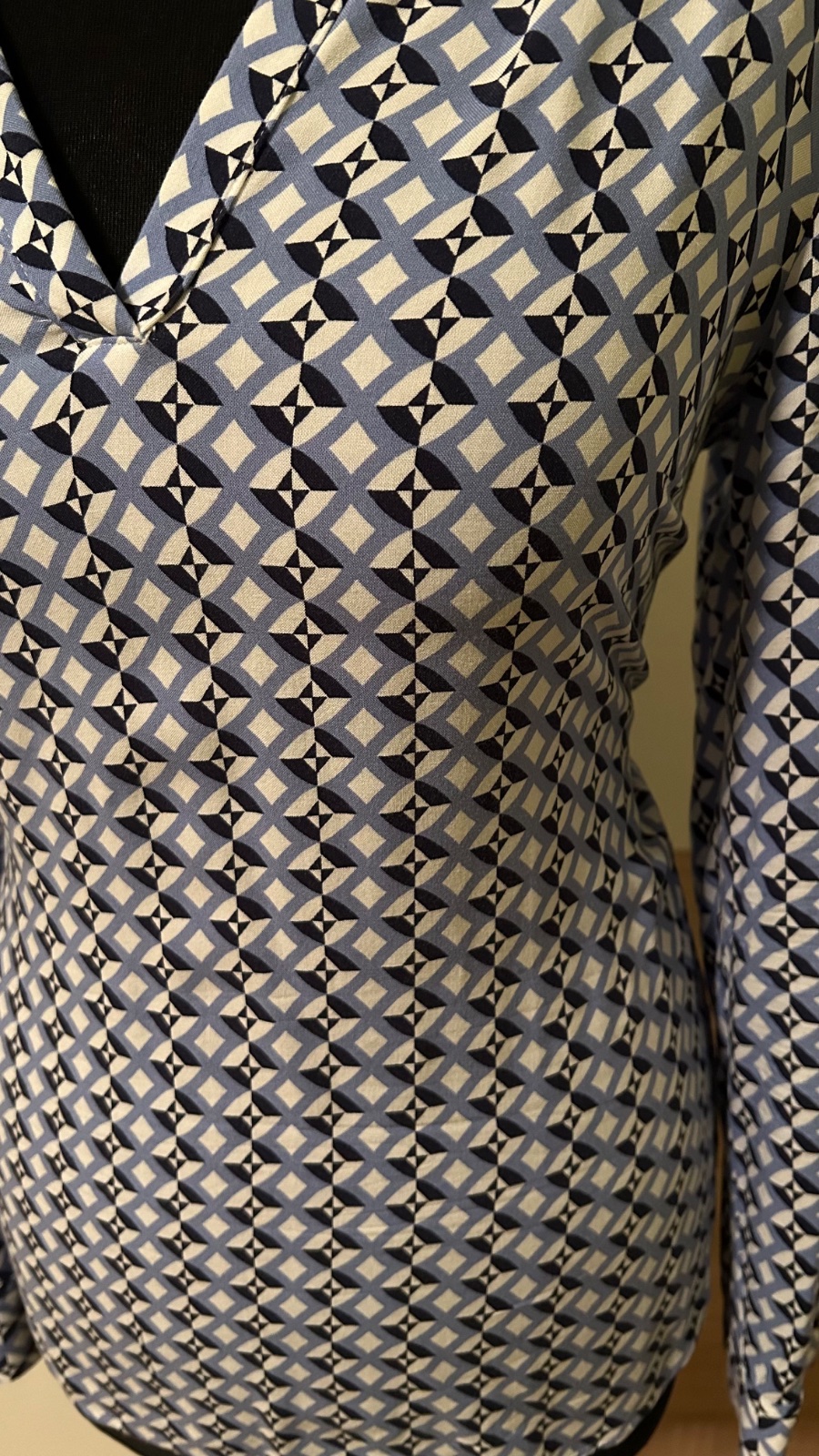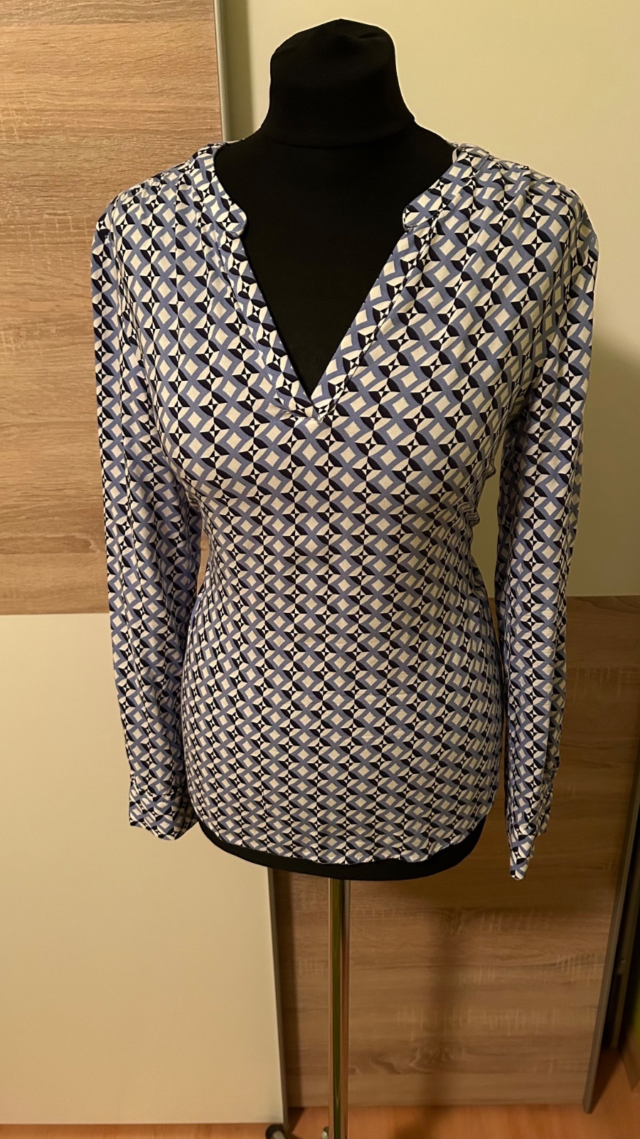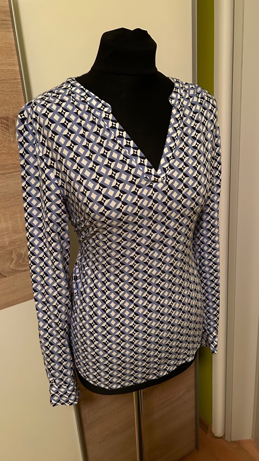 Štýlová dámska blúzka so zaujímavým vzorom zo super materiálu(100%viskóza).Materiál ako stvorený do horúcich dní.Na tele veľmi príjemný.Málo nosená,bežné známky nosenia