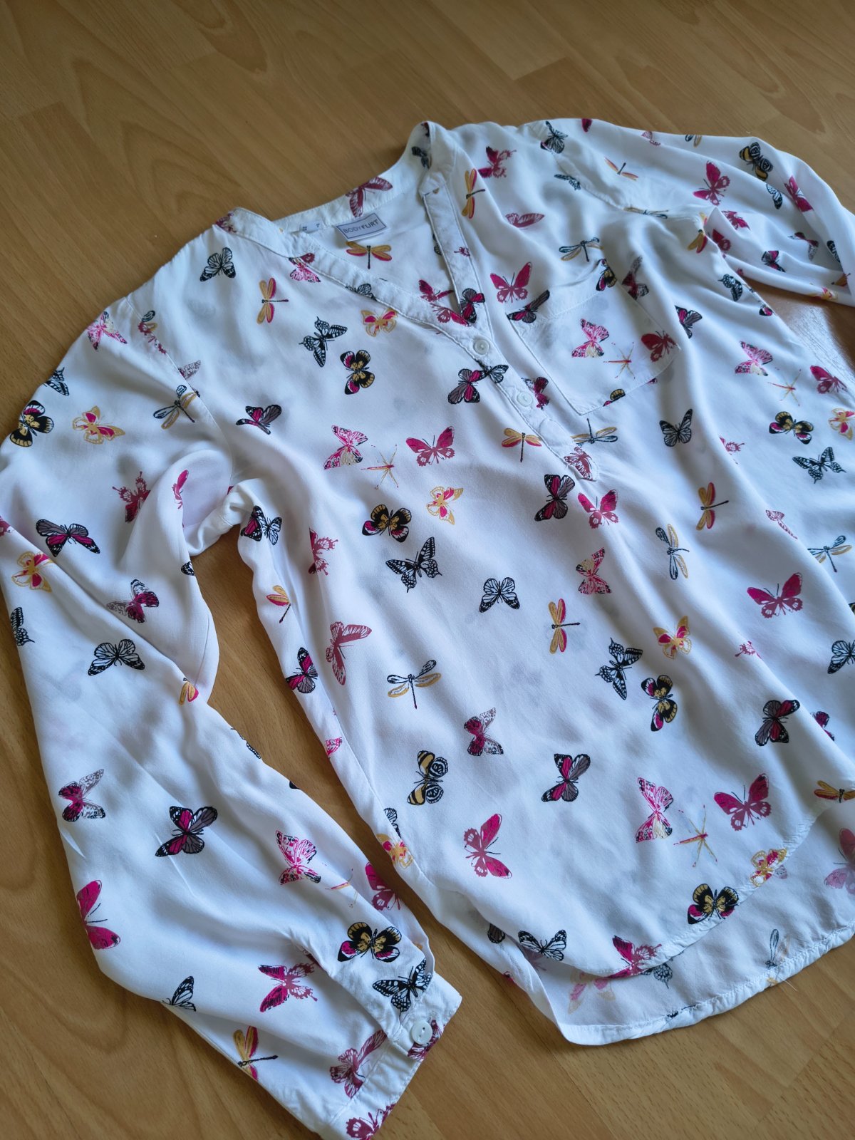 Snehobiela blúzka s farebnými motylikmi, veľmi príjemný materiál, oblečená párkrát, v top stave
