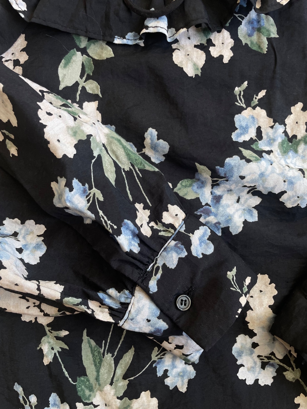 Vzdusna ackova bluzka, farba cierna s peknou kvetinovou potlacou, dekolt nariasena popresivana gumicka s viazackou, doplnena o volan, rukav zapinanie na gombicek, velmi prijemna viskoza, neposkodena