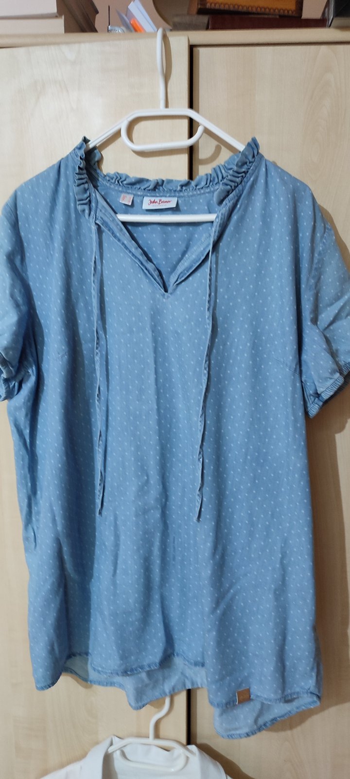 Bledozelený topík, značka Bonprix, veľkosť 46/48, elastický, prispôsobí sa, bez poškodenia. Rozmery: - šírka podpazušia: 2 x 58 cm v kľude, povolí na 2 x 65 cm - dĺžka: 69 cm