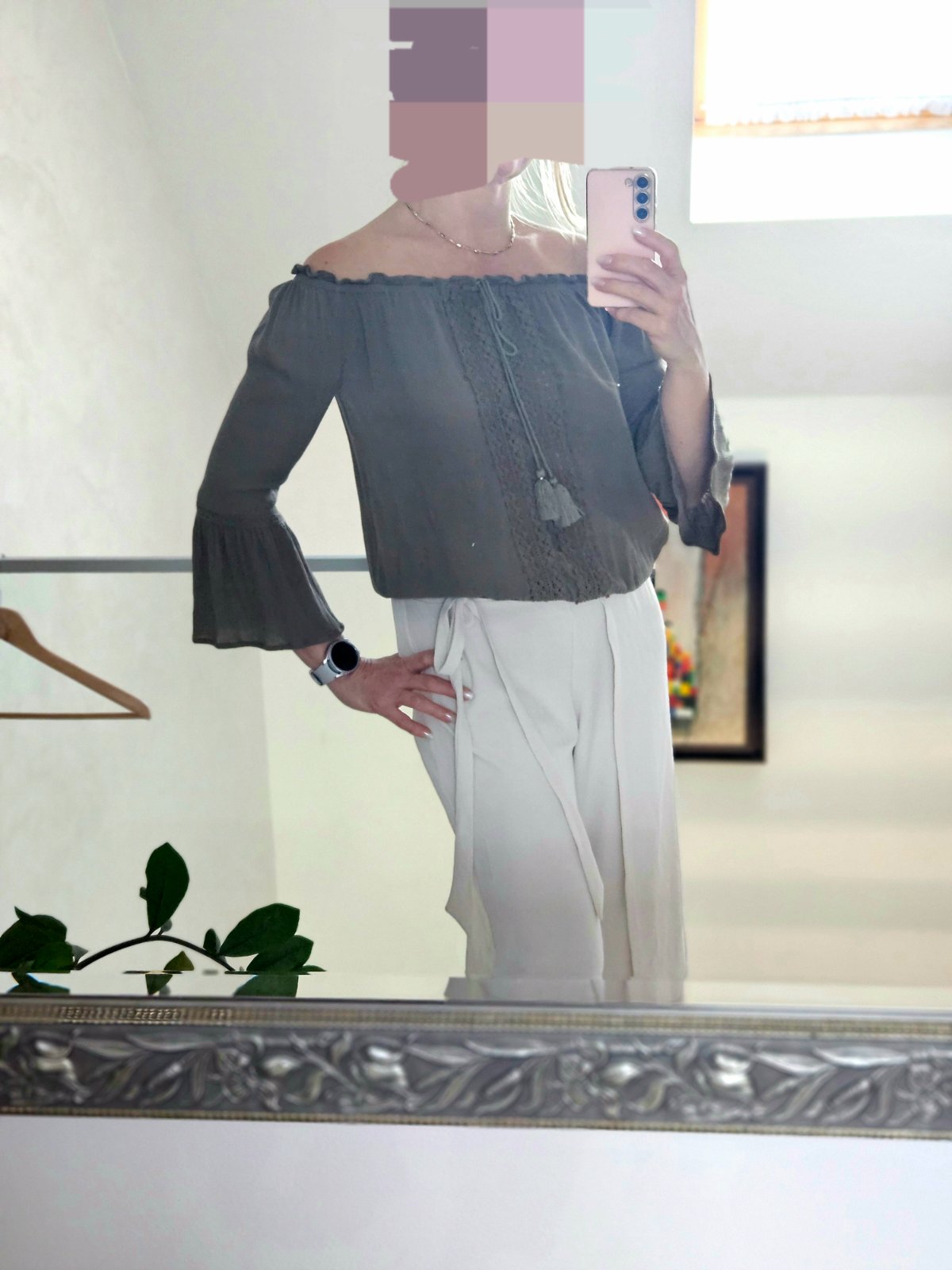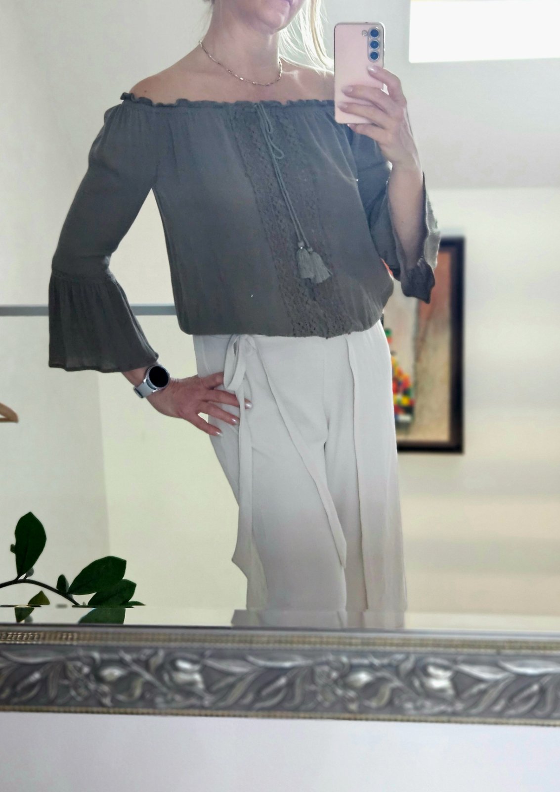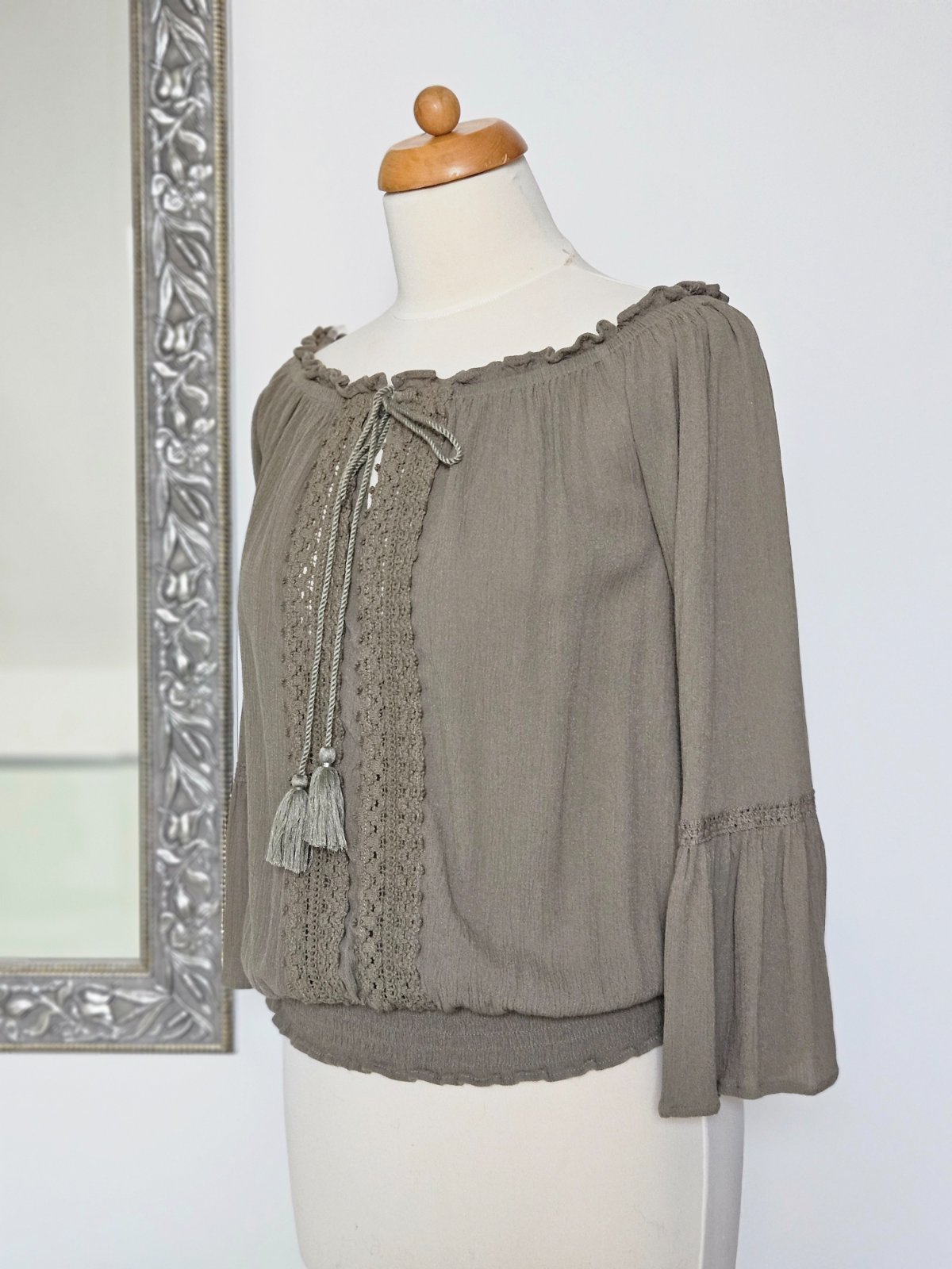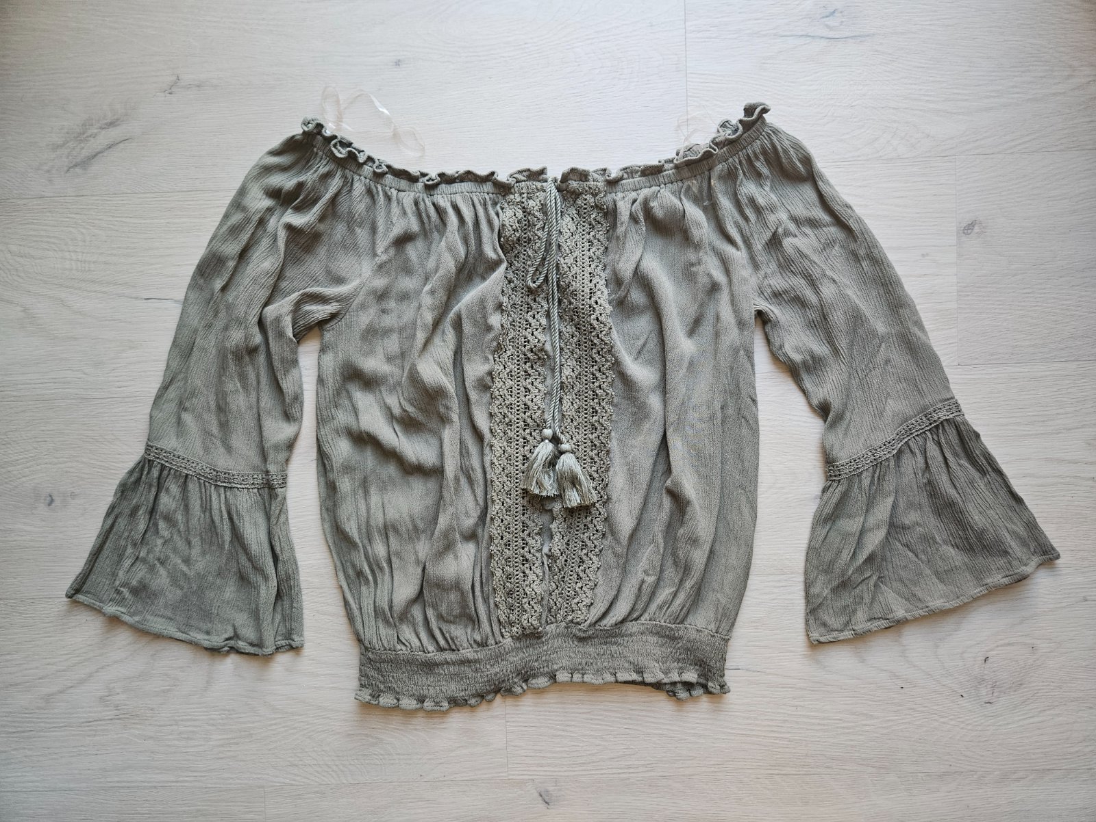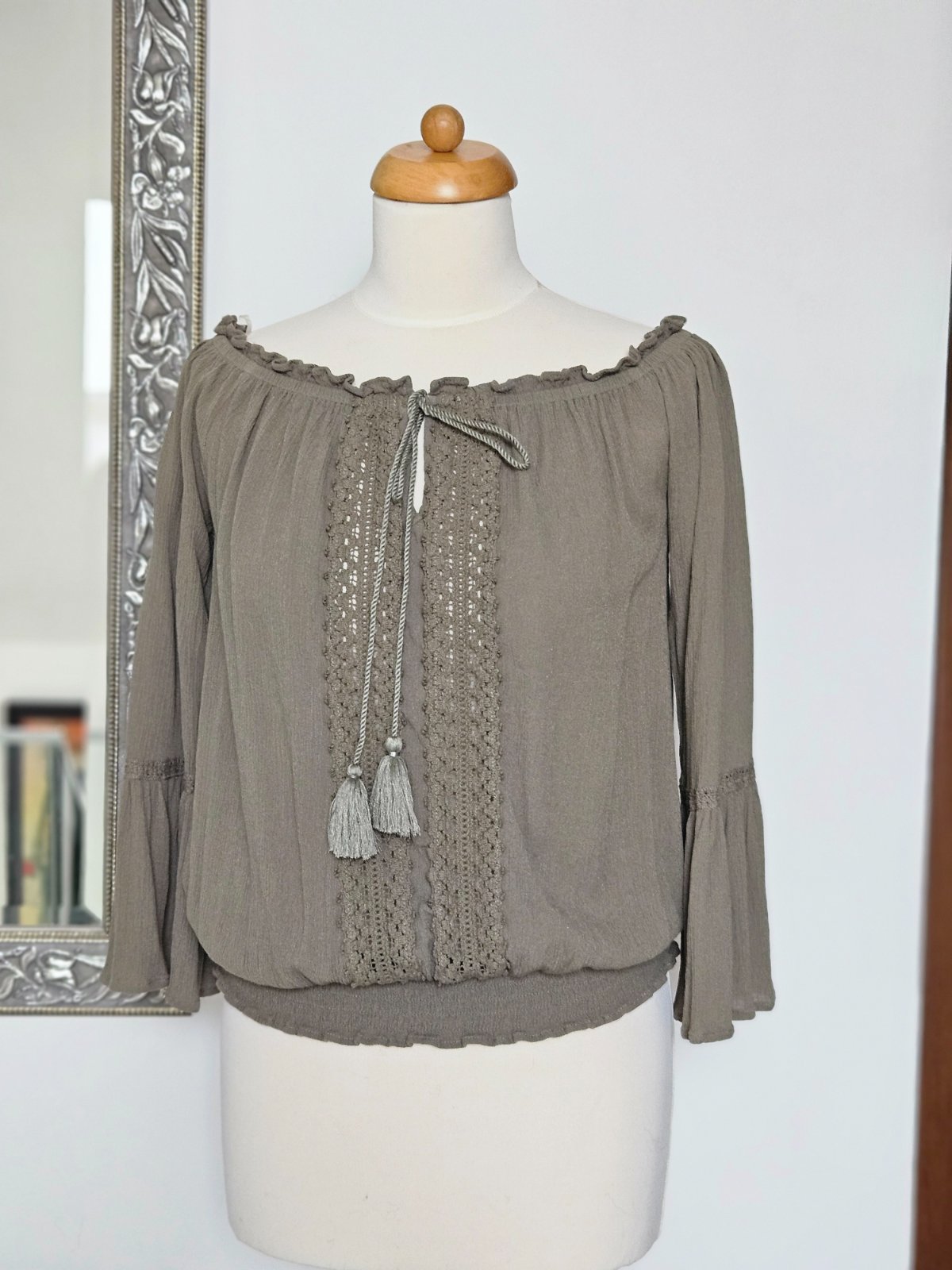 Khaki zelená (olivová) ľahká blúzka, top z balvlny, ideálna na leto. Padnuté ramená, dekolt na prispôsobenie šnúrkou. 3/4 volánové rukávy. Veľkosť 38-40