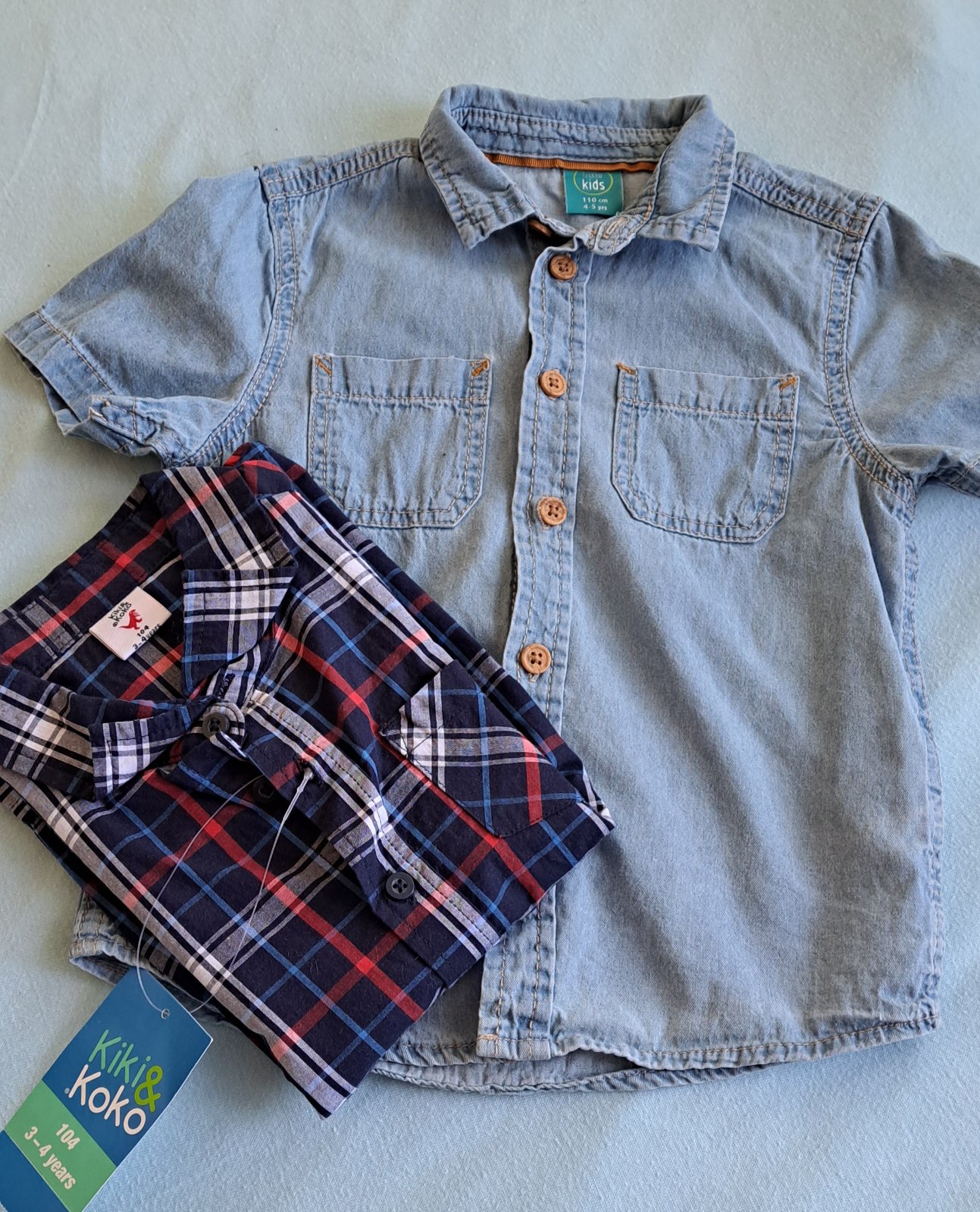 Posuniem košieľky veľkosť 104, riflova je s krátkym rukávom oblečená asi 1x, kockovana z dlhým rukávom s vysačkou. Cena za kus 5eur, cena spolu 8 eur