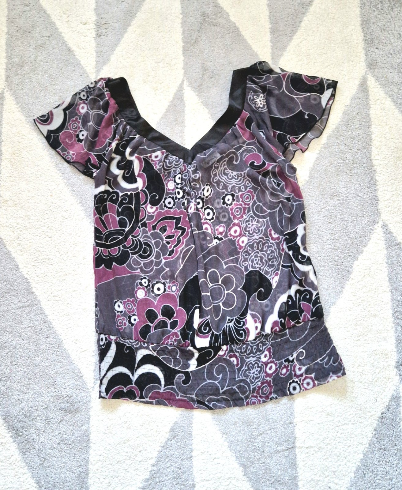 Nosená sporadicky, bez akýchkoľvek známok opotrebovanosti alebo kazov. Blúzka s hlbokým véčkovým výstrihom zn. Pimkie. Veľkosť S. Polotransparentná, neelastická, dá sa nosiť aj na spôsob spadnutých ramien. Materiál: 100% polyester. Rozmery: šírka plecia 2x45cm, celková dĺžka 50cm.