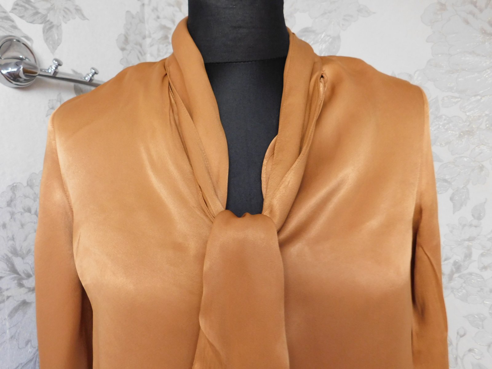 Velmi pekná jemná blúzka, zaujímavá, vpredu dlhšia, dá sa uviazať, alebo iba tak rukávy sa dajú zaviazať. Vpredu zlatá aplikácia do V výsytihu. Štítok odstrihnutý.