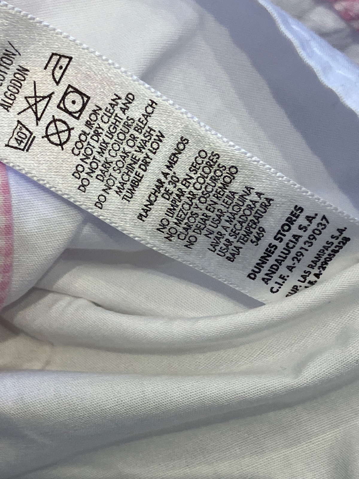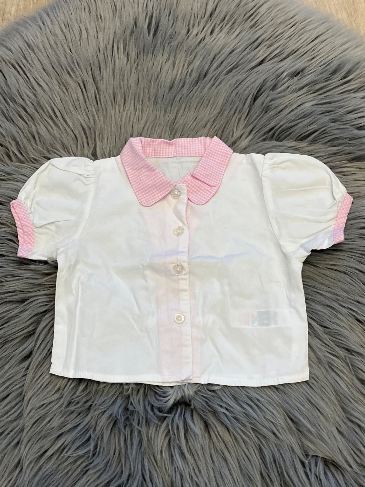 Dievčenská košeľa s krátkym rukávom, vzadu na chrbte a elastickou gumou, nie je elastická, zapínanie na gombíky, farba biela goliere bielo ružová, pre 6-9 mes., materiál 100% bavlna.
