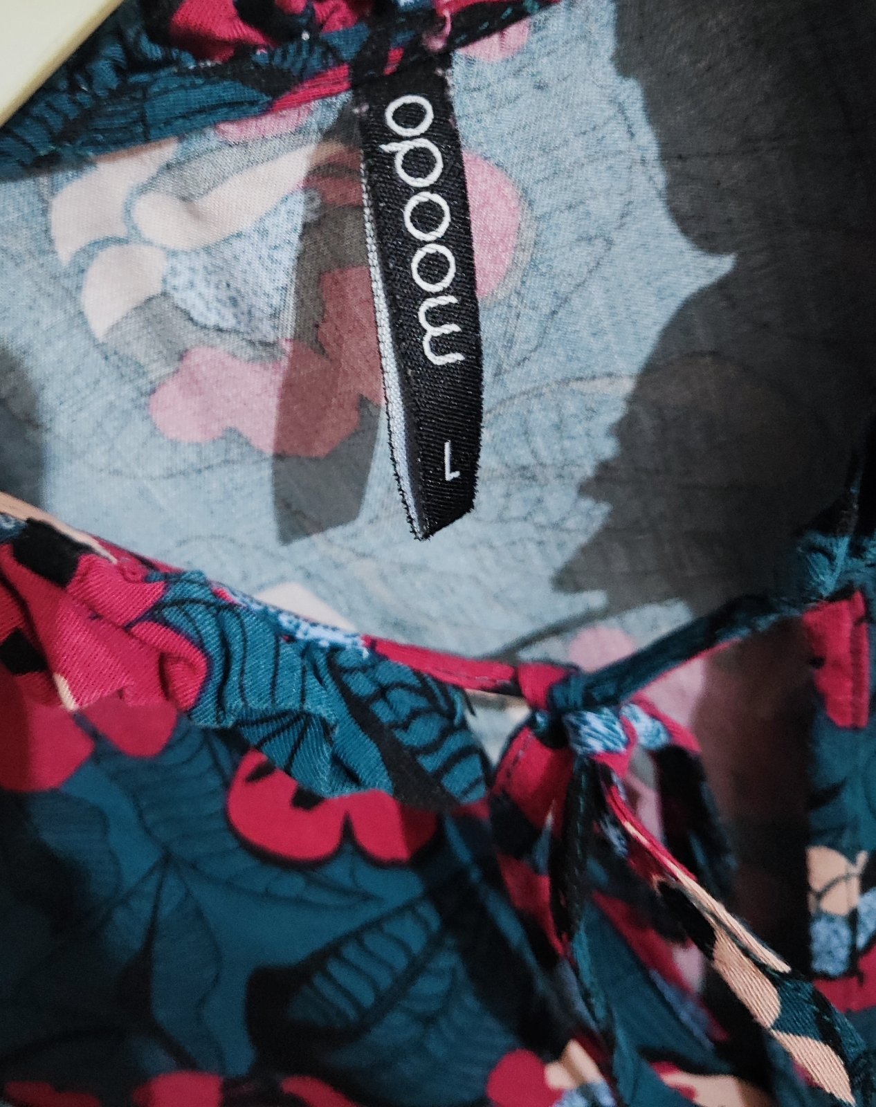 Príjemná, ľahká, bavlnená blúzka s kovovými gombíkmi a volánikmi vo výstrihu, rukávy aj spodok do gumy. Sedí na väčšie M, alebo L. Oblečená 2x. Nenáročná údržba.