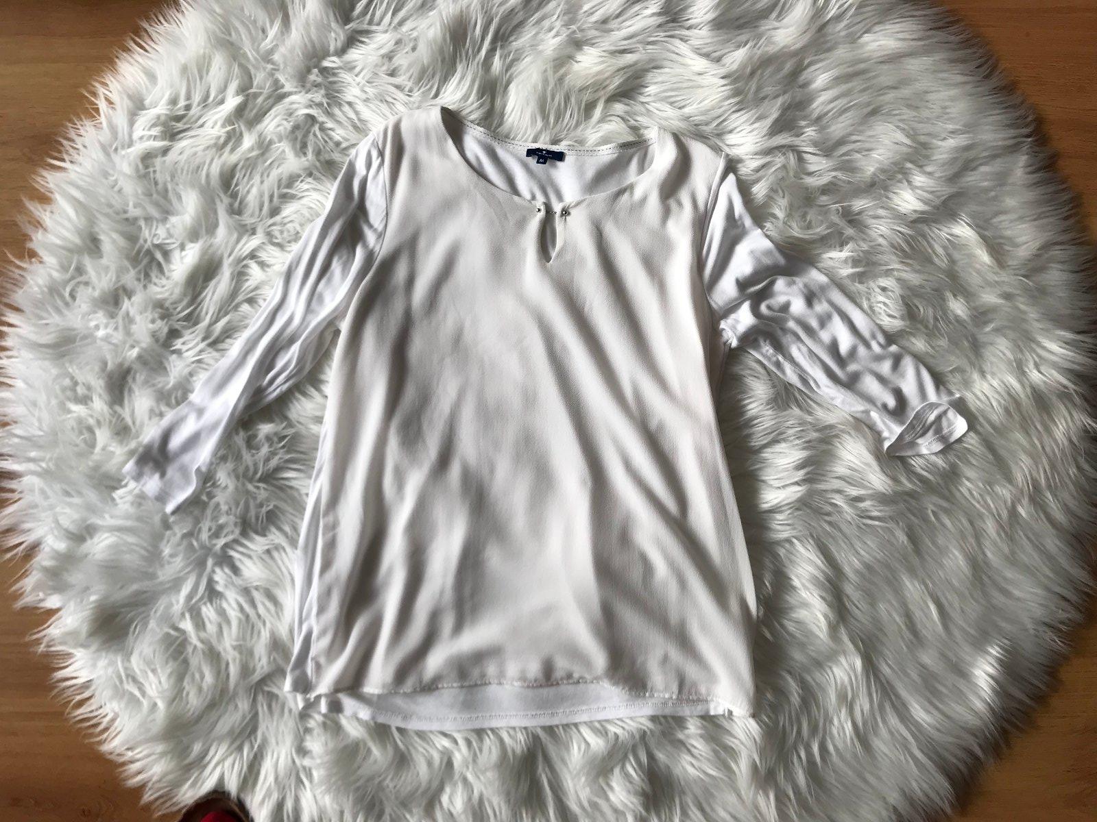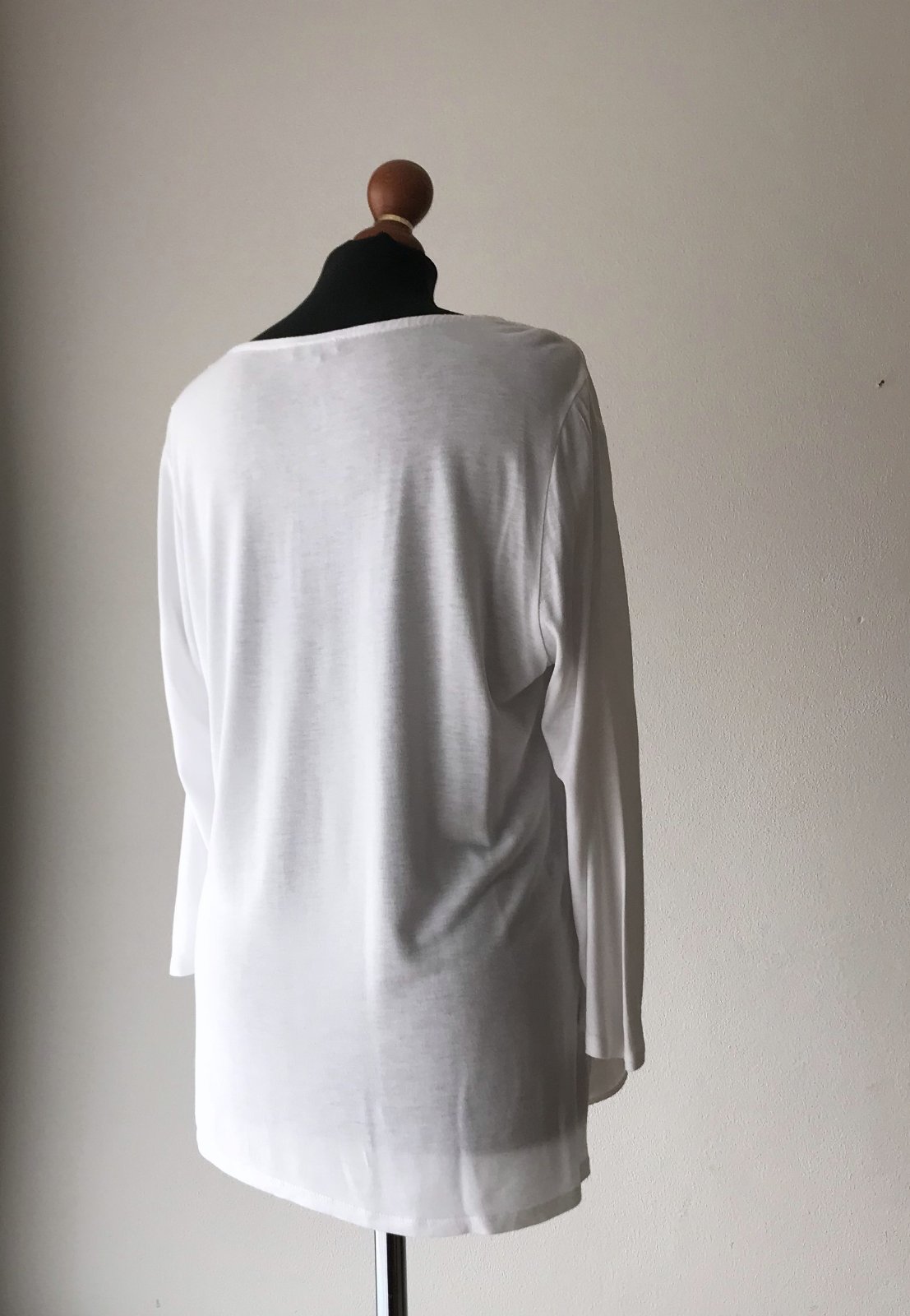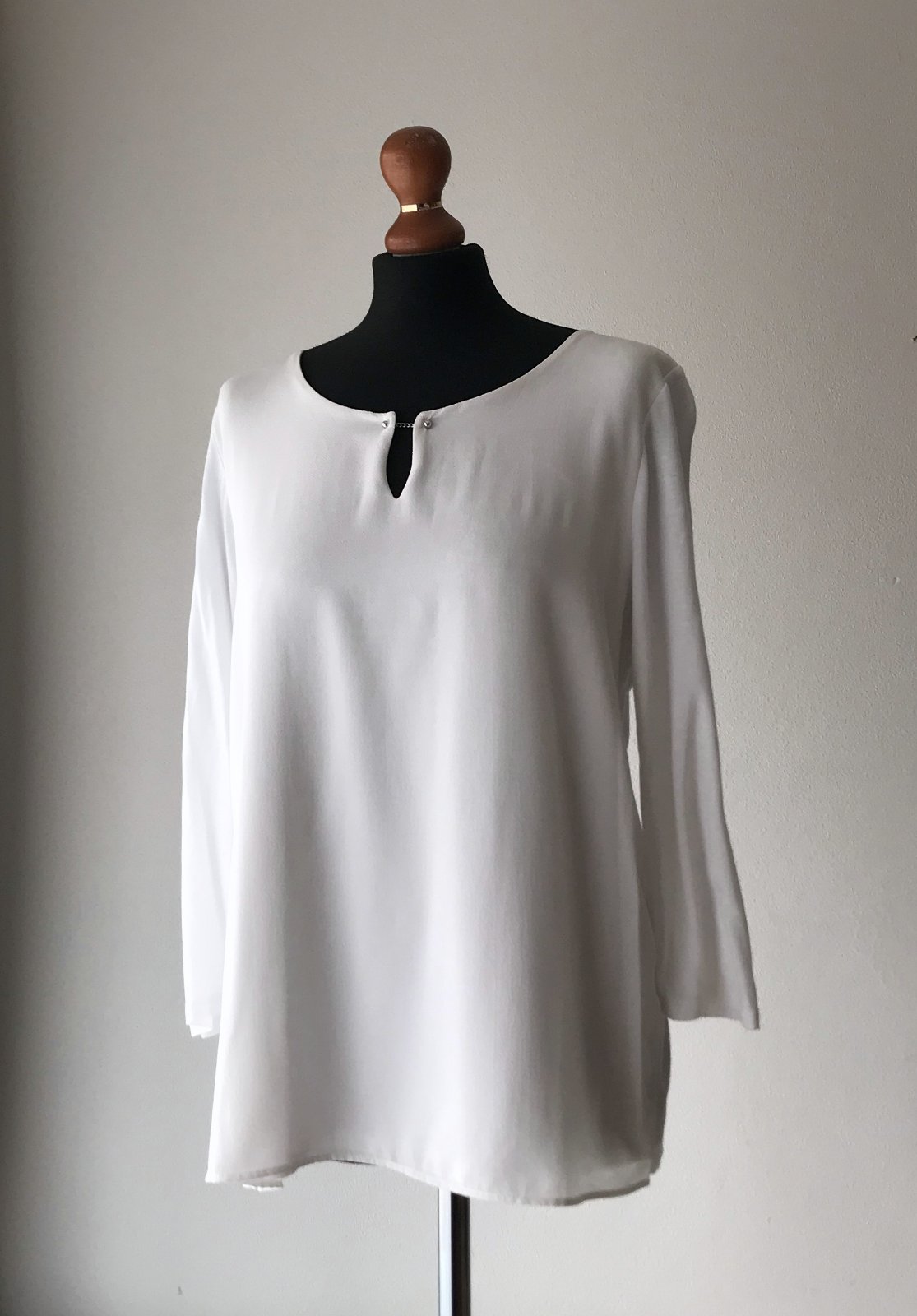 Predám krásnu a nadčasovú bielu blúzku. Blúzka má veľmi ženský, jemne voľnejší strih, ktorý krásne splýva a prispôsobí sa postave. Je vyrobená z kvalitného, príjemného materiálu. Dominantou je elegantný okrúhly výstrih s decentným rázporkom (keyhole) spojeným strieborným kovovým detailom, vďaka čomu nepotrebujete k outfitu žiadny ďalší náhrdelník.