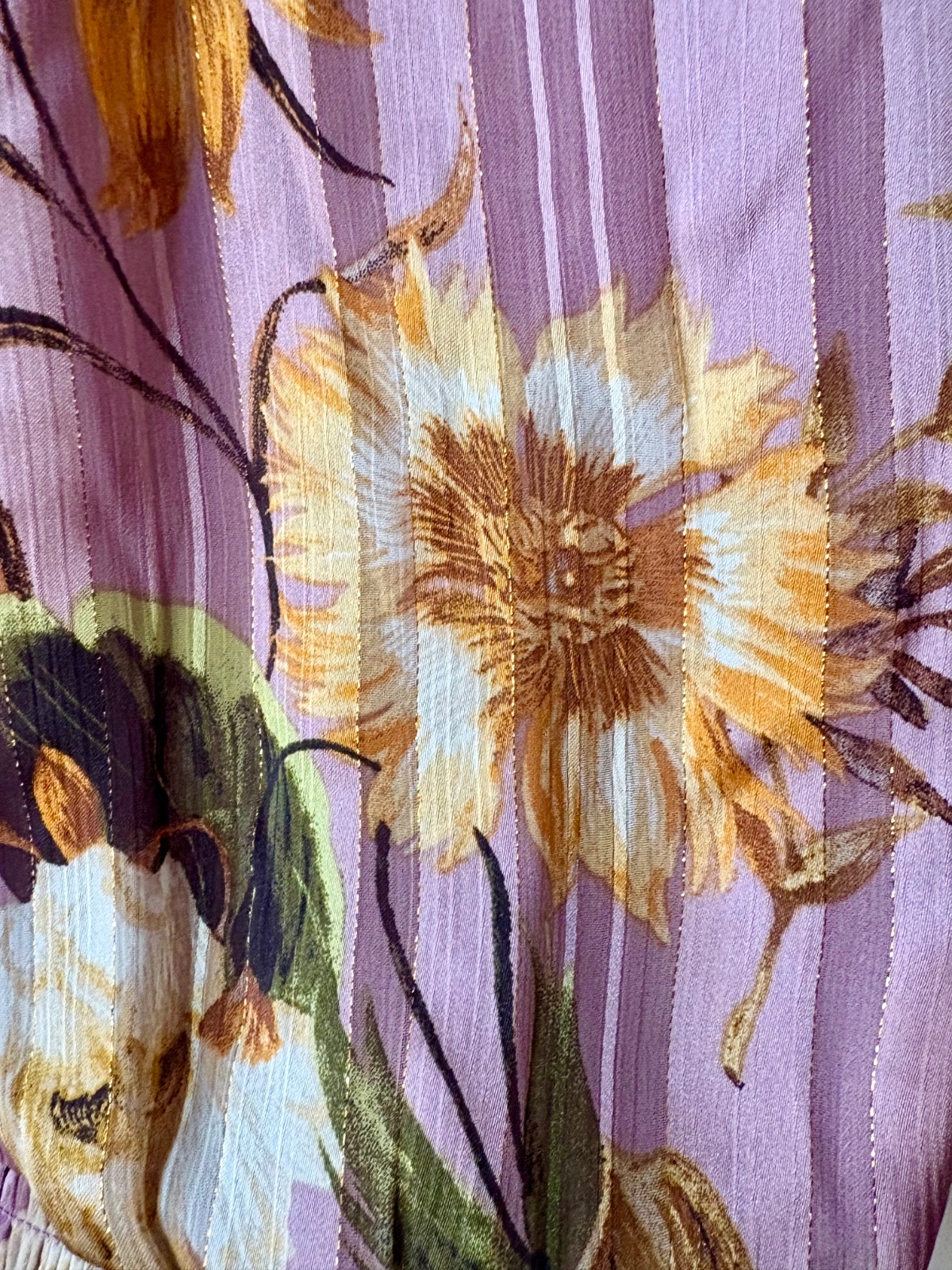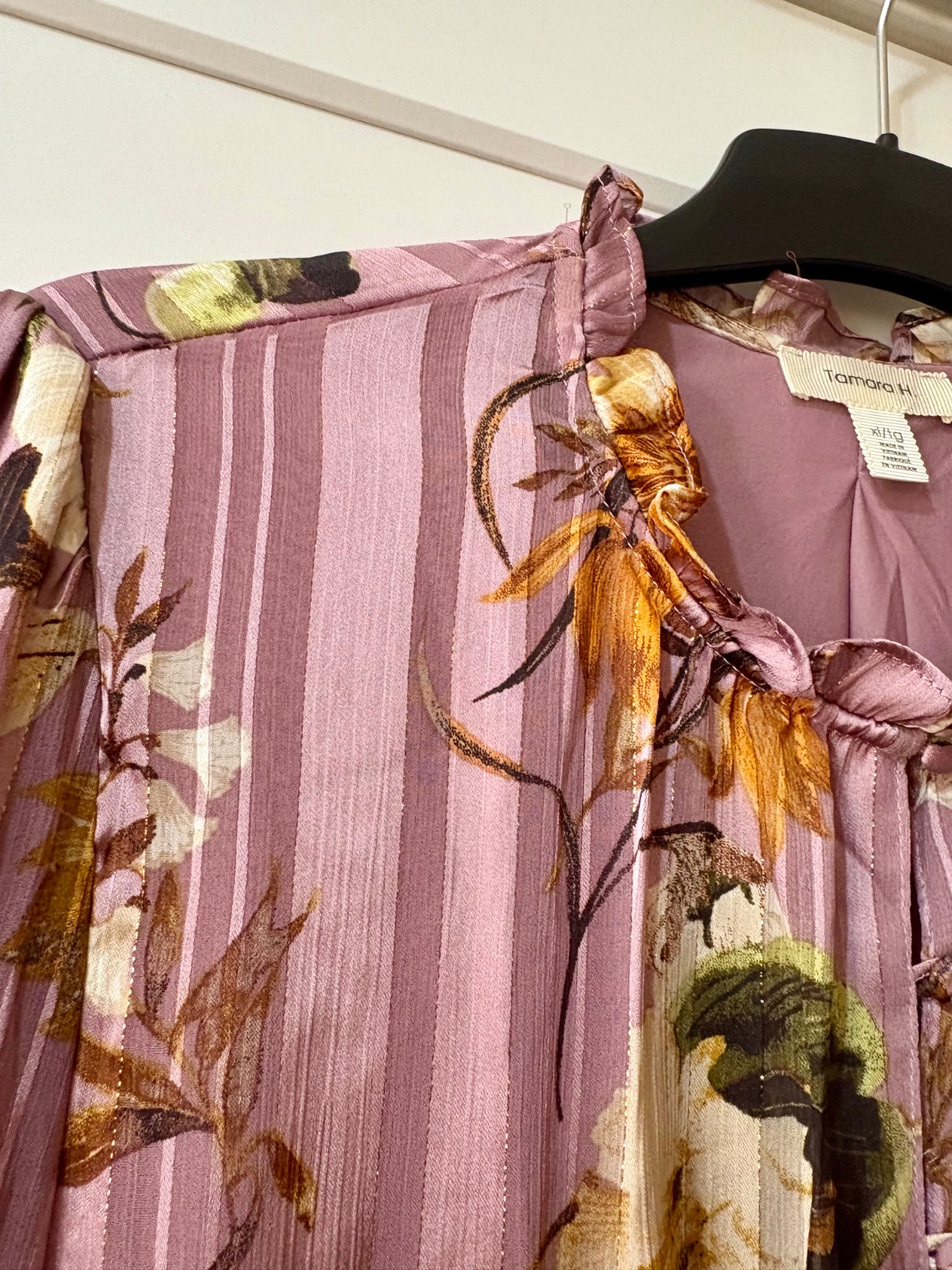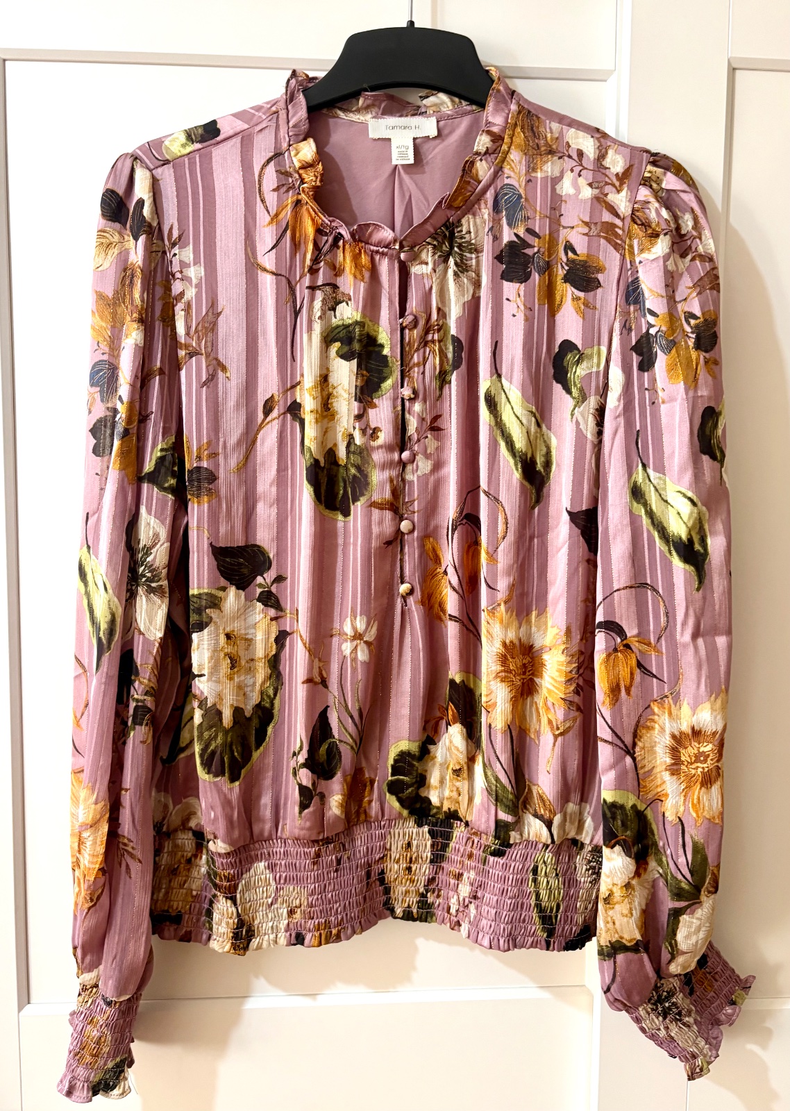 Nádherná elegantná blúzka kúpená v Amerike Veľ. XL.Top stav,naspodku stiahnutá aj na rukávoch..gombíky potiahnuté látkou..v látke je aj zlaté vlákno.