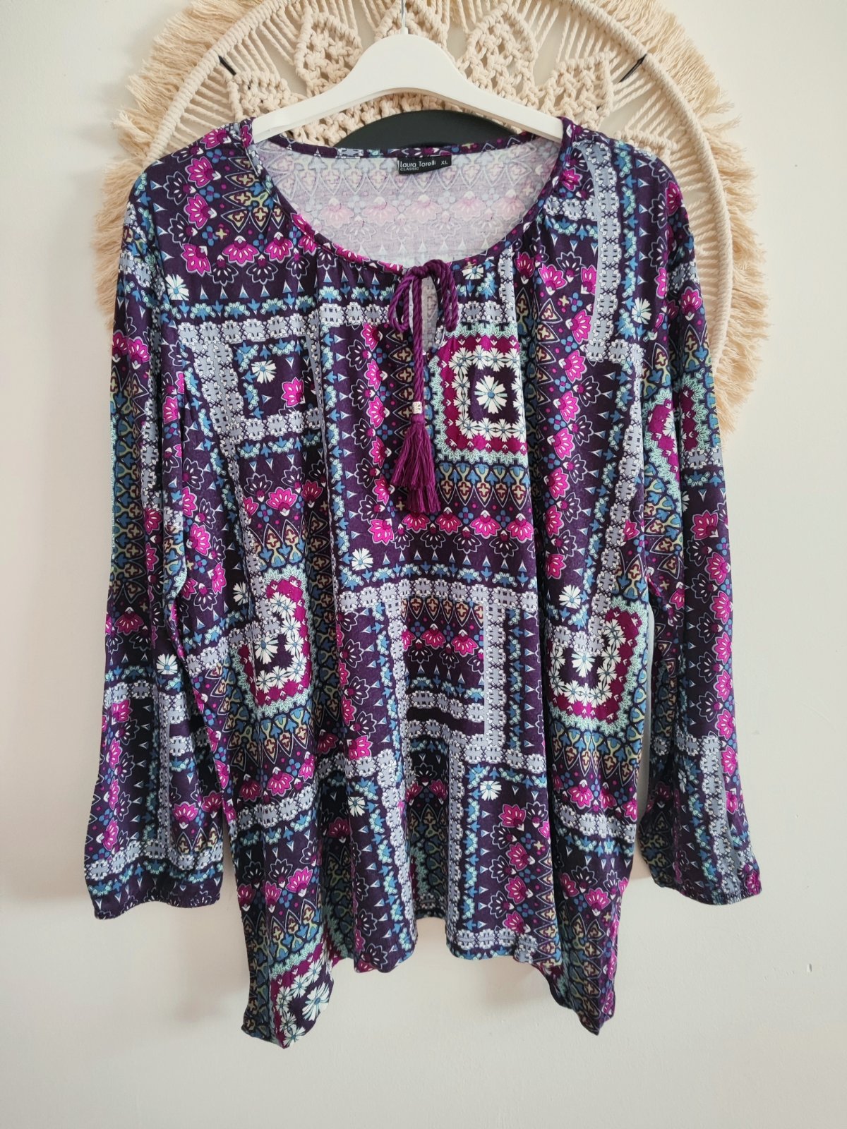 Trištvrťová tmavomodrá blúzka s gumičkou na spodku. Rozmery sú približné, roztiahne sa na viac: Dlžka: 68cm Šírka: 50cm Dlžka rukáva: 47cm Šírka rukáva: 19cm