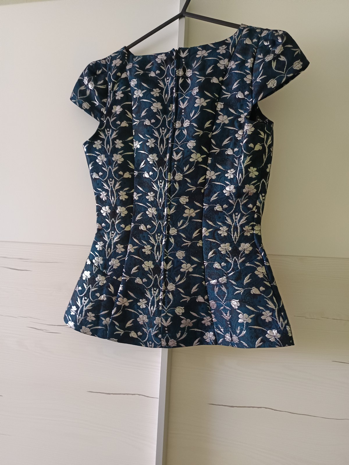 Predám smaragdovú blúzku so striebornými kvetmi. Veľkosť je 34, značka Orsay. Zapínanie vzadu na zips.