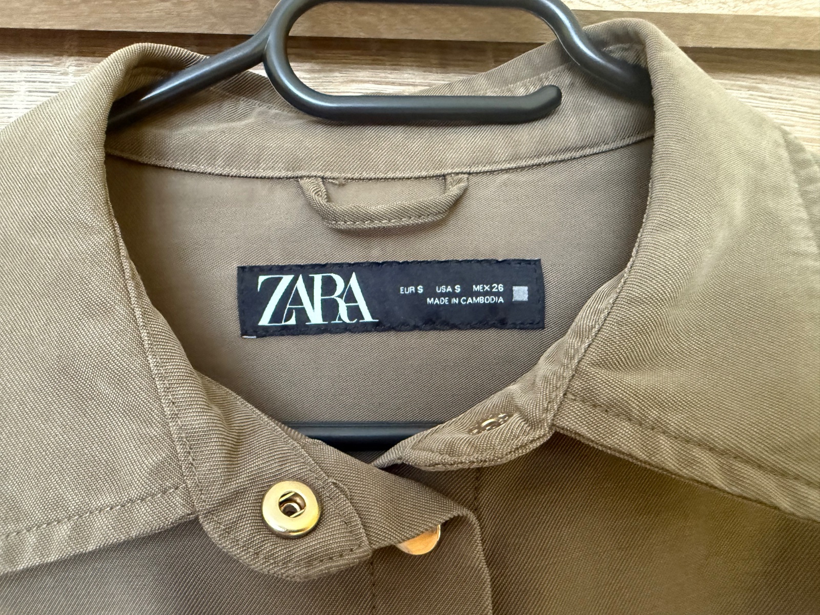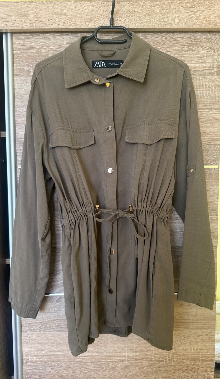 Nenosený, iba vyskúšaný top v khaki farbe. Zapínanie na cvoky, v páse sa sťahuje a uväzuje. Rukávy sa dajú vyhrnúť a zapnúť.