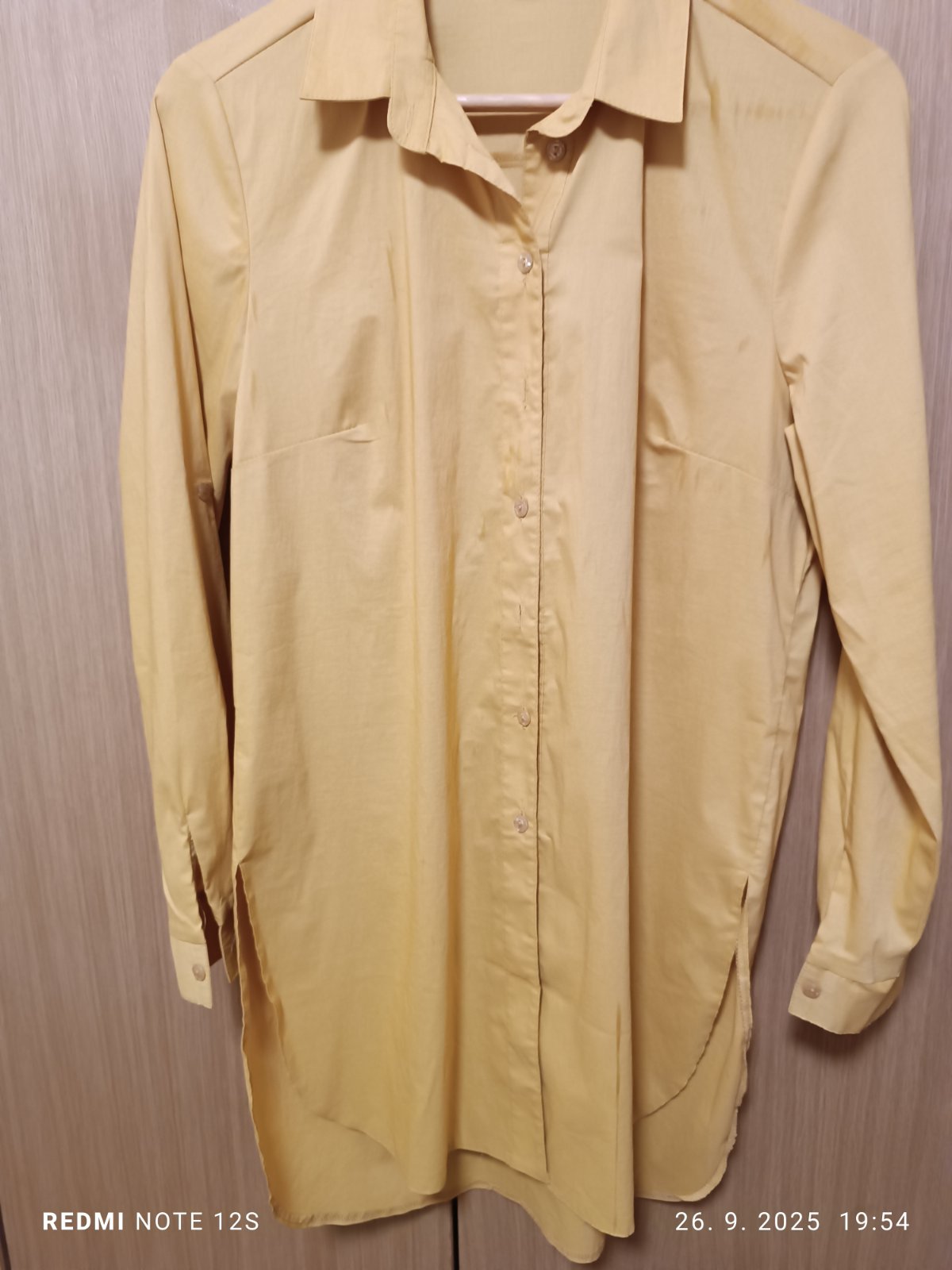 Dámska košeľa s dlhým rukávom, predĺžená,na bokoch razporky strihnuté do oblúka, dĺžka 87cm, šírka 50cm, rukáv 58cm-da sa vypnúť na trojštvrťové,rameno 12cm.