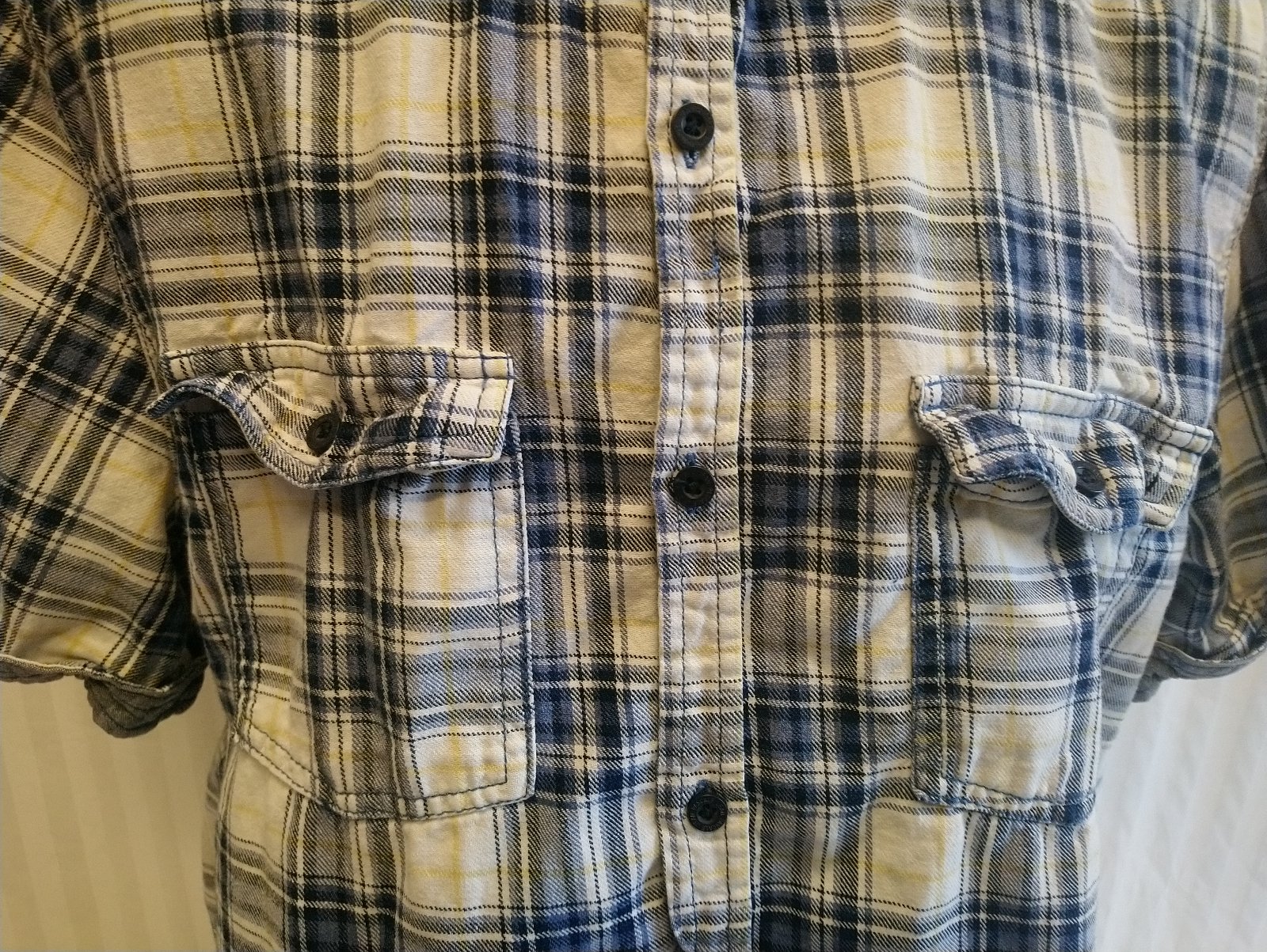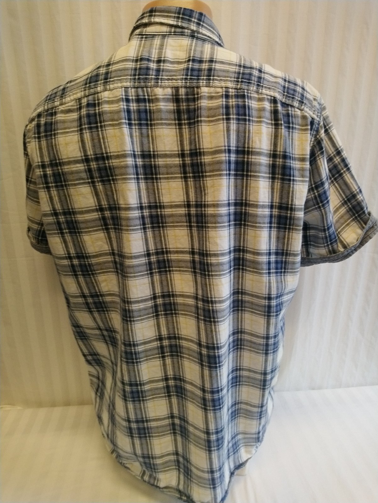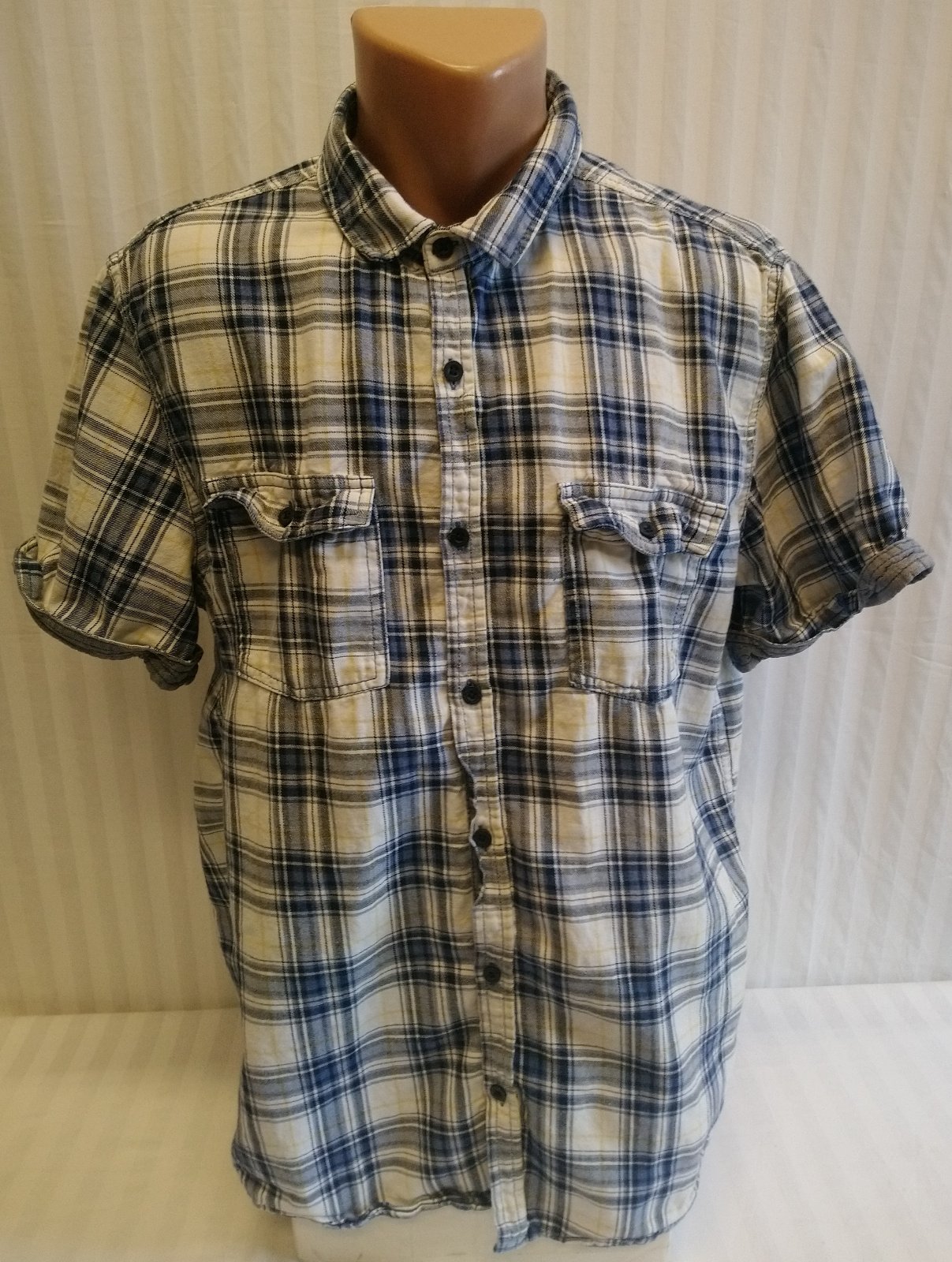 pánska farebná károvaná košeľa, modro bielo žltá, zapínanie na gombíky, náprsné vrecká,